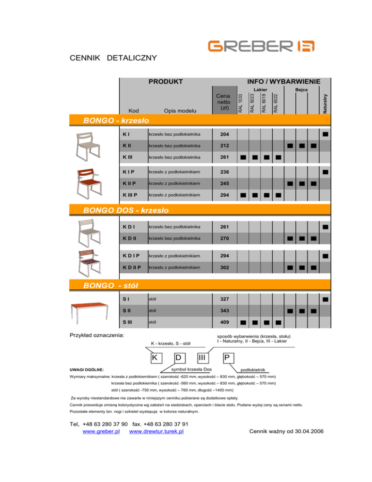 CENNIK DETALICZNY INFO / WYBARWIENIE Bejca RAL 6022 RAL 6018 Opis modelu RAL 5023 Kod RAL 1033 Lakier Cena netto (zł) Naturalny PRODUKT BONGO - krzesło KI krzesło bez podłokietnika 204 K II krzesło bez podłokietnika 212 K III krzesło bez podłokietnika 261 KIP krzesło z podłokietnikiem 236 K II P krzesło z podłokietnikiem 245 K III P krzesło z podłokietnikiem 294 BONGO DOS - krzesło KDI krzesło bez podłokietnika 261 K D II krzesło bez podłokietnika 270 KDIP krzesło z podłokietnikiem 294 K D II P krzesło z podłokietnikiem 302 SI stół 327 S II stół 343 S III stół 409 BONGO - stół Przykład oznaczenia: sposób wybarwienia (krzesła, stołu) I - Naturalny, II - Bejca, III - Lakier K - krzesło, S - stół K UWAGI OGÓLNE: D III P symbol krzesła Dos podłokietnik Wymiary maksymalne: krzesła z podłokiernikiem ( szerokość -620 mm, wysokość – 830 mm, głębokość – 570 mm) krzesła bez podłokiernika ( szerokość -560 mm, wysokość – 830 mm, głębokość – 570 mm) stół ( szerokość -750 mm, wysokość – 760 mm, długość –1400 mm) Za wyroby niestandardowe nie zawarte w niniejszym cenniku pobierane są dodatkowe opłaty. Cennik przewiduje zmianę kolorystyczna wg założeń na siedziskach, oparciach i blacie stołu. Podane wyżej ceny są cenami netto. Pozostałe elementy tzn. nogi i szkielet wystepuja w kolorze naturalnym. Tel, +48 63 280 37 90 fax. +48 63 280 37 91 www.greber.pl www.drewtur.turek.pl Cennik ważny od 30.04.2006
