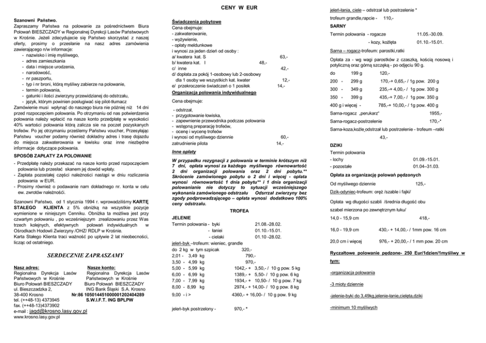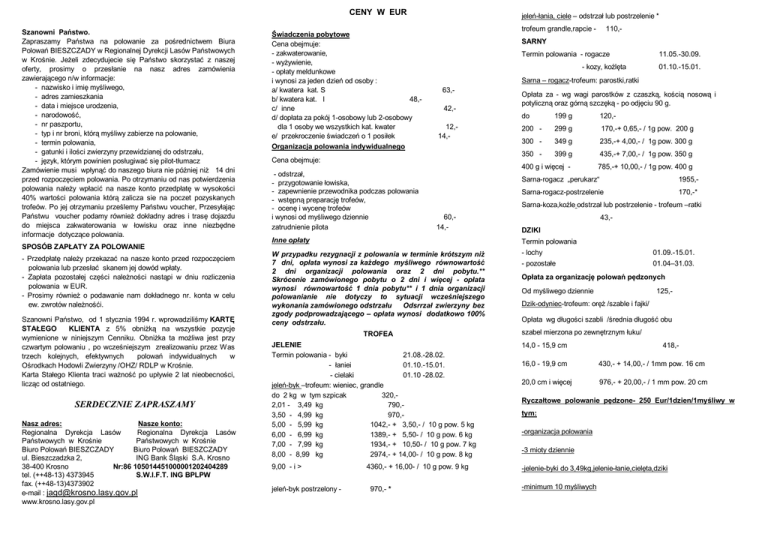 CENY W EUR Szanowni Państwo. Zapraszamy Państwa na polowanie za pośrednictwem Biura Polowań BIESZCZADY w Regionalnej Dyrekcji Lasów Państwowych w Krośnie. Jeżeli zdecydujecie się Państwo skorzystać z naszej oferty, prosimy o przesłanie na nasz adres zamówienia zawierającego n/w informacje: - nazwisko i imię myśliwego, - adres zamieszkania - data i miejsce urodzenia, - narodowość, - nr paszportu, - typ i nr broni, którą myśliwy zabierze na polowanie, - termin polowania, - gatunki i ilości zwierzyny przewidzianej do odstrzału, - język, którym powinien posługiwać się pilot-tłumacz Zamówienie musi wpłynąć do naszego biura nie później niż 14 dni przed rozpoczęciem polowania. Po otrzymaniu od nas potwierdzenia polowania należy wpłacić na nasze konto przedpłatę w wysokości 40% wartości polowania którą zalicza sie na poczet pozyskanych trofeów. Po jej otrzymaniu prześlemy Państwu voucher, Przesyłając Państwu voucher podamy również dokładny adres i trasę dojazdu do miejsca zakwaterowania w łowisku oraz inne niezbędne informacje dotyczące polowania. SPOSÓB ZAPŁATY ZA POLOWANIE - Przedpłatę należy przekazać na nasze konto przed rozpoczęciem polowania lub przesłać skanem jej dowód wpłaty. - Zapłata pozostałej części należności nastąpi w dniu rozliczenia polowania w EUR. - Prosimy również o podawanie nam dokładnego nr. konta w celu ew. zwrotów należnośći. Szanowni Państwo, od 1 stycznia 1994 r. wprowadziliśmy KARTĘ STAŁEGO KLIENTA z 5% obniżką na wszystkie pozycje wymienione w niniejszym Cenniku. Obniżka ta możliwa jest przy czwartym polowaniu , po wcześniejszym zrealizowaniu przez Was trzech kolejnych, efektywnych polowań indywidualnych w Ośrodkach Hodowli Zwierzyny /OHZ/ RDLP w Krośnie. Karta Stałego Klienta traci ważność po upływie 2 lat nieobecności, licząc od ostatniego. SERDECZNIE ZAPRASZAMY Nasz adres: Nasze konto: Regionalna Dyrekcja Lasów Regionalna Dyrekcja Lasów Państwowych w Krośnie Państwowych w Krośnie Biuro Polowań BIESZCZADY Biuro Polowań BIESZCZADY ul. Bieszczadzka 2, ING Bank Śląski S.A. Krosno 38-400 Krosno Nr:86 105014451000001202404289 tel. (++48-13) 4373945 S.W.I.F.T. ING BPLPW fax. (++48-13)4373902 e-mail : [email protected] www.krosno.lasy.gov.pl Świadczenia pobytowe Cena obejmuje: - zakwaterowanie, - wyżywienie, - opłaty meldunkowe i wynosi za jeden dzień od osoby : a/ kwatera kat. S b/ kwatera kat. I 48,c/ inne d/ dopłata za pokój 1-osobowy lub 2-osobowy dla 1 osoby we wszystkich kat. kwater e/ przekroczenie świadczeń o 1 posiłek Organizacja polowania indywidualnego jeleń-łania, ciele – odstrzał lub postrzelenie * trofeum grandle,rapcie SARNY Termin polowania - rogacze - kozy, koźlęta 11.05.-30.09. 01.10.-15.01. Sarna – rogacz-trofeum: parostki,ratki 63,42,12,14,- Cena obejmuje: - odstrzał, - przygotowanie łowiska, - zapewnienie przewodnika podczas polowania - wstępną preparację trofeów, - ocenę i wycenę trofeów i wynosi od myśliwego dziennie zatrudnienie pilota 110,- Opłata za - wg wagi parostków z czaszką, kością nosową i potyliczną oraz górną szczęką - po odjęciu 90 g. do 199 g 120,- 200 - 299 g 170,-+ 0,65,- / 1g pow. 200 g 300 - 349 g 235,-+ 4,00,- / 1g pow. 300 g 350 - 399 g 435,-+ 7,00,- / 1g pow. 350 g 400 g i więcej - 785,-+ 10,00,- / 1g pow. 400 g Sarna-rogacz „perukarz“ 1955,- Sarna-rogacz-postrzelenie 170,-* Sarna-koza,koźle odstrzał lub postrzelenie - trofeum –ratki 60,14,- 43,DZIKI Inne opłaty Termin polowania W przypadku rezygnacji z polowania w terminie krótszym niż 7 dni, opłata wynosi za każdego myśliwego równowartość 2 dni organizacji polowania oraz 2 dni pobytu.** Skrócenie zamówionego pobytu o 2 dni i więcej - opłata wynosi równowartość 1 dnia pobytu** i 1 dnia organizacji polowanianie nie dotyczy to sytuacji wcześniejszego wykonania zamówionego odstrzału Odsrrzał zwierzyny bez zgody podprowadzającego – opłata wynosi dodatkowo 100% ceny odstrzału. - lochy 01.09.-15.01. - pozostałe 01.04–31.03. TROFEA Opłata za organizację polowań pędzonych Od myśliwego dziennie 125,- Dzik-odyniec-trofeum: oręż /szable i fajki/ Opłata wg długości szabli /średnia długość obu szabel mierzona po zewnętrznym łuku/ JELENIE Termin polowania - byki 21.08.-28.02. - łaniei 01.10.-15.01. - cielaki 01.10 -28.02. jeleń-byk –trofeum: wieniec, grandle do 2 kg w tym szpicak 320,2,01 - 3,49 kg 790,3,50 - 4,99 kg 970,5,00 - 5,99 kg 1042,- + 3,50,- / 10 g pow. 5 kg 6,00 - 6,99 kg 1389,- + 5,50- / 10 g pow. 6 kg 7,00 - 7,99 kg 1934,- + 10,50- / 10 g pow. 7 kg 8,00 - 8,99 kg 2974,- + 14,00- / 10 g pow. 8 kg 14,0 - 15,9 cm 9,00 - i > -jelenie-byki do 3,49kg,jelenie-łanie,cielęta,dziki jeleń-byk postrzelony - 4360,- + 16,00- / 10 g pow. 9 kg 970,- * 418,- 16,0 - 19,9 cm 430,- + 14,00,- / 1mm pow. 16 cm 20,0 cm i więcej 976,- + 20,00,- / 1 mm pow. 20 cm Ryczałtowe polowanie pędzone- 250 Eur/1dzien/1myśliwy w tym: -organizacja polowania -3 mioty dziennie -minimum 10 myśliwych TRANSPORT Zapewniamy transport myśliwych z portów lotniczych do łowisk wg cen ryczałtowych: Regionalna Dyrekcja Lasów Państwowych w Krośnie Dzik-trofeum oręż/szable,fajki,rapcie/ o długości oręża do 13,9 cm/ z Krakowa - port lotniczy - łowisko - łowisko - port lotniczy 210,210,- z Katowic - port lotniczy - łowisko - łowisko - port lotniczy 235,235,- z Warszawy - port lotniczy - łowisko - łowisko - port lotniczy 270,270,- BIURO POLOWAŃ BIESZCZADY Opłata wg wagi tuszy po wypatroszeniu do 29,99 kg 38,- 30,00 - 59,99 kg 95,- 60,00 - 79,99 kg 189,- 80 kg i więcej 275,- dzik postrzelony 130,- * ZWIERZYNA DROBNA-trofeum skóra z Rzeszowa bezpłatny LISY -port lotniczy-łowisko USŁUGI TRANSPORTOWE Wynajem pojazdu mechanicznego - za każdy przejechany kilometr -łowisko-port lotniczy 170,- 0,70,- UWAGA ZAKUP TUSZY LUB SKÓRY – - tusza jeleni i dzików w skórze i bez skóry, za 1 kg - tusza sar