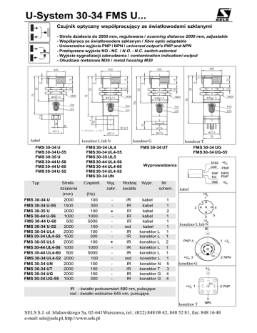 U-System 30-34 FMS U... Czujnik optyczny wspó³pracuj¹cy ze wiat³owodami szklanymi - Strefa dzia³ania do 2000 mm, regulowana / scanning distance 2000 mm, adjustable - Wspó³praca ze wiat³owodem szklanym / fibre optic adaptable - Uniwersalne wyjcie PNP i NPN / universal output's PNP and NPN - Prze³¹czane wyjcie NO - NC / N.O. - N.C. switch-selected - Wyjcie sygnalizacji zabrudzenia / contamination indication/-output - Obudowa metalowa M30 / metal housing M30 kabel FMS 30-34 U FMS 30-34 U-55 FMS 30-35 U FMS 30-44 U-56 FMS 30-44 U-60 FMS 30-34 U-52 Typ konektor G konektor L lub N FMS 30-34 UL4 FMS 30-34 UL4-55 FMS 30-35 UL5 FMS 30-44 UL4-56 FMS 30-44 UL4-60 FMS 30-34 UL4-52 FMS 30-34 UN Strefa dzia³ania (mm) FMS 30-34 U 2000 FMS 30-34 U-55 1500 FMS 30-35 U 2000 FMS 30-44 U-56 1000 FMS 30-44 U-60 500 FMS 30-34 U-52 2000 FMS 30-34 UL4 2000 FMS 30-34 UL4-55 1500 FMS 30-35 UL5 2000 FMS 30-44 UL4-56 1000 FMS 30-44 UL4-60 500 FMS 30-34 UL4-52 2000 2000 FMS 30-34 UN FMS 30-34 UT 2000 FMS 30-34 UG 2000 FMS 30-34 UG-55 1500 Czêstotl. (Hz) 100 300 100 1000 5000 100 100 300 100 1000 5000 100 100 100 100 300 Wyj. zabr. - konektor T FMS 30-34 UT FMS 30-34 UG FMS 30-34 UG-55 br¹z +UB czar P N P Wyprowadzenia bia³/ N P N fiol P N P Rodzaj wiat³a IR IR IR IR IR red IR IR IR IR IR red IR IR IR IR Wypr. Nr schem. kabel kabel kabel kabel kabel kabel konektor L konektor L konektor L konektor L konektor L konektor L konektor N konektor T konektor G konektor G 1 1 2 1 1 1 1 1 2 1 1 1 5 3 4 4 nieb -UB kabel +UB 1 2 4 5 3 -UB konektor L lub N PE PNP 4 1 -UB M3 +UB 3 2 NPN konektor G -UB M3 IR - wiat³o podczerwieñ 880 nm, pulsuj¹ce red - wiat³o widzialne 645 nm, pulsuj¹ce +UB 1 konektor T 2 PNP 3 NPN SELS S.J. ul. Malawskiego 5a, 02-641Warszawa, tel.: (022) 848 08 42, 848 52 81, fax: 848 16 48 e-mail: [email protected], http://www.sels.pl U-System 30-34 FMS U ... Schematy wyprowadzeñ / wiring Br¹z 1 NPN Bia³ 2 PNP Czar 4 Nieb 3 FMS 30-34 U FMS 30-34 U-55 FMS 30-44 U-56 FMS 30-44 U-60 FMS 30-34 U-52 FMS 30-34 UL4 FMS 30-34 UL4-55 FMS 30-44 UL4-56 FMS 30-44 UL4-60 FMS 30-34 UL4-52 +UB -UB Rys. 1 / fig. 1 NPN PNP 3 2 4 1 Br¹z 1 PNP Czar 4 PNP Fiol 5 Nieb 3 +UB FMS 30-35 U FMS 30-35 UL5 -UB Rys. 2 / fig. 2 1 +UB FMS 30-34 UT NPN 3 PNP 2 +UB FMS 30-34 UG FMS 30-34 UG-55 -UB PE -UB Rys. 3 / fig. 3 Rys. 4 / fig. 4 1 NPN 4 PNP 2 +UB FMS 30-34 UN 3 Na czo³owej czêci czujnika umieszczone s¹ dwa prze³¹czniki umo¿liwiaj¹ce: Sn - wybór funkcji NO lub NC -UB N.O./N.C. function (inverting of the output signal) selectable by changing the Sn position of the slide 2 switch at the front end of the sensor. The slide switch "Sn/2" allows to increase the resolution of the scanning range. Rys. 5 / fig. 5 - skokowy wybór czu³oci ( Sn lub 1/2 Sn ) Parametry elektryczne / Electrical data (typ.) Parametry optyczne / Optical data (typ.) Napiêcie zasilania UB: operating voltage UB: Rodzaj wiat³a: used light: 10 ... 30 V DC 10 ... 30 V DC Pobór pr¹du bez obci¹¿enia (UB = 24 V): power consumption no load (UB = 24 V): Maksymalne têtnienia: residual ripple: 40 mA 40 mA 10 % nap. zasilania UB 10 % within UB czerwone 670 nm lub IR 880 nm, pulsuj¹ce IR 880 nm, pulsed Materia³ odniesienia: reference material: bia³y, 400 x 400 mm white, 400 x 400 mm Element regulacyjny: sensitivity adjustment: potencjometer 18-to obrotowy 18-turn-potentiometer Zabezpieczenie przed zmian¹ polaryzacji: tak polarity reversal protection: for operating voltage contacts Histereza: distance hysteresis: Opónienie po za³¹czeniu zasilania: standby delay: Norma dot. warunków optycznych: ambient light: < 300 ms < 300 ms Maksymalny pr¹d wyjciowy IL dla wyj. NO/NC: max. output current IL: 200 mA 200 mA 10 % ustawionej strefy dzia³ania 10 % from adjusted scanning range EN 60947-5-2 EN 60947-5-2 Rozbie¿noæ wi¹zki wietlnej: beam angle: < 18° < 18° Maksymalny pr¹d wyjciowy IL dla wyj. zabrudzenia: 200 mA contamination output: 200 mA Parametry mechaniczne / Mechanical data Regulacja strefy dzia³ania: pull up resistor: Materia³: casing material: rezystor wieloobrotowy 22 kOhm 22 kOhm mosi¹dz niklowany brass, nickel plated Dopuszczalny spadek nap. syg. wyj: < 2,4 V przy IL = 200 mA voltage drop at signal output: < 2,4 V at IL = 200 mA Stopieñ ochrony (z filtrem polaryz. lub wiat³owodem): protection standard (with polarized filter or fibre optic): Zabezpieczenie krótkotrwa³ego przeci¹¿enia: short circuit protection: Temperatura pracy: ambient temperature range: -20 ... +60 °C -20 ... +60 °C Temperatura przechowywania: storage temperature range: -40 ... +80 °C -40 ... +80 °C cieplne thermal Maksymalna d³ugoæ kabla: max. permitted cable length: 100 m 100 m dioda LED zielona LED green Sygnalizacja zasilania: operating voltage indicator: Sygnalizacja stanu wyjcia NO/NC: output signal indicator: dioda LED ¿ó³ta LED yellow Wytrzyma³oæ na wstrz¹sy: shock resistance: Kabel standardowy: standard cable: IP65 IP65 EN 60947-5-2 EN 60947-5-2 4 x 0,25 mm 2, d³ug.3 m, PUR 4 x 0,25 mm2, 3 m, PUR Sygnalizacja stanu wyjcia zabrudzenia: dioda LED czerwona contamination indicator: LED red Klasa bezpieczeñstwa: protection class: 1) 1) 1) Przy napiêciu 50 V DC rated voltage 50 V DC Powy¿szy czujnik nie mo¿e byæ stosowany do w aplikacjach bezpieczeñstwa lub podobnych. These Proximity Switches are not suited for safety related applications. SELS S.J. ul. Malawskiego 5a, 02-641Warszawa, tel.: (022) 848 08 42, 848 52 81, fax: 848 16 48 e-mail: [email protected], http://www.sels.pl