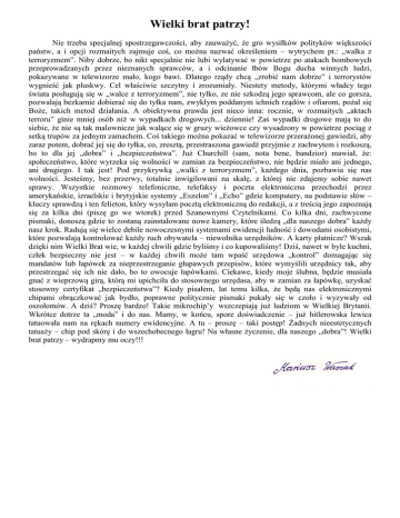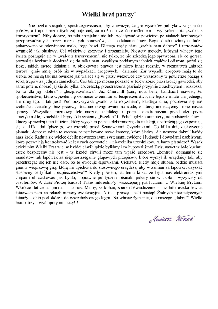 Wielki brat patrzy! Nie trzeba specjalnej spostrzegawczości, aby zauważyć, że gro wysiłków polityków większości państw, a i opcji rozmaitych zajmuje coś, co można nazwać określeniem – wytrychem pt.: „walka z terroryzmem”. Niby dobrze, bo nikt specjalnie nie lubi wylatywać w powietrze po atakach bombowych przeprowadzanych przez nieznanych sprawców, a i odcinanie łbów Bogu ducha winnych ludzi, pokazywane w telewizorze mało, kogo bawi. Dlatego rządy chcą „zrobić nam dobrze” i terrorystów wygnieść jak pluskwy. Cel właściwie szczytny i zrozumiały. Niestety metody, którymi władcy tego świata posługują się w „walce z terroryzmem”, nie tylko, ze nie szkodzą jego sprawcom, ale co gorsza, pozwalają bezkarnie dobierać się do tyłka nam, zwykłym poddanym ichnich rządów i ofiarom, pożal się Boże, takich metod działania. A obiektywna prawda jest nieco inna: rocznie, w rozmaitych „aktach terroru” ginie mniej osób niż w wypadkach drogowych... dziennie! Zaś wypadki drogowe mają to do siebie, że nie są tak malownicze jak walące się w gruzy wieżowce czy wysadzony w powietrze pociąg z setką trupów za jednym zamachem. Coś takiego można pokazać w telewizorze przerażonej gawiedzi, aby zaraz potem, dobrać jej się do tyłka, co, zresztą, przestraszona gawiedź przyjmie z zachwytem i rozkoszą, bo to dla jej „dobra” i „bezpieczeństwa”. Już Churchill (sam, nota bene, bandzior) mawiał, że: społeczeństwo, które wyrzeka się wolności w zamian za bezpieczeństwo, nie będzie miało ani jednego, ani drugiego. I tak jest! Pod przykrywką „walki z terroryzmem”, każdego dnia, pozbawia się nas wolności. Jesteśmy, bez przerwy, totalnie inwigilowani na skalę, z której nie zdajemy sobie nawet sprawy. Wszystkie rozmowy telefoniczne, telefaksy i poczta elektroniczna przechodzi przez amerykańskie, izraelskie i brytyjskie systemy „Eszelon” i „Echo” gdzie komputery, na podstawie słów – kluczy sprawdzą i ten felieton, który wysyłam pocztą elektroniczną do redakcji, a z treścią jego zapoznają się za kilka dni (piszę go we wtorek) przed Szanownymi Czytelnikami. Co kilka dni, zachwycone pismaki, donoszą gdzie to zostaną zainstalowane nowe kamery, które śledzą „dla naszego dobra” każdy nasz krok. Radują się wielce debile nowoczesnymi systemami ewidencji ludność i dowodami osobistymi, które pozwalają kontrolować każdy ruch obywatela – niewolnika urzędników. A karty płatnicze? Wszak dzięki nim Wielki Brat wie, w każdej chwili gdzie byliśmy i co kupowaliśmy! Dziś, nawet w byle kuchni, człek bezpieczny nie jest – w każdej chwili może tam wpaść urzędowa „kontrol” domagając się mandatów lub łapówek za nieprzestrzeganie głupawych przepisów, które wymyślili urzędnicy tak, aby przestrzegać się ich nie dało, bo to owocuje łapówkami. Ciekawe, kiedy moje ślubna, będzie musiała gnać z wieprzową girą, którą mi upichciła do stosownego urzędasa, aby w zamian za łapówkę, uzyskać stosowny certyfikat „bezpieczeństwa”? Kiedy pisałem, lat temu kilka, że będą nas elektronicznymi chipami obrączkować jak bydło, poprawne politycznie pismaki pukały się w czoło i wyzywały od oszołomów. A dziś? Proszę bardzo! Takie mikrochip’y wszczepiają już ludziom w Wielkiej Brytanii. Wkrótce dotrze ta „moda” i do nas. Mamy, w końcu, spore doświadczenie – już hitlerowska lewica tatuowała nam na rękach numery ewidencyjne. A tu – proszę – taki postęp! Żadnych nieestetycznych tatuaży – chip pod skórę i do wszechobecnego łagru! Na własne życzenie, dla naszego „dobra”! Wielki brat patrzy – wydrapmy mu oczy!!!