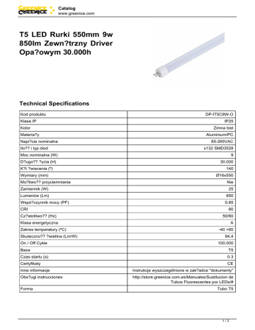 Catalog www.greenice.com T5 LED Rurki 550mm 9w 850lm Zewn?trzny Driver Opa?owym 30.000h Technical Specifications Kod produktu Klasa IP Kolor Materia?y Napi?cie nominalne Ilo?? i typ diod DP-IT5C8W-O IP25 Zimna biel Aluminium/PC 85-265VAC x132 SMD3528 Moc nominalna (W) D?ugo?? ?ycia (H) K?t ?wiecenia (º) Wymiary (mm) Mo?liwo?? przyciemniania 9 30.000 140 Ø16x550 Nie Zamiennik (W) 25 Lumenów (Lm) 850 Wspó?czynnik mocy (PF) 0.85 CRI Cz?stotliwo?? (Hz) 80 50/60 Klasa energetyczna Zakres temperatury (ºC) Skuteczno?? ?wietlna (Lm/W) On / Off Cykle A -40 +60 94,4 100.000 Baza T5 Czas startu (s) 0.3 Certyfikaty CE Inne informacje Instrukcje wyszczególnione w zak?adce "dokumenty" Obs?ugi instrucciones http://store.greenice.com.es/Manuales/Sustitucion de Tubos Fluorescentes por LEDs/# Forma Tubo T5 1/3 Catalog www.greenice.com 2/3 Catalog www.greenice.com Description Nasz T5 LED Rury ze sterownikiem zewn?trznym produkowane s? z cia?a sztywnego aluminium, dyfuzor poliw?glanu i SMD3528 chipów LED. Sk?adniki te zapewniaj? sztywno??, dobre odprowadzanie ciep?a i d?ug? ?ywotno??. Zalety lamp LED: Ponad 50% oszcz?dno?ci energii w porównaniu z tradycyjnymi lamp fluorescencyjnych. Nale?y podkre?li?, ?e lampy fluoroscencyjne wymaga balastu, który zu?ywa od 3 do 8W na rurze. Oszcz?dno?ci na utrzymanie, jako tuby LED nie wymaga balastu lub rozrusznik. Szacowana ?ywotno?? lamp LED wynosi 30.000 godzin przed 10,000 do lamp fluorescencyjnych. Rury LED s? bardzo odporne na wstrz?sy i uderzenia. Ponadto, mog? by? one demontowane na naprawy. Rurka LED rozpoczyna si? natychmiast, a liczba startów nie wp?ywa na jego ?ywotno??. Rury LED s? ekologiczne, poniewa? nie zawieraj? ?adnych szkodliwych gazów rt?ciowe, podobnie jak rur fluorescencyjnych. 3/3 Powered by TCPDF (www.tcpdf.org)