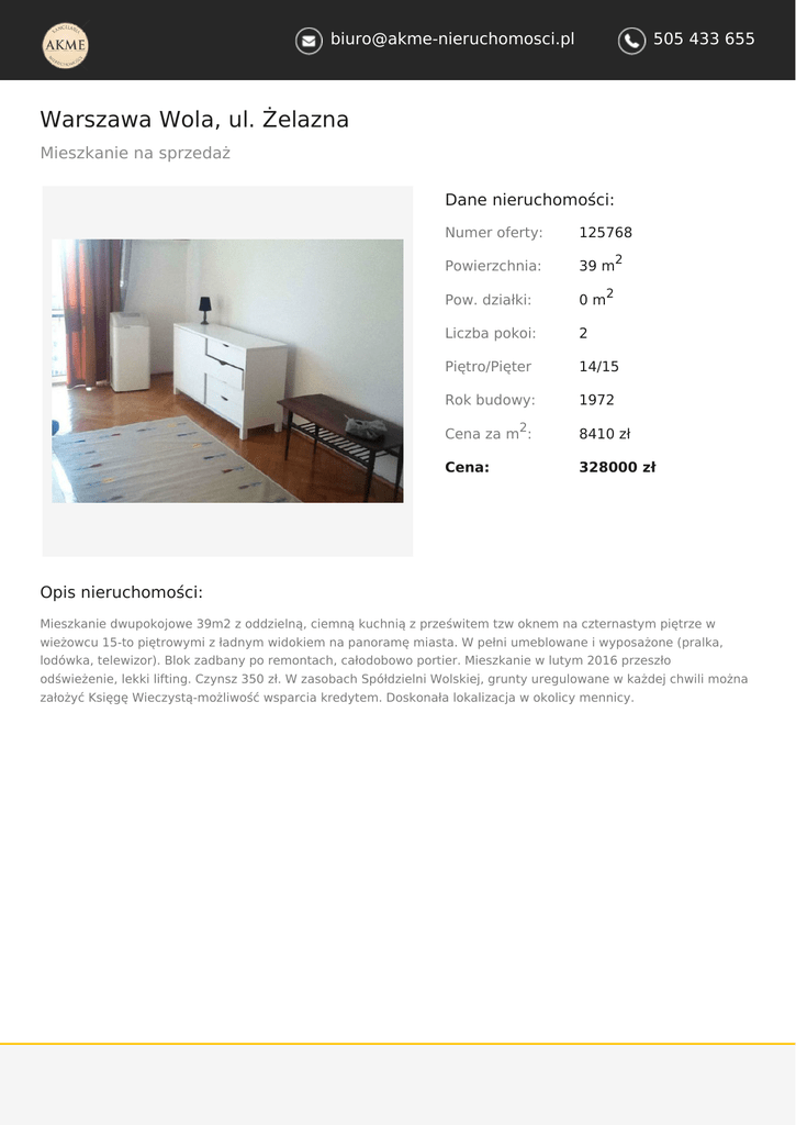[email protected] 505 433 655 Warszawa Wola, ul. Żelazna Mieszkanie na sprzedaż Dane nieruchomości: Numer oferty: 125768 Powierzchnia: 39 m Pow. działki: 0m Liczba pokoi: 2 Piętro/Pięter 14/15 Rok budowy: 1972 2 2 2 Cena za m : 8410 zł Cena: 328000 zł Opis nieruchomości: Mieszkanie dwupokojowe 39m2 z oddzielną, ciemną kuchnią z prześwitem tzw oknem na czternastym piętrze w wieżowcu 15-to piętrowymi z ładnym widokiem na panoramę miasta. W pełni umeblowane i wyposażone (pralka, lodówka, telewizor). Blok zadbany po remontach, całodobowo portier. Mieszkanie w lutym 2016 przeszło odświeżenie, lekki lifting. Czynsz 350 zł. W zasobach Spółdzielni Wolskiej, grunty uregulowane w każdej chwili można założyć Księgę Wieczystą-możliwość wsparcia kredytem. Doskonała lokalizacja w okolicy mennicy. [email protected] 505 433 655