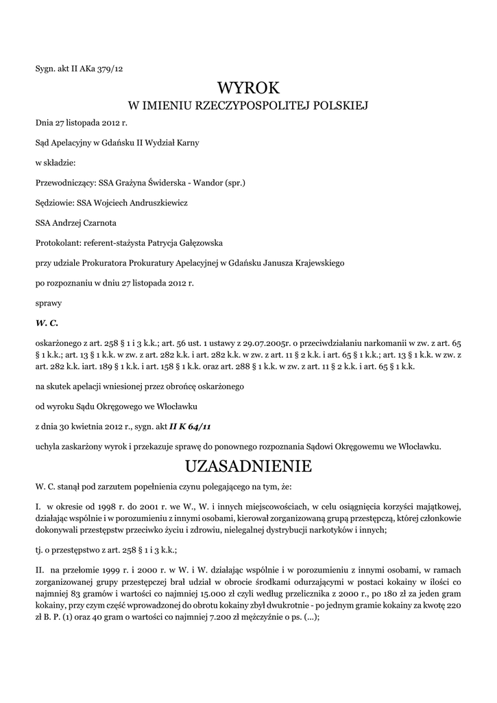 Sygn. akt II AKa 379/12 WYROK W IMIENIU RZECZYPOSPOLITEJ POLSKIEJ Dnia 27 listopada 2012 r. Sąd Apelacyjny w Gdańsku II Wydział Karny w składzie: Przewodniczący: SSA Grażyna Świderska - Wandor (spr.) Sędziowie: SSA Wojciech Andruszkiewicz SSA Andrzej Czarnota Protokolant: referent-stażysta Patrycja Gałęzowska przy udziale Prokuratora Prokuratury Apelacyjnej w Gdańsku Janusza Krajewskiego po rozpoznaniu w dniu 27 listopada 2012 r. sprawy W. C. oskarżonego z art. 258 § 1 i 3 k.k.; art. 56 ust. 1 ustawy z 29.07.2005r. o przeciwdziałaniu narkomanii w zw. z art. 65 § 1 k.k.; art. 13 § 1 k.k. w zw. z art. 282 k.k. i art. 282 k.k. w zw. z art. 11 § 2 k.k. i art. 65 § 1 k.k.; art. 13 § 1 k.k. w zw. z art. 282 k.k. iart. 189 § 1 k.k. i art. 158 § 1 k.k. oraz art. 288 § 1 k.k. w zw. z art. 11 § 2 k.k. i art. 65 § 1 k.k. na skutek apelacji wniesionej przez obrońcę oskarżonego od wyroku Sądu Okręgowego we Włocławku z dnia 30 kwietnia 2012 r., sygn. akt II K 64/11 uchyla zaskarżony wyrok i przekazuje sprawę do ponownego rozpoznania Sądowi Okręgowemu we Włocławku. UZASADNIENIE W. C. stanął pod zarzutem popełnienia czynu polegającego na tym, że: I. w okresie od 1998 r. do 2001 r. we W., W. i innych miejscowościach, w celu osiągnięcia korzyści majątkowej, działając wspólnie i w porozumieniu z innymi osobami, kierował zorganizowaną grupą przestępczą, której członkowie dokonywali przestępstw przeciwko życiu i zdrowiu, nielegalnej dystrybucji narkotyków i innych; tj. o przestępstwo z art. 258 § 1 i 3 k.k.; II. na przełomie 1999 r. i 2000 r. w W. i W. działając wspólnie i w porozumieniu z innymi osobami, w ramach zorganizowanej grupy przestępczej brał udział w obrocie środkami odurzającymi w postaci kokainy w ilości co najmniej 83 gramów i wartości co najmniej 15.000 zł czyli według przelicznika z 2000 r., po 180 zł za jeden gram kokainy, przy czym część wprowadzonej do obrotu kokainy zbył dwukrotnie - po jednym gramie kokainy za kwotę 220 zł B. P. (1) oraz 40 gram o wartości co najmniej 7.200 zł mężczyźnie o ps. (...); tj. o przestępstwo z art. 56 ust. 1 Ustawy z dnia 29 lipca 2005 r. o przeciwdziałaniu narkomanii w zw. z art. 65 § 1 k.k.; III. na przełomie 1999 r. i 2000 r. w L. działając wspólnie i w porozumieniu z innymi osobami w ramach zorganizowanej grupy przestępczej, działając w celu osiągnięcia korzyści majątkowej usiłował dokonać wymuszenia kwoty 15.000 zł od B. P. (1), ale wymuszenia nie zrealizowano z uwagi na postawę pokrzywdzonego, a nadto dokonywał wymuszenia samochodu marki „P. (...) wartości co najmniej 15.000 zł oraz kwoty 2.000 USD, która to kwota według średniego kursu NBP z dnia 31 grudnia 2000 r. stanowi kwotę 8.247,20 zł, na szkodę w/wym.; tj. o przestępstwo z art. 13 § 1 k.k. w zw. z art. 282 k.k. i art. 282 k.k. w zw. z art. 11 § 2 k.k. i art. 65 § 1 k.k.; IV. w lutym 2001 r. we W. działając wspólnie i w porozumieniu z innymi osobami kierując zorganizowaną grupa przestępczą w celu osiągnięcia korzyści majątkowej usiłował dokonać wymuszenia kwoty co najmniej 10.000 złod W. S. z tytułu rzekomego jego udziału we włamaniu do lombardu przy ul. (...) w ten sposób, że po uprzednim uprowadzeniu i pozbawieniu wolności wymienionego na terenie magazynu nieczynnych zakładów przy ul. (...) dokonał jego pobicia pięściami po całym ciele oraz przy użyciu metalowej kłódki, powodując u pokrzywdzonego obrażenia ciała w postaci złamania dwóch żeber, wybicia dwóch zębów, urazu głowy w okolicy potylicznej, ogólnych potłuczeń i zasinień, co skutkowało rozstrojem zdrowia na okres poniżej 7 dni, ponadto zniszczył wymienionemu telefon komórkowy marki (...) o wartości około 700 zł oraz okulary korekcyjne o wartości około 1000 zł; tj. o przestępstwo z art. 13 § 1 k.k. w zw. z art. 282 k.k. i art. 189 § 1 k.k. i art. 158 § 1 k.k. oraz art. 288 § 1 k.k. w zw. z art. 11 § 2 k.k. i art. 65 § 1 k.k.; Wyrokiem Sądu Okręgowego we Włocławku z dnia 30 kwietnia 2012 roku, sygn. akt II K 64/11oskarżonego W. B. uznano : I. za winnego popełnienia czynu zarzucanego mu w pkt. I a/o, tj. występku z art. 258 § 1 i 3 k.k. i za ten czyn na podstawie art. 258 § 3 k.k. wymierzono mu karę roku pozbawienia wolności; II. za winnego tego, że na przełomie 1999 r. i 2000 r. we W., działając wspólnie i w porozumieniu z innymi osobami w ramach zorganizowanej grupy przestępczej, brał udział w obrocie środkiem odurzającym w postaci kokainy w ilości 40 g wartości 7200 zł, tj. po 180 zł za gram, którą zbył mężczyźnie o ps. (...) na terenie restauracji (...), tj. występku z art. 56 ust. 1 ustawy z dnia 29.07.2005 r. w zw. z art. 65 § 1 k.k. i za ten czyn na podstawie tychże przepisów wymierzono mu karę roku pozbawienia wolności i grzywnę w rozmiarze 50 stawek dziennych po 150 zł każda; III. za winnego tego, że nie wcześniej niż w styczniu 1995 r. i nie później niż w końcu lipca 1996 r. we W. w celu osiągnięcia korzyści majątkowej udzielił B. P. (1) nie mniej niż 2 g kokainy po 220 zł za gram, tj. występku z art. 59 ust. 1 ustawy z dnia 29.07.2005 r. o przeciwdziałaniu narkomanii i za ten czyn na podstawie tegoż przepisu wymierzono mu karę roku pozbawienia wolności; IV. za winnego popełnienia czynu zarzucanego mu w pkt. III a/o, tj. występku z art. 13 § 1 k.k. w zw. z art. 282 k.k. i art. 282 k.k. w zw. z art. 65 § 1 k.k. i za ten czyn na podstawie art. 282 k.k. w zw. z art. 65 § 1 k.k. wymierzono mu karę roku i 2 miesięcy pozbawienia wolności; V. za winnego popełnienia czynu zarzucanego mu w pkt. IV a/o z tym ustaleniem, że nie działał w celu osiągnięcia korzyści majątkowej i nie usiłował dokonać wymuszenia kwoty co najmniej 10.000 zł, a celem pozbawienia wolności i pobicia W. S. było zmuszenie go do przyznania się do udziału w kradzieży z włamaniem do lombardu przy ul. (...) we
