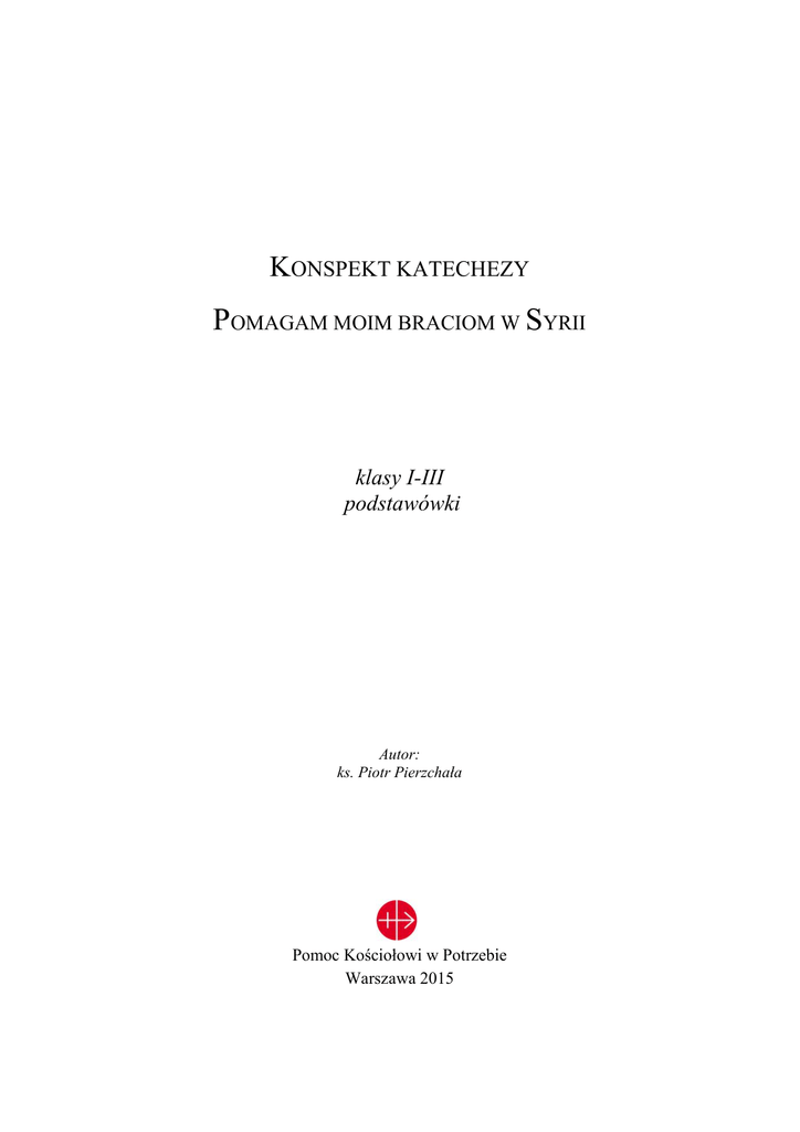 KONSPEKT KATECHEZY POMAGAM MOIM BRACIOM W SYRII klasy I-III podstawówki Autor: ks. Piotr Pierzchała Pomoc Kościołowi w Potrzebie Warszawa 2015 Kontekst egzystencjalny bądź treściowy, do którego nawiązujemy: Lekcja jest związana z przeżywanym w kościele, 8 listopada 2015 roku, VII Dniem Solidarności z Kościołem Prześladowanym. Ma uwrażliwić dzieci na to, że gdzieś na świecie żyją ich rówieśnicy, którzy cierpią z powodu prześladowań. Cele katechetyczne-wymagania ogólne: Uwrażliwienie dzieci na cierpienia wynikające z prześladowań Kościoła. Ukazanie sytuacji dzieci żyjących w Syrii. Wprowadzenie uczniów w tematykę VII Dnia Solidarności z Kościołem Prześladowanym. Treści nauczania-wymagania szczegółowe: Uczeń po lekcji własnymi słowami opowiada historię Kasi i Chemmi. Po wysłuchaniu opowiadania ocenia postępowanie Kasi. Po wysłuchaniu opowiadania mówi o marzeniach Chemmi. Po lekcji uczeń wymienia problemy z jakim borykają się dzieci w Syrii. Po zajęciach uczeń wymienia różne formy pomocy dzieciom w krajach prześladowanych. Po pracy na lekcji a także po uzgodnieniu z rodzicami podejmuje niektóre z nich. Po przeczytaniu tekstu z Pisma Świętego Mt 25,40 wyjaśnia, co oznaczają słowa: wszystko co uczyniliście jednemu z tych moich braci najmniejszych, mnieście uczynili. Po lekcji uczeń podejmuje modlitwę w intencji Kościoła prześladowanego. Metody: Piosenka, Opowiadanie, Pogadanka, Rozmowa kierowana, Dialog, Kalambury, Czytanie Słowa Bożego, Organizacyjne formy pracy uczniów: Zbiorowa Indywidualna Środki i pomoce dydaktyczne: Tablica, kreda, zeszyt ucznia, kredki, długopis Pismo Święte, Plakat informujący o Dniu solidarności, Teksty piosenki, Opowiadanie o Kasi i Chemmi, Zapisane na kartkach słowa: SOLIDARNOŚĆ, PRZEŚLADOWANIE Wydruki notatki Literatura: Można zajrzeć na stronę http://www.pkwp.org Zdania do zapisania: W Klasie I należy dać wydrukowany tekst notatki poprosić o wklejenie do zeszytu. W klasie II i III zapisujemy notatkę na tablicy a uczniowie wpisują ją do zeszytów. Notatka: Pan Jezus chce byśmy dobrze postępowali. Dziś zaprasza nas do tego byśmy pomagali cierpiącym braciom z Syrii. Pan Jezus zapewnia nas: „Wszystko, co uczyniliście jednemu z tych braci moich najmniejszych, mnieście uczynili”. Treści i zadania metodyczno-dydaktyczne Pomoce dydaktyczne Czas Część wstępna. Nauczyciel wraz z uczniami wchodzą do klasy. Następuje sprawdzenie listy obecności. - Dziennik. 4 minuty Modlitwa Po czynnościach organizacyjnych nauczyciel prosi by dzieci powstały i zaprasza je do modlitwy. Nauczyciel pyta dzieci: W jakich intencjach chciałyby się pomodlić? Nauczyciel na koniec mówi, także że dziś pomodlimy się za dzieci, które są, tak jak my uczniami Pana Jezusa a mieszkają w Syrii. Zachęcamy dzieci do szczególnej modlitwy za ich rówieśników z tego kraju. Wspólnie z dziećmi śpiewamy piosenkę: Gdy idziemy poprzez świat… (wykonujemy zwłaszcza trzecią zwrotkę) - Tekst piosenki, Załącznik 1. 4 minuty Wprowadzenie w temat zajęć Nauczyciel nawiązuje w rozmowie do tekstu piosenki, którą przed chwilą z uczniami się modliliśmy. Nauczyciel stawia uczniom Pytania: Z jakiego powodu jest nam smutno? Kiedy w naszym życiu jest czas cierpienia, o którym śpiewaliśmy w piosence? W jakich sytuacjach nas wszystko złości? Co wtedy powinniśmy robić? Nauczyciel w rozmowie z dziećmi nawiązuje do tego o czym będziemy mówić na dzisiejszej lekcji. Mówi, że są na świecie takie dzieci, którym jest bardzo ciężko ponieważ nie mają tak dobrze jak my. Nie mogą swobodnie mówić o panu Jezusie tak jak my i nie mogą chwalić Pana Boga tak jak my. Nauczyciel wyjaśnia, iż na początku lekcji modliliśmy się za dzieci z Syrii a to wszystko za sprawą tego, że w niedzielę - Plakat informujący o Dniu solidarności, - zapisane na kartkach słowa: SOLIDARNOŚĆ PRZEŚLADOWANIE - magnesy 7 minut Przebieg zajęć 9 listopada 2014 r. w naszych Kościołach będziemy przeżywać Dzień Solidarności z Kościołem Prześladowanym. Można powiesić na tablicy wydrukowany plakat. Należy wraz z uczniami wyjaśnić niezrozumiałe słowa: solidarność i prześladowania. Można zapisać te słowa na tablicy lub przyczepić za pomocą magnesów zapisane na kartkach. Wyjaśniamy uczniom, że dzień ten jest dniem naszej szczególnej modlitwy i pomocy dla naszych Braci, którzy tak jak my wierzą w Pana Jezusa, i właśnie za to są nielubiani przez innych złych ludzi. Nauczyciel podaje temat zajęć: Pomagam moim braciom z Syrii Historia małej Chemmi Zapoznajemy uczniów z historią Kasi i małej Chemmi, jej rówieśniczki pochodzącej z Syrii. Najlepiej opowiedzieć dzieciom tę historię własnymi słowami, korzystając z zapisu w załączniku. Następnie dla utrwalenia zadajemy pytania: Jakie kłopoty sprawiała Kasia swoim rodzicom? Jak czuli się wtedy jej rodzice? Na czym polegał u Kasi „duszek leniuszek”? Co zrobiła mama Kasi? Skąd pochodziła Chemmi? Czym marzyła Chemmi? Dlaczego Chemmi nie mogła spełnić swoich marzeń? Co obiecała Kasia? Podsumowując nauczyciel podkreśla, że czasami i w nas może rodzić się taki „duszek leniuszek” a wtedy trzeba z nim powalczyć tak jak obiecała zrobić to Kasia. Zaznaczamy, że nie wszędzie dzieci mają tak dobrze jak u nas, nie wszędzie na świcie mogą swobodnie wyznawać wiarę. Tak właśnie jest w Syrii. - Opowiadanie załącznik 2, 7 minut Spełnić marzenia Nauczyciel wraz z uczniami zastanawia się jak pomóc spełnić marzenia małej Chemmi. Uczniowie podają swoje pomysły jak mogliby pomóc dziewczynce i innym dzieciom z Syrii spełnić ich marzenia. Można też zastosować zabawę w kalambury. Nauczyciel wybiera ucznia, który bez słów ma pokazać rodzaj pomocy a inni zgadują o co chodzi. Po odgadnięciu nauczyciel w kilku słowach opisuje dany rodzaj pomocy. Dzieci mogą przedstawi