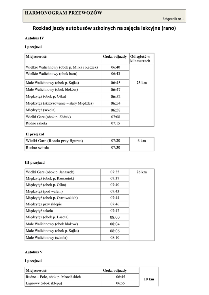 HARMONOGRAM PRZEWOZÓW Załącznik nr 1 Rozkład jazdy autobusów szkolnych na zajęcia lekcyjne (rano) Autobus IV I przejazd Miejscowość Godz. odjazdy Odległość w kilometrach Wielkie Walichnowy (obok p. Milka i Raczek) 06:40 Wielkie Walichnowy (obok baru) 06:43 Małe Walichnowy (obok p. Sójka) 06:45 Małe Walichnowy (obok bloków) 06:47 Międzyłęż (obok p. Ośka) 06:52 Międzyłęż (skrzyżowanie – stary Międzłęż) 06:54 Międzyłęż (szkoła) 06:58 Wielki Garc (obok p. Żółtek) 07:08 Rudno szkoła 07:15 23 km II przejazd Wielki Garc (Rondo przy figurce) 07:20 Rudno szkoła 07:30 6 km III przejazd Wielki Garc (obok p. Janaszek) 07:35 Międzyłęż (obok p. Rzeszotek) 07:37 Międzyłęż (obok p. Óśka) 07:40 Międzyłęż (pod wałem) 07:43 Międzyłęż (obok p. Ostrowskich) 07:44 Międzyłęż przy sklepie 07:46 Międzyłęż szkoła 07:47 Międzyłęż (obok p. Lasota) 08:00 Małe Walichnowy (obok bloków) 08:04 Małe Walichnowy (obok p. Sójka) 08:06 Małe Walichnowy (szkoła) 08:10 26 km Autobus V I przejazd Miejscowość Godz. odjazdy Rudno – Pole, obok p. Mrozińskich 06:45 Lignowy (obok sklepu) 06:55 10 km Lignowy (obok szkoły) 06:57 Rudno 07:02 II przejazd Gręblin (obok bloków) 07:07 Gręblin (obok p. Wanke) 07:09 Gręblin (obok p. Kołakowskich) 07:12 Gręblin (obok p. Chraca)* 07:14 Rudno szkoła 07:15 11 km III przejazd Rudno Pole (obok p. Guzik) 07:17 Lignowy szkoła 07:22 Lignowy sklep 07:24 Rudno (szkoła) 07:29 10 km IV przejazd Gręblin, przystanek za stacją benzynową (po prawej stronie) 07:36 Gręblin (obok bloków) 07:43 Gręblin (obok p. Wanke) 07:45 Gręblin (obok p. Kołakowskich) 07:47 Gręblin (obok p. Chraca)* 07:49 Rudno szkoła 07:51 13 km Rozkład jazdy autobusów szkolnych po zajęciach lekcyjnych Autobus IV I przejazd Małe Walichnowy (szkoła) 12:55 Małe Walichnowy (obok p. Sójka) 12:59 Małe Walichnowy (przy blokach) 13:01 Międzyłęż (obok p. Rzeszotek) 13:04 Międzyłęż (obok p. Lasota) 13:05 Międzyłęż (szkoła) 13:08 Międzyłęż (obok p. Ośka) 13:12 Międzyłęż (przy wale) 13:15 Międzyłęż (obok p. Ostrowskich) 13:16 Międzyłęż (przy sklepie) 13:18 Wielki Garc (obok p. Janaszek) 13:21 Małe Walichnowy (szkoła) 13:27 km 23 II przejazd Małe Walichnowy (szkoła) 13:45 km Małe Walichnowy (obok p. Sójka) 13:49 23 Małe Walichnowy (przy blokach) 13:51 Międzyłęż (obok p. Rzeszotek) 13:54 Międzyłęż (obok p. Lasota) 13:55 Międzyłęż (szkoła) 13:58 Międzyłęż (obok p. Ośka) 14:02 Międzyłęż (przy wale) 14:05 Międzyłęż (obok p. Ostrowskich) 14:06 Międzyłęż (przy sklepie) 14:08 Wielki Garc (obok p. Janaszek) 14:11 Małe Walichnowy (szkoła) 14:20 III przejazd Rudno (szkoła) 14:30 Wielki Garc (obok p. Żółtek) 14:35 Wielki Garc (wybudowanie) 14:37 Małe Walichnowy (przy blokach) 14:40 Małe Walichnowy (obok p. Sójka) 14:42 Wielkie Walichnowy 14:46 35 km Rozgarty 14:49 Międzyłęż (obok p. Lasota) 14:57 Międzyłęż (przy szkole) 15:00 Międzyłęż (obok p. Ośka) 15:03 Międzyłęż (przy wale) 15:05 Międzyłęż (skrzyżowanie-stary Międzyłęż) 15:10 IV przejazd Rudno (szkoła) 15:25 km Wielki Garc (obok p. Żółtek) 15:30 35 Wielki Garc (wybudowanie) 15:32 Małe Walichnowy (przy blokach) 15:35 Małe Walichnowy (obok p. Sójka) 15:37 Wielkie Walichnowy 15:41 Rozgarty 15:44 Międzyłęż (obok p. Lasota) 15:52 Międzyłęż (przy szkole) 15:55 Międzyłęż (obok p. Ośka) 15:58 Międzyłęż (przy wale) 16:00 Międzyłęż (skrzyżowanie-stary Międzyłęż) 16:05 Autobus V I przejazd Rudno (szkoła) 12:40 Lignowy (szkoła) 12:45 Rudno Pole (obok p. Guzik) 12:55 Rudno szkoła 13:00 II przejazd Rudno (szkoła) 13:00 Gręblin (obok bloków) 13:05 Gręblin szkoła 13:07 Gręblin (obok p. Kołakowskich i Krzysiców)* 13:09 Gręblin (obok p. Chraca)* 13:10 Wielki Garc (rondo przy figurce) 13:14 Rudno Pom (przystanek Latocha) 13:16 Rudno szkoła 13:20 10 km 15 km III przejazd Rudno (szkoła) 13:20 km Lignowy (przy sklepie) 13:35 17 km Lignowy (przy szkole) 13:37 Rudno (szkoła) 13:42 Gręblin (obok bloków) 13:47 Gręblin (szkoła) 13:49 Wielki Garc (rondo przy figurce) 13:54 Rudno szkoła 13:57 IV przejazd Rudno (szkoła) 14:15 Lignowy (przy sklepie) 14:30 Lignowy (przy szkole) 14:32 Rudno Pole (obok p. Guzik) 14:37 Gręblin (obok bloków) 14:40 Gręblin (obok p. Wanke) 14:42 Gręblin (obok p. Krzysica)* 14:44 Gręblin (obok p. Chraca) 14:45 Wielki Garc (rondo przy figórce) 14:47 Rudno szkoła 14:49 22 km V przejazd Rudno (szkoła) 15:10 Lignowy (przy sklepie) 15:25 Lignowy szkoła 15:27 Rudno Pole (obok p. Guzik) 15:32 Gręblin (obok bloków) 15:37 Gręblin (obok p. Wanke) 15:39 Gręblin (obok p. Chraca)* 15:41 Wielki Garc (rondo przy figurce) 15:45 Rudno szkoła 15:50 23 km