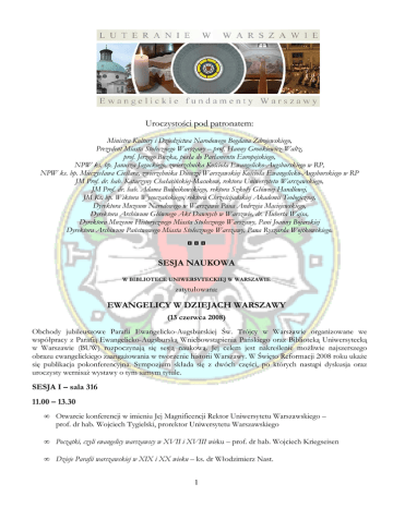 Uroczystości pod patronatem: Ministra Kultury i Dziedzictwa Narodowego Bogdana Zdrojewskiego, Prezydent Miasta Stołecznego Warszawy – prof. Hanny Gronkiewicz-Waltz, prof. Jerzego Buzka, posła do Parlamentu Europejskiego, NPW ks. bp. Janusza Jaguckiego, zwierzchnika Kościoła Ewangelicko-Augsburskiego w RP, NPW ks. bp. Mieczysława Cieślara, zwierzchnika Diecezji Warszawskiej Kościoła Ewangelicko-Augsburskiego w RP JM Prof. dr. hab. Katarzyny Chałasińskiej-Macukow, rektora Uniwersytetu Warszawskiego, JM Prof. dr. hab. Adama Budnikowskiego, rektora Szkoły Głównej Handlowej, JM Ks. bp. Wiktora Wysoczańskiego, rektora Chrześcijańskiej Akademii Teologicznej, Dyrektora Muzeum Narodowego w Warszawie Pana Andrzeja Maciejewskiego, Dyrektora Archiwum Głównego Akt Dawnych w Warszwie, dr. Huberta Wajsa, Dyrektora Muzeum Historycznego Miasta Stołecznego Warszawy, Pani Joanny Bojarskiej Dyrektora Archiwum Państwowego Miasta Stołecznego Warszawy, Pana Ryszarda Wojtkowskiego. ◘◘◘ SESJA NAUKOWA W BIBLIOTECE UNIWERSYTECKIEJ W WARSZAWIE zatytułowana: EWANGELICY W DZIEJACH WARSZAWY (13 czerwca 2008) Obchody jubileuszowe Parafii Ewangelicko-Augsburskiej Św. Trójcy w Warszawie organizowane we współpracy z Parafią Ewangelicko-Augsburską Wniebowstąpienia Pańskiego oraz Biblioteką Uniwersytecką w Warszawie (BUW) rozpoczynają się sesją naukową. Jej celem jest nakreślenie moŜliwie najszerszego obrazu ewangelickiego zaangaŜowania w tworzenie historii Warszawy. W Święto Reformacji 2008 roku ukaŜe się publikacja pokonferencyjna. Sympozjum składa się z dwóch części, po których nastąpi dyskusja oraz uroczysty wernisaŜ wystawy o tym samym tytule. SESJA I – sala 316 11.00 – 13.30 • Otwarcie konferencji w imieniu Jej Magnificencji Rektor Uniwersytetu Warszawskiego – prof. dr hab. Wojciech Tygielski, prorektor Uniwersytetu Warszawskiego • Początki, czyli ewangelicy warszawscy w XVII i XVIII wieku – prof. dr hab. Wojciech Kriegseisen • Dzieje Parafii warszawskiej w XIX i XX wieku – ks. dr Włodzimierz Nast. 1 • Ewangelicka Parafia wojskowa na warszawskim Mokotowie – ks. płk. Adam Pilch • Ewangeliccy muzycy warszawscy – działalność artystyczna i pedagogiczna Jerzego Lefelda – Stanisław Dybowski • Stare druki ewangelickie w zbiorach BUW - Halina Mieczkowska, ElŜbieta Bylinowa DYSKUSJE, LUNCH i POKAZ STARYCH DRUKÓW SESJA II – sala 316 14.30 – 17.00 • Szymon Bogumił Zug i jego arcydzieło - zbór ewangelicko-augsburski w Warszawie – prof. dr hab. Zbigniew Bania • Osadnictwo ewangelickie w XIX wieku na przykładzie rodzin Burschów i Kruschów – prof. dr hab. Juliusz Gardawski • Wilhelm Kolberg (1807-1877), inŜynier dróg i mostów, badacz dziejów Warszawy, prezes Kolegium Kościelnego Zboru Warszawskiego – prof. dr Tadeusz Stegner • Liceum Mikołaja Reja i Anny Wazówny – pierwsze lata – prof. dr hab. Mieczysław Matejak • Nieznane fakty z Ŝycia warszawskich ewangelików – Tadeusz Wł. Świątek DYSKUSJA, PODSUMOWANIE • 17.00 – 18.30 – WernisaŜ - sala wystawowa BUW na parterze. • ok. godziny 18.15 sprzed gmachu BUW odjedzie autobus, który przetransportuje zainteresowanych na koncert muzyki organowej „BACH TO THE FUTURE” w wykonaniu tytularnego organisty katedry Notre Dame w ParyŜu, Oliviera Latry. Koncert rozpocznie się o godz. 19.00 w kościele Świętej Trójcy przy pl. Małachowskiego. Ewa Kobierska-Maciuszko i prof. Juliusz Gardawski – koordynatorzy sesji ◘◘◘ WYSTAWA W BIBLIOTECE UNIWERSYTECKIEJ W WARSZAWIE zatytułowana: EWANGELICY W DZIEJACH WARSZAWY (13 czerwca 2008 – wystawa czynna do 30 czerwca 2008) Sesji naukowej towarzyszą dwie ekspozycje: mniejsza - przy sali obrad – zorganizowana przez gospodarza przedstawiająca religijne i świeckie druki protestanckie w zbiorach BUW, i duŜa - w sali wystawowej na parterze, dostępna szerszej publiczności, a ukazująca Ŝycie Parafii ewangelicko-augsburskiej od zbudowania kościoła Świętej Trójcy przez królewskiego architekta Szymona Bogumiła Zuga pod koniec XVIII w. aŜ po współczesność. Na ekspozycję złoŜyły się zasoby BUW, Archiwum Głównego Akt Dawnych, Archiwum 2 Państwowego w Warszawie, Muzeum Historycznego m. st. Warszawy, Konsystorza Kościoła EwangelickoAugsburskiego i innych instytucji współpracujących przy organizacji tej imprezy. Większość zbiorów przekazały Komisja Ochrony Pamiątek – Społeczny Instytut Historyczny, działająca przy Parafii Świętej Trójcy i Parafianie, dwóch kościołów luterańskich, jubilata i Parafii Wniebowstąpienia Pańskiego na Mokotowie. Podzielona na 11 działów wystawa ukazuje nie tylko świątynię, duchownych i świeckich działaczy zboru, instytucje parafialne, ale szczególnie akcentuje dokonania szeregu rodów ewangelickich, które swymi zdolnościami i pracą wywarły doniosły wpływ na rozwój przemysłu i handlu w Warszawie, zwłaszcza w drugiej połowie XIX w. i części XX w. Dokumentuje teŜ nieznane momenty z dziejów stolicy, jak choćby uratowanie Stanisława Augusta Poniatowskiego, podczas próby jego porwania przez konfederatów barskich. Wówczas przed śmiertelnym strzałem polskiego monarchę zasłonił dworzanin rodem z Meklemburgii – luteranin Jerzy Henryk Butzau, który gest ten przypłacił Ŝyciem. Wdzięczny król ufundował mu pomnik na nieistniejącym juŜ dzisiaj cmentarzu na Lesznie. Wystawa ukazuje równieŜ działalność ewangelików na niwie charytatywnej, prezentując m.in. nieistniejący od II wojny światowej Szpital Ewangelicki, załoŜony w XVI w., słynący z wykwalifikowanej kadry medycznej i nowatorskich metod leczenia. W 1847 r. właśnie w nim, dr Koehler, wykonał pierwszą we wschodniej części Europy operację w uśpieniu eterowym. Nie mniej waŜna była działalność oświatowa, od XIX w. zbór warszawski prowadził kilka szkół na poziomie podstawowym, a od XX w. jeszcze dwa gimnazja i licea: męski