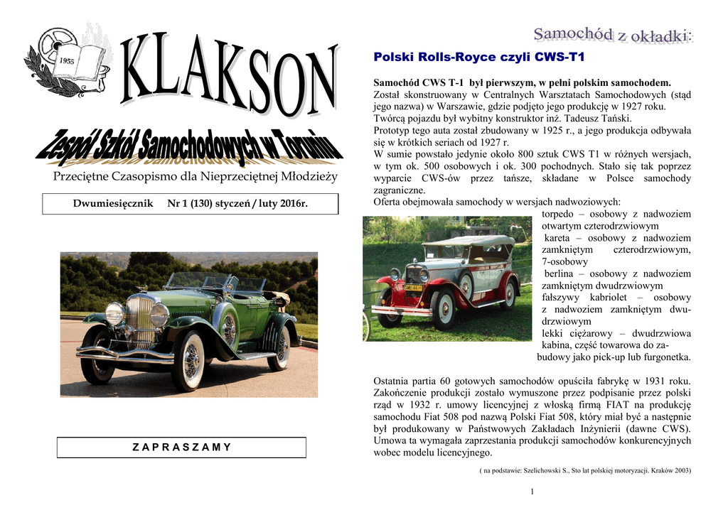 Polski Rolls-Royce czyli CWS-T1 Przeciętne Czasopismo dla Nieprzeciętnej Młodzieży Dwumiesięcznik Nr 1 (130) styczeń / luty 2016r. ZAPRASZAMY Samochód CWS T-1 był pierwszym, w pełni polskim samochodem. Został skonstruowany w Centralnych Warsztatach Samochodowych (stąd jego nazwa) w Warszawie, gdzie podjęto jego produkcję w 1927 roku. Twórcą pojazdu był wybitny konstruktor inż. Tadeusz Tański. Prototyp tego auta został zbudowany w 1925 r., a jego produkcja odbywała się w krótkich seriach od 1927 r. W sumie powstało jedynie około 800 sztuk CWS T1 w różnych wersjach, w tym ok. 500 osobowych i ok. 300 pochodnych. Stało się tak poprzez wyparcie CWS-ów przez tańsze, składane w Polsce samochody zagraniczne. Oferta obejmowała samochody w wersjach nadwoziowych: torpedo – osobowy z nadwoziem otwartym czterodrzwiowym kareta – osobowy z nadwoziem zamkniętym czterodrzwiowym, 7-osobowy berlina – osobowy z nadwoziem zamkniętym dwudrzwiowym fałszywy kabriolet – osobowy z nadwoziem zamkniętym dwudrzwiowym lekki ciężarowy – dwudrzwiowa kabina, część towarowa do zabudowy jako pick-up lub furgonetka. Ostatnia partia 60 gotowych samochodów opuściła fabrykę w 1931 roku. Zakończenie produkcji zostało wymuszone przez podpisanie przez polski rząd w 1932 r. umowy licencyjnej z włoską firmą FIAT na produkcję samochodu Fiat 508 pod nazwą Polski Fiat 508, który miał być a następnie był produkowany w Państwowych Zakładach Inżynierii (dawne CWS). Umowa ta wymagała zaprzestania produkcji samochodów konkurencyjnych wobec modelu licencyjnego. ( na podstawie: Szelichowski S., Sto lat polskiej motoryzacji. Kraków 2003) 1 Deadpool Deadpool – w reżyserii Tima Millera to film przede wszystkim dla fanów komiksów. Nie dość, że jest dobry sam w sobie, to jeszcze przez cały seans ma się wrażenie, że obok siedzi dobry znajomy, który zabawnie i dosadnie komentuje to, co oglądacie. Deadpool jest filmem idealnie poruszającym się na granicy autoparodii, ale nigdy jej nie przekraczającym. Humor w „Deadpool” jest ciągle na stałym poziomie, od pierwszej sekundy filmu do ostatniej (trzeba wysiedzieć do końca napisów). Już same napisy początkowe nastrajają bardzo pozytywnie do seansu, idealnie wprowadzają w klimat produkcji, a liczba żartów w nich zawarta jest przeogromna. Dialogi także nie zawodzą. Są zabawne, cięte oraz pełne mięcha. Obrywa się wszystkim, a publiczność zmuszana jest do tarzania się ze śmiechu po podłodze. Oczywiście, tak jak w komiksach ich poziom bywa różny. Pewnie też nie wszystkim odpowiada ten rodzaj humoru. Największym plusem filmu jest jednak jego główna postać i sposób, w jaki Ryan Reynolds się w nią wciela. On nie odgrywa Deadpoola, on na swój sposób nim jest. Zachęcam do obejrzenia tego filmu, ponieważ zawiera niemałą dawkę. dobrego humoru Do kina zaprosił nas Marek Raczkowski z kl. IIIb/4 Już 26 lutego w Łęczycy rozpocznie się turniej finałowy mistrzostw Polski U-18. Wezmą w nim udział dwie drużyny, w których grają uczniowie naszej szkoły. W drużynie FC TORUŃ grają: Igor Pryjmas 3B/4, Dawid Wędołowski 2A/4, Szymon Wierzbowski 2B/4, Patryk Literski 2E/4, Bartek Krygier 2A/4, Podopieczni Mykoli Morozowa zagrają w grupie „A”. Rywalami drużyny będą: Sobek Kraków, MKF Solne Miasto Wieliczka i GKS Wikielec. Pierwszym rywalem juniorów FC będzie zespół z Krakowa. Spotkanie odbędzie się 26 lutego, o godzinie 13. Ten mecz zainauguruje rywalizację w Łęczycy. W sobotę, 27 lutego o 9.20, zespół zmierzy się z Solnym Miastem a o 15.10 powalczy z GKS-em Wikielec. W drużynie TAF grają: Kuba Wiśniewski 3C/4 i Michał Kukowski 2C/4 Podopieczni Mariusza Łangowskiego zagrają w grupie „D”. Ich rywalami będą SCHLF Clearex Chorzów (piątek 26 lutego godz 18:20), Gwiazda Ruda Śląska (sobota 27 lutego 21:00), Jantra Ustka (sobota 27 lutego godz. 13:30). Do fazy pucharowej awansują dwie najlepsze drużyny. Mistrza Polski poznamy w niedzielę (28 lutego). Relacje: Futsalmmp.pl oraz Śląskie.tv/youtube Na mistrzostwa Polski U-18 zaprosili nas Igor Pryjmas i Michał Kukowski 2 3 PODSUMOWANIE I SEMESTRU ROKU SZKOLNEGO2015/2016 Najlepsi uczniowie w Technikum Nr 7 Cisek Cezary Witkowski Dawid Ławniczak Maciej Cieszkowsk Krzysztof Balcerski Tomasz Mytlewski Tomasz Tchorzewski Kamil Gołost Wojciech Blachowski Michał Radke Adam Celmer Paweł Pesta Patryk Trzpil Przemysłw Liszkowski Mateusz Klimkowski Daniel Przybysz Mateusz Osiak Piotr Waszak Sebastian Brzozowiec Dorian Wicher Dawid Kaletta Patryk Marchlewski Mateusz Kułakowski Marek Szczypiński Maciej Bogusz Mateusz Insadowski Adam Madajczyk Andrzej Molenda Jakub 4,73 4,67 4,64 4,63 4,57 4,55 4,44 4,40 4,33 4,33 4,30 4,30 4,30 4,29 4,25 4,25 4,21 4,18 4,17 4,15 4,10 4,10 4,08 4,07 4,00 4,00 4,00 4,00 4 Najlepsi uczniowie w ZSZ 2a/4 2a/4 3a/4 1e/4 2a/4 1a/4 4c/4 4a/4 3a/4 2b/4 4a/4 1/a4 1a/4 2c/4 3e/4 1a/4 1e/4 3a/4 3a/4 1a/4 1a/4 1a/4 2c/4 2c/4 4a/4 3e/4 4a/4 3c/4 Bartkowiak Hubert Górka Damian Zajączkowski Jan Kwiatkowski Artur Kopiński Damian Obermueller Łukasz 4,25 4,06 3,85 3,77 3,63 3,63 2e/z 1e/z 3b/z 3b/z 1b/z 1b/z 100% frekwencja Trojanowski Robert Mytlewski Tomasz Wicher Dawid Liszkowski Mateusz Stangrecki Tomasz Gołost Wojciech Patyna Mateusz Kopiński Damian 3a/z 1a/4 1a/4 2c/4 1a/4 4a/4 4c/4 1b/z Gazetka ,,KLAKSON” Zespół redakcyjny: p. E. Słupczewska, p. A. Bielicka, p. D. Szwed, M. Kukowsk IIc/4, I. Pryjmas IIIb/4 i M. Raczkowski IIIb/4