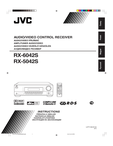 Česky Polski AUDIO/VIDEO CONTROL RECEIVER Magyar AUDIO/VIDEO PŘIJĺMAČ AMPLITUNER AUDIO/VIDEO AUDIO/VIDEO VEZÉRLŐ KÉSZÜLÉK AУДИO/ВИДЕО РЕСИВЕР Pyccкий RX-6042S RX-5042S TA/NEWS/INFO DISPLAY MODE INSTRUCTIONS PŘÍRUČKA K OBSLUZE INSTRUKCJA OBSŁUGI HASZNÁLATI UTASÍTÁSA ИHCTPYKЦИЯ ПO ЭKCПЛУATAЦИИ LVT1140-011A [EV] Cover_RX_6042&5042[EV]f.p65 1 04.2.18, 6:19 PM Upozornění Ostrzeżenia i inne informacje Figyelmeztetések, előírások és egyebek Предупреждения, предостeрeжeнияи другoе В соответствии с Законом Российской Федерации “О защите прав потребителей” срок службы (годности) данного товара, “по истечении которого он может представлять опасность для жизни, здоровья потребителя, причинять вред его имуществу или окружающей среде” составляет семь (7) лет со дня производства. Этот срок является временем, в течение которого потребитель данного товара может безопасно им пользоваться при условии соблюдения инструкции по эксплуатации данного товара, проводя необходимое обслуживание, включающее замену расходных материалов и/или соответствующее ремонтное обеспечение в специализированном сервисном центре. Дополнительные косметические материалы к данному товару, поставляемые вместе с ним, могут храниться в течение двух (2) лет со дня его производства. Срок службы (годности), кроме срока хранения дополнительных косметических материалов, упомянутых в предыдущих двух пунктах, не затрагивает никаких других прав потребителя, в частности, гарантийного свидетельства JVC, которое он может получить в соответствии с законом о правах потребителя или других законов, связанных с ним. UPOZORNĚNÍ—STANDBY/ON vypínač! Aby byl proud zcela vypnutý, odpojte hlavní přívod (indikátor zhasne). Vypínač neodpojuje hlavní vedení STANDBY/ON vžádné poloze. Přívod proudu může být ovládán dálkově. OSTRZEŻENIE—STANDBY/ON przycisk! Aby całkowicie wyłączyć zasilanie, należy odłączyć przewód sieciowy. Przycisk STANDBY/ON w żadnym położeniu nie odłącza urządzenia od sieci. Zasilanie można włączać i wyłączać zdalnie. A STANDBY/ON kapcsolóra vonatkozó előrások! A készüléket a tápkábel csatlakozójának kihúzásával tudja teljesen kikapcsoln. A tápfeszültséget a STANDBY/ON kapcsoló egyetlen pozícióba állításával sem szakítja meg. Az áramellátás távvezérelhet. ПРЕДОСТЕРЕЖЕНИЕ—Кнопка STANDBY/ON ! Отсоедините ceтевую вилку для полного отключения питания. Пнопка STANDBY/ON в любой позиции не отключает ceть питания. итанием можно упpaвлять дистанционно. G-1 Safety_RX_6042&5042[EV]f.p65 1 04.2.18, 6:20 PM UPOZORNĚNĺ Aby se zabránilo poranění elektrickým proudem, požáru atd.: 1. Nesnímejte šrouby, kryty nebo skříňku. 2. Nevystavujte toto zařízení dešti nebo vlhkosti. OSTRZEŻENIE Aby zmniejszyć niebezpieczeństwo porażenia prądem elektrycznym, pożaru, itp.: 1. Nie zdejmuj wkrętów, osłon ani obudowy. 2. Nie narażaj niniejszego urządzenia na działanie deszczu lub wilgoci. ÓVINTÉZKEDÉS A tűz és az áramütés stb. veszélyének csökkentése érdekében: 1. Ne távolítsa el a készülék csavarjait, külső burkolatát vagy a készülékdobozt. 2. Ne tegye ki a készüléket eső vagy nedvesség hatásának. ПРЕДОСТЕРЕЖЕНИЕ Во избежание риска поражения электрическим током, пожара и т.п.: 1. Не снимайте винты, крышки или корпус. 2. Не подвергайте это электрическое оборудование воздействию дождя или влаги. UPOZORNĚNĺ • Nezakrývejte větrcí otvory. Jestliže budou ventilační otvory zakryty novinami nebo látkou, může docházet k přehřívání zařízení. • V žádném případě nepokládejte na zařízení zapálené svíčky atd. • Při likvidaci baterií se řiďte místními ekologickými pokyny. • Nevystavujte tento přístroj vlivu deště, vlhkosti, kapajícich a stříkajícíh tekutin a nepokládejte na něj předměty naplněné tekutinami, například vázy. OSTRZEŻENIE • Nie przekrywać otwory wentylacyjne. (Jeżeli doszłoby do przekrycia otworów wentylacyjnych gazetami, tkanią itd., ciepło nie mogłoby unilkać). • Nie pokładać na przyrząd żadnych źródeł z otwartym ogniem, jako rozświecone świece. • Przy wymianie baterii należy brać do uwagi problemy związane z ochroną środowiska natsuralnego, a dlatego muszą być ściśle dotrzymywane przepisy miejscowe albo ustawy dotyczące likwidacji wyładowanych baterii. • Chronić urządzenie przed deszezem, wilgocią i kroplami wody. Nie stawiać na nim jakichkolwiek pojemników wypełnionych wodą lub innymi płynami – np. wazonów. ÓVINTÉZKEDÉS • Ne torlaszolja el a szellőzőnyílásokat (Ha a szellőzőnyíláok, lyukak ujsággal, ruhadarab