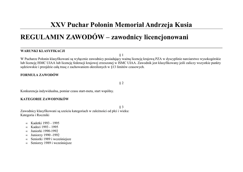 XXV Puchar Połonin Memoriał Andrzeja Kusia REGULAMIN ZAWODÓW – zawodnicy licencjonowani WARUNKI KLASYFIKACJI §1 W Pucharze Połonin klasyfikowani są wyłącznie zawodnicy posiadający waŜną licencję krajową PZA w dyscyplinie narciarstwo wysokogórskie lub licencję ISMC UIAA lub licencję federacji krajowej zrzeszonej w ISMC UIAA. Zawodnik jest klasyfikowany jeśli zaliczy wszystkie punkty sędziowskie i przejdzie całą trasę z zachowaniem określonych w §13 limitów czasowych. FORMUŁA ZAWODÓW §2 Konkurencja indywidualna, pomiar czasu start-meta, start wspólny. KATEGORIE ZAWODNIKÓW §3 Zawodnicy klasyfikowani są sześciu kategoriach w zaleŜności od płci i wieku: Kategoria i Roczniki • • • • • • Kadetki 1993 - 1995 Kadeci 1993 - 1995 Juniorki 1990-1992 Juniorzy 1990 -1992 Seniorki 1989 i wcześniejsze Seniorzy 1989 i wcześniejsze SPRZĘT I WYPOSAśENIE ZAWODNIKÓW §4 Artykuły wyliczone poniŜej muszą spełniać wymogi europejskie (EU) lub wymogi UIAA. §5 Podstawowe obowiązkowe wyposaŜenie zawodnika: 1. Narty wyposaŜone w metalowe krawędzie na co najmniej 90% ich długości, o szerokości co najmniej 60 mm pod butem. Narty musza mieć co najmniej 160 cm długości dla męŜczyzn i 150 cm dla kobiet (dla młodziczek i młodzików minimum 80% wzrostu zawodnika). Wiązania muszą umoŜliwiać ruch pięty podczas podchodzenia lub zjazdu i mogą lecz nie muszą być wyposaŜone w paski zabezpieczające, na ryzyko zawodnika. Zarówno przednia, jak i tylna część wiązań musi zapewniać bezpieczne wypinanie w płaszczyźnie przód-tył, jak i na boki (w płaszczyźnie prostopadłej). Stosowanie wiązań i butów biegowych oraz ich pochodnych jest stanowczo zabronione*. 2. Buty muszą być wystarczająco wysokie by zakrywać kostki, z podeszwami typu Vibram lub podobnymi podeszwy muszą pokrywać co najmniej 80% powierzchni stopy i mieć minimalną grubość 4 mm). Buty muszą nadawać się do załoŜenia metalowych raków. 3. Para kijków do narciarstwa alpejskiego lub biegowego o maksymalnej średnicy 25 mm z niemetalowymi talerzykami*. 4. Para fok. Ze względu na zasady ochrony środowiska nie wolno stosować taśm samoprzylepnych i innych środków zwiększających przyczepność lub poślizg fok. 5. Ubranie dolnej połowy ciała, długie spodnie o rozmiarze odpowiednim dla danego zawodnika. Konieczne są co najmniej dwie warstwy ubrania (obydwie z długimi nogawkami: jedna z materiału nieprzepuszczalnego dla wiatru, a druga to spodnie narciarskie lub kombinezon narciarski. 6. Ubranie górnej połowy ciała z długimi rękawami o rozmiarze odpowiednim dla danego zawodnika. Konieczne są co najmniej trzy warstwy ubrania: nieprzepuszczalna dla wiatru, kombinezon narciarski i trzecia warstwa (wszystkie warstwy z długimi rękawami). 7. Detektor lawinowy 457 kHz. KaŜdy zawodnik musi nosić to urządzenie na sobie w pozycji nadawania przez cały czas trwania zawodów. Urządzenie musi być umieszczone pod ubraniem w bezpośrednim kontakcie z ciałem zawodnika. Zawodnik jest odpowiedzialny za sprawdzenie, Ŝe urządzenie działa poprawnie. W przypadku gdyby urządzenie popsuło się w trakcie zawodów, zawodnik musi zawiadomić o tym najbliŜszy punkt kontrolny. Po poinformowaniu o tym fakcie dyrektora zawodów, podejmie on stosowne kroki by zapewnić zawodnikowi bezpieczeństwo. 8. Łopata do śniegu (o wymiarach co najmniej 20x20 cm), nie przerabiana, lecz taka jak została wyprodukowana. Określenie łopata do śniegu jest definiowane przez producenta. On ponosi odpowiedzialność za tę definicję. 9. Płachta ratunkowa o powierzchni co najmniej 1,8 m kw. 10. Rękawice chroniące całą rękę do nadgarstka ubrane przez cały czas trwania zawodów. 11. Okulary przeciwsłoneczne z filtrem. 12. Plecak (pojemność minimum 20 litrów, dla młodzików minimum 10 litrów), przy czym w zawodach zespołowych kaŜdy członek zespołu powinien mieć plecak na plecach na odcinkach zjazdowych. 13. Kask. NaleŜy go obowiązkowo nosić na głowie podczas wszystkich zjazdów, a takŜe na wszystkich częściach trasy określonych przez organizatora zawodów podczas odprawy. Kaski muszą być zgodne z normami: EN12492 i UIAA106. śaden kask nie gwarantuje pełnego zabezpieczenia przed wszystkimi rodzajami uderzeń. 14. Sprawna czołówka WyposaŜenie zalecane: 15. Kompas lub GPS. 16. Apteczka. *) Przed startem oznaczone zostaną obydwie narty i obydwa kijki. §6 WyposaŜenie dostarczone przez organizatora: Numery dla zawodników. Numery dostarczone przez organizatora muszą być noszone w miejscach do tego przeznaczonych przez cały czas trwania zawodów (plecak i/lub numer samoprzylepny na prawym udzie). Nie wolno ich zwijać ani obcinać. ZACHOWANIE ZAWODNIKÓW §7 KaŜdy zawodnik, który zostanie dogoniony musi obowiązkowo i natychmiast ustąpić drogi zawodnikowi, który mówi: „TRASA”. §8 KaŜdy zawodnik w kłopotach moŜe zrezygnować z dalszego udziału w zawodach ze swojej inicjatywy, albo być zdjętym z trasy przez dyrektora zawodów lub jednego z lekarzy organizatorów. Rezygnacja lub zdjęcie z trasy powinna mieć miejsce na punkcie kontrolnym z wyjątkiem okoliczności nadzwyczajnych. §9 Wszyscy zawodnicy są zobowiązani przyjść z pomocą osobie będącej w niebezpieczeństwie. Jury weźmie pod uwagę czas poświęcony na udzielenie pomocy. § 10 Zabronione jest korzystanie z pomocy zewnętrznej podczas zawodów. Wyjątek: wymiana kijka; jednak wymiana 2 kijków to juŜ 5 minut kary. § 11 KaŜde niestosowne zachowanie lub niezastosowanie się do regulaminu zgłoszone do przewodniczącego jury musi być potraktowane zgodnie z regulaminem i zbadane przez jury. MoŜe ono pociągnąć za sobą postępowanie dyscyplinarne. DYSKWALIFIKACJA I KARY § 12 Obowiązują następujące zasady: 1. Jakikolwiek przedmiot wymagany przez organizatorów brakujący na punkcie kontrolnym lub na mecie (z wyjątkiem złamanego kijka przekazanego sędziemu) = 3 m