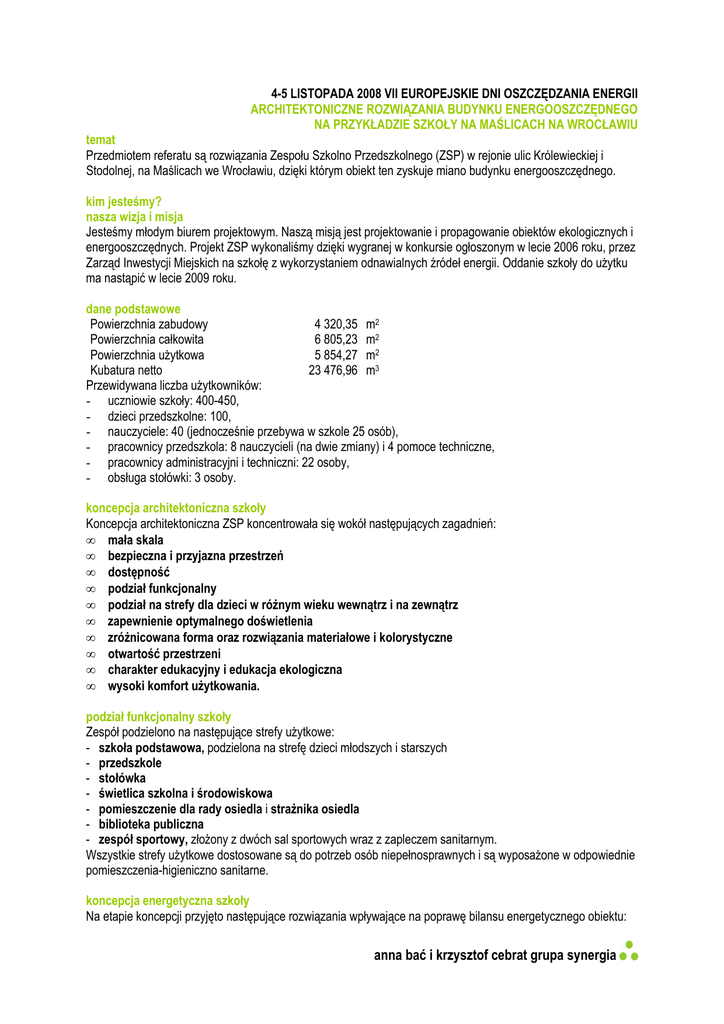 4-5 LISTOPADA 2008 VII EUROPEJSKIE DNI OSZCZĘDZANIA ENERGII ARCHITEKTONICZNE ROZWIĄZANIA BUDYNKU ENERGOOSZCZĘDNEGO NA PRZYKŁADZIE SZKOŁY NA MAŚLICACH NA WROCŁAWIU temat Przedmiotem referatu są rozwiązania Zespołu Szkolno Przedszkolnego (ZSP) w rejonie ulic Królewieckiej i Stodolnej, na Maślicach we Wrocławiu, dzięki którym obiekt ten zyskuje miano budynku energooszczędnego. kim jesteśmy? nasza wizja i misja Jesteśmy młodym biurem projektowym. Naszą misją jest projektowanie i propagowanie obiektów ekologicznych i energooszczędnych. Projekt ZSP wykonaliśmy dzięki wygranej w konkursie ogłoszonym w lecie 2006 roku, przez Zarząd Inwestycji Miejskich na szkołę z wykorzystaniem odnawialnych źródeł energii. Oddanie szkoły do uŜytku ma nastąpić w lecie 2009 roku. dane podstawowe Powierzchnia zabudowy 4 320,35 m2 Powierzchnia całkowita 6 805,23 m2 Powierzchnia uŜytkowa 5 854,27 m2 Kubatura netto 23 476,96 m3 Przewidywana liczba uŜytkowników: - uczniowie szkoły: 400-450, - dzieci przedszkolne: 100, - nauczyciele: 40 (jednocześnie przebywa w szkole 25 osób), - pracownicy przedszkola: 8 nauczycieli (na dwie zmiany) i 4 pomoce techniczne, - pracownicy administracyjni i techniczni: 22 osoby, - obsługa stołówki: 3 osoby. koncepcja architektoniczna szkoły Koncepcja architektoniczna ZSP koncentrowała się wokół następujących zagadnień: • mała skala • bezpieczna i przyjazna przestrzeń • dostępność • podział funkcjonalny • podział na strefy dla dzieci w róŜnym wieku wewnątrz i na zewnątrz • zapewnienie optymalnego doświetlenia • zróŜnicowana forma oraz rozwiązania materiałowe i kolorystyczne • otwartość przestrzeni • charakter edukacyjny i edukacja ekologiczna • wysoki komfort uŜytkowania. podział funkcjonalny szkoły Zespół podzielono na następujące strefy uŜytkowe: - szkoła podstawowa, podzielona na strefę dzieci młodszych i starszych - przedszkole - stołówka - świetlica szkolna i środowiskowa - pomieszczenie dla rady osiedla i straŜnika osiedla - biblioteka publiczna - zespół sportowy, złoŜony z dwóch sal sportowych wraz z zapleczem sanitarnym. Wszystkie strefy uŜytkowe dostosowane są do potrzeb osób niepełnosprawnych i są wyposaŜone w odpowiednie pomieszczenia-higieniczno sanitarne. koncepcja energetyczna szkoły Na etapie koncepcji przyjęto następujące rozwiązania wpływające na poprawę bilansu energetycznego obiektu: anna bać i krzysztof cebrat grupa synergia niskie zapotrzebowanie na energię ograniczenie strat ciepła niski współczynnik U dla przegród zewnętrznych odnawialne źródła energii: kolektory słoneczne dolne źródło ciepła w postaci pomp ciepła lub wymiennika ciepła w kolektorze ogólnosanitarnym zyski solarne: podwójna fasada szklana akumulacja ciepła masywne ściany wewnętrzne naturalny system wentylacji wspomagany wywiewem z rekuperacją ciepła ogrzewanie powietrzne. W rezultacie zrezygnowano z podwójnej fasady szklanej oraz zastosowano wyłącznie mechaniczny system wentylacji. W obiekcie ZSP osiągnięto jednostkowy wskaźnik zuŜycia energii E na poziomie poniŜej wartości 45 kWh/m2 na rok, co klasyfikuje go do obiektów energooszczędnych. Jest to moŜliwe dzięki redukcji rocznego zuŜycia energii przy uŜyciu następujących rozwiązań: - zaprojektowaniu budynku w sposób umoŜliwiający maksymalne wykorzystanie energii słonecznej, - zastosowaniu materiałów przegród zewnętrznych o przepuszczalności cieplnej obniŜonej w stosunku do wartości normatywnych, wartość średnia U [W/m²K] dla przegród zewnętrznych wynosi: podłóg na gruncie 0.28 stropodachu 0.156 ścian zewnętrznych 0.152 fasad szklanych 1.7 - ograniczaniu występowania mostków cieplnych zwłaszcza w sposobach mocowania okien, - zastosowaniu odnawialnych źródeł energii dla pokrycia ponad 90% potrzeb grzewczych obiektu, - wykorzystaniu pomp ciepła gruntowych i powietrznych, - wykorzystaniu energii słonecznej do podgrzania ciepłej wody uŜytkowej w 52% w cyklu całorocznym zapotrzebowania ciepłej wody dla przedszkola i 35% - dla szkoły, - ograniczeniu strat ciepła na niekontrolowanej wentylacji przez zastosowanie wentylacji mechanicznej, - zastosowaniu odzysku energii z powietrza wywiewanego, - regulację eksploatacji systemu instalacyjnego przez BMS, - zapewnienia światła dziennego w przewaŜającej większości pomieszczeń. W okresie letnim pompy ciepła zapewnią moŜliwość ochładzania powietrza nawiewanego do pomieszczeń i tym samym poprawiony zostanie mikroklimat obiektu. system BMS Na szczególną uwagę zasługuje system BMS, którego zadaniem jest nadzorowanie systemów instalacji, ograniczenie zuŜycia energii i podnoszenie komfortu uŜytkowania. Jest to moŜliwe przez sterowanie: - lokalnych źródeł energii odnawialnej, - instalacji kształtowania klimatu (wentylacja i ogrzewanie), - systemów sterowania oświetleniem elektrycznym, - układami przygotowania c.w.u (układy solarne i elektryczne), - instalacjami dozorowymi i bezpieczeństwa (p.poŜ., wykrywania włamania, kontroli dostępu). Istnieje moŜliwość zarządzania całym budynku z jednego miejsca oraz usługa gromadzenia i przetwarzania danych pomiarowych z systemu dla późniejszej analiz techniczno-ekonomicznych. System wizualizacji pracy urządzeń i prezentacji będzie wykorzystywany zarówno do bieŜącej obsługi budynku jak i do celów edukacyjnych i prezentacji energooszczędnych rozwiązań. koncepcja ekologiczna szkoły Priorytetem projektowym w obiekcie było takŜe zastosowanie rozwiązań proekologicznych takich jak: wykorzystanie wody deszczowej do podlewania trawników i zbiorników retencyjnych zaprojektowanie zielonych dachów zastosowanie materiałów o niskim bagaŜu ekologicznym W rezultacie w projekcie zastosowano podziemne zbiorniki na wodę deszczową, która jest wykorzystywana do podlewania trawników. anna bać i krzysztof cebrat grupa synergia