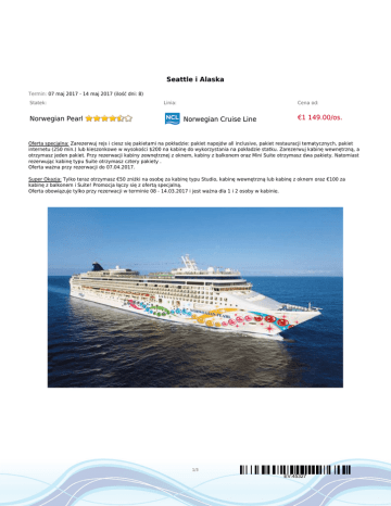 Seattle i Alaska Termin: 07 maj 2017 - 14 maj 2017 (ilość dni: 8) Statek: Norwegian Pearl Linia: Cena od: Norwegian Cruise Line €1 149.00/os. Oferta specjalna: Zarezerwuj rejs i ciesz się pakietami na pokładzie: pakiet napojów all inclusive, pakiet restauracji tematycznych, pakiet internetu (250 min.) lub kieszonkowe w wysokości $200 na kabinę do wykorzystania na pokładzie statku. Zarezerwuj kabinę wewnętrzną, a otrzymasz jeden pakiet. Przy rezerwacji kabiny zewnętrznej z oknem, kabiny z balkonem oraz Mini Suite otrzymasz dwa pakiety. Natomiast rezerwując kabinę typu Suite otrzymasz cztery pakiety . Oferta ważna przy rezerwacji do 07.04.2017. Super Okazja: Tylko teraz otrzymasz €50 zniżki na osobę za kabinę typu Studio, kabinę wewnętrzną lub kabinę z oknem oraz €100 za kabinę z balkonem i Suite! Promocja łączy się z ofertą specjalną. Oferta obowiązuje tylko przy rezerwacji w terminie 08 - 14.03.2017 i jest ważna dla 1 i 2 osoby w kabinie. 1/3 EV:45327 TRASA REJSU Data Port Wpłynięcie Wypłynięcie niedziela 07.05.2017 Seattle, Waszyngton --:-- 16:00 dzień 2 poniedziałek 08.05.2017 Dzień na morzu --:-- --:-- dzień 3 wtorek 09.05.2017 Juneau, Alaska 14:00 22:00 Stany Zjednoczone środa 10.05.2017 07:00 20:15 Stany Zjednoczone --:-- --:-- 06:00 13:30 18:00 23:59 08:00 --:-- dzień 1 dzień 4 dzień 5 dzień 6 dzień 7 dzień 8 czwartek 11.05.2017 Legenda Stany Zjednoczone Skagway, Alaska Zatoka Lodowców, Alaska Stany Zjednoczone piątek 12.05.2017 Ketchikan, Alaska Stany Zjednoczone sobota 13.05.2017 Victoria, Kolumbia Brytyjska niedziela 14.05.2017 Seattle, Waszyngton Kanada Stany Zjednoczone CENNIK Cena katalogowa Kabina wewnętrzna od €1 149.00 Kabina zewnętrzna z oknem od €1 409.00 Kabina zewnętrzna z balkonem od €1 969.00 Suite (apartament) od €2 319.00 Kabina jednoosobowa na zapytanie 3 i 4 osoba dorosła w kabinie na zapytanie dziecko od 2 do 17 lat jako 3 i 4 osoba w kabinie na zapytanie dziecko od 0 do 2 lat jako 3 i 4 osoba w kabinie na zapytanie Cena promocyjna 2/3 EV:45327 Opłaty portowe w cenie Uwaga! Ceny za osobę w kabinie dwuosobowej. Cena zawiera: zakwaterowanie w kabinie wybranej kategorii; wyżywienie - 3 główne posiłki, przekąski między posiłkami, bufet lub przekąski o północy; napoje serwowane do śniadania i w bufetach samoobsługowych; serwis bagażowy podczas wejścia i zejścia ze statku; serwis kabinowy; korzystanie ze wszystkich urządzeń sportowo - rekreacyjnych znajdujących się na pokładzie statku (basen, jacuzzi, sala fitness, itp.); udział we wszystkich imprezach organizowanych na statku (przedstawienia w teatrze, koncerty, programy animacyjne itp.). Cena nie zawiera: kosztów dojazdu do portu; ewentualnych noclegów w hotelu przed/po rejsie i transferów; wycieczek fakultatywnych w trakcie rejsu; korzystania z barów, mini baru w kabinie oraz napojów zamawianych w restauracji; korzystania z punktów usługowych (fryzjer, pralnia, fotograf, salon piękności i odnowy biologicznej, internet) i wydatków osobistych; napiwków dla obsługi na statku (kwota uzależniona od długości rejsu); ubezpieczenia KL, NNW i bagaż, kosztów wiz (tam gdzie wymagane). 3/3 EV:45327