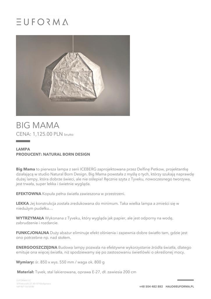 BIG MAMA CENA: 1,125.00 PLN brutto LAMPA PRODUCENT: NATURAL BORN DESIGN Big Mama to pierwsza lampa z serii ICEBERG zaprojektowana przez Delfinę Petkow, projektantkę działającą w studio Natural Born Design. Big Mama powstała z myślą o tych, którzy szukają naprawdę dużej lampy, która dobrze świeci, ale nie oślepia! Ręcznie szyta z Tyveku, nowoczesnego tworzywa, jest trwała, super lekka i świetnie wygląda. EFEKTOWNA Kopuła pełna światła zawieszona w przestrzeni. LEKKA Jej konstrukcja została zredukowana do minimum. Taka wielka lampa a zmieści się w niedużym pudełku… WYTRZYMAŁA Wykonana z Tyveku, który wygląda jak papier, ale jest odporny na wodę, zabrudzenie i rozdarcie. FUNKCJONALNA Duży abażur eliminuje efekt olśnienia i zapewnia dobre światło tam, gdzie jest ono potrzebne np. nad stołem. ENERGOOSZCZĘDNA Budowa lampy pozwala na efektywne wykorzystanie źródła światła, dlatego emituje ona więcej światła, niż spodziewamy się po zastosowaniu świetlówki o określonej mocy. Wymiary: śr. 850 x wys. 550 mm / waga ok. 800 g Materiał: Tyvek, stal lakierowana, oprawa E-27, dł. zawiesia 200 cm Projekt: Delfina Petkow Czas oczekiwania: około 3 tygodni Powered by TCPDF (www.tcpdf.org)