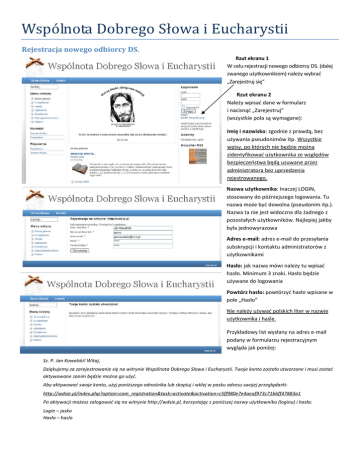 Wspólnota Dobrego Słowa i Eucharystii Rejestracja nowego odbiorcy DS. Rzut ekranu 1 W celu rejestracji nowego odbiorcy DS. (dalej zwanego użytkownikiem) należy wybrać „Zarejestruj się” Rzut ekranu 2 Należy wpisać dane w formularz i nacisnąć „Zarejestruj” (wszystkie pola są wymagane): Imię i nazwisko: zgodnie z prawdą, bez używania pseudonimów itp. Wszystkie wpisy, po których nie będzie można zidentyfikować użytkownika ze względów bezpieczeństwa będą usuwane przez administratora bez uprzedzenia rejestrowanego. Nazwa użytkownika: Inaczej LOGIN, stosowany do późniejszego logowania. Tu nazwa może być dowolna (pseudonim itp.). Nazwa ta nie jest widoczna dla żadnego z pozostałych użytkowników. Najlepiej jakby była jednowyrazowa Adres e-mail: adres e-mail do przesyłania subskrypcji i kontaktu administratorów z użytkownikami Hasło: jak nazwa mówi należy tu wpisać hasło. Minimum 3 znaki. Hasło będzie używane do logowania Powtórz hasło: powtórzyć hasło wpisane w pole „Hasło” Nie należy używać polskich liter w nazwie użytkownika i haśle. Przykładowy list wysłany na adres e-mail podany w formularzu rejestracyjnym wygląda jak poniżej: Sz. P. Jan Kowalski! Witaj, Dziękujemy za zarejestrowanie się na witrynie Wspólnota Dobrego Słowa i Eucharystii. Twoje konto zostało utworzone i musi zostać aktywowane zanim będzie można go użyć. Aby aktywować swoje konto, użyj poniższego odnośnika lub skopiuj i wklej w pasku adresu swojej przeglądarki: http://wdsie.pl/index.php?option=com_registration&task=activate&activation=c5ff980e7e4aeaf973c71bbff47883a1 Po aktywacji możesz zalogować się na witrynie http://wdsie.pl, korzystając z poniższej nazwy użytkownika (loginu) i hasła: Login – jasko Hasło – haslo Po otrzymaniu takiego listu należy kliknąć w link przesłany w e-mail’u bądź skopiować go do przeglądarki. Konto jest już aktywowane. Logowanie Po wpisaniu w pole „Login” nazwy użytkownika, a w pole „Hasło” hasła oraz o naciśnięciu „Zaloguj” użytkownik ma już dostęp do wszystkich usług oferowanych zarejestrowanym użytkownikom. Po zalogowaniu pokazuje się okno, w którym możemy dokonać aktywacji, zmiany, bądź usunięcia subskrypcji newslettera. Newsletter – to list wysyłany codziennie wieczorem (lub inaczej, w zależności od ustaleń ks. Leszka i potrzeb Wspólnoty) zawierający nowodowane artykuły z interesującej nas kategorii. Pracujemy nad tym, aby to okno subskrypcji nie pojawiało się jako „powitalne” po zalogowaniu, lecz to może trochę potrwać. Tymczasem, jeśli nie zamierzamy dokonywać zmian w subskrypcji proszę od razu przejść do strony „Strona główna” Uwaga! Administrator ma możliwość śledzenia daty ostatniego zalogowania. Jeśli zauważony będzie brak logowania przez dłuższy czas konto zostanie usunięte. Aktualnie czas ten ustalony jest na 2 tygodnie braku aktywności. Za wyjątkiem wakacji, w czasie których dopuszczalna jest 2 miesięczna absencja użytkownika. Miłego użytkowania strony ☺