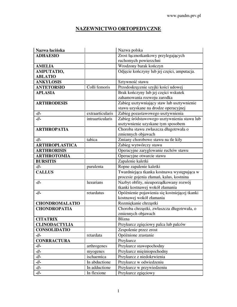 www.pandm.prv.pl NAZEWNICTWO ORTOPEDYCZNE Nazwa polska Zrost łącznotkankowy przylegających ruchomych powierzchni Wrodzony barak kończyn Odjęcie kończyny lub jej części, amputacja. Nazwa łacińska ADHAESIO AMELIA AMPUTATIO, ABLATIO ANKYLOSIS ANTETORSIO APLASIA Colli femoris ARTHRODESIS -//-//- extraarticularis intraarticularis ARTHROPATIA -//ARTHROPLASTICA ARTHRORISIS ARTHROTOMIA BURSITIS -//CALLUS tabica -//- luxurians -//- retardatus purulenta CHONDROMALATIO CHONDROPATIA CITATRIX CLINODACTYLIA CONSOLIDATIO -//CONRRACTURA -//-//-//-//-//-//- retardata arthrogenes myogenes ischaemica In abductione In adductione In flexione Sztywność stawu Przodoskręcenie szyjki kości udowej Brak kończyny lub jej części wskutek zahamowania rozwoju zarodka Zabieg usztywniający staw lub usztywnienie stawu uzyskane na drodze operacyjnej Zabieg pozastawowego usztywnienia Zabieg śródstawowego usztywnienia stawu lub usztywnienie uzyskane tym sposobem Choroba stawu zwłaszcza długotrwała o zmiennych objawach Zmiany chorobowe stawu na tle kiły Zabieg wytwórczy stawu Operacyjne zaryglowanie ruchów stawu Operacyjne otwarcie stawu Zapalenie kaletki Ropne zapalenie kaletki Twardniejąca tkanka kostnawa występująca w procesie gojenia złamań, kalus, kostnina Nazbyt obfity, nieuporządkowany rozwój tkanki kostnawej wokół złamania Opóźnienie pojawienia się kostniejącej tkanki kostnawej wokół złamania Rozmiękanie chrząstki Choroba chrząstki, zwłaszcza długotrwała, o zmiennych objawach Blizna Przykurcz zgięciowy palca lub palców Zespolenie przez zrost Opóźnione zrastanie Przykurcz Przykurcz stawopochodny Przykurcz mięśniopochodny Przykurcz z niedokrwienia Przykurcz w odwiedzeniu Przykurcz w przywiedzeniu Przykurcz zgięciowy 1 www.pandm.prv.pl CONTUSIO CORPUS -//-//COXA -//COXITIS COXARTHROSIS -//DECUBITIS DEFORMATIO DIGITUS DISTORSIO ELONGATIO EPIPHYSELOYSIS EXCISIO EXOSTISIS EXUDATIO FISTULA FRACTURA -//-//-//-//-//-//-//-//-//-//-//-//-//-//-//GANGLION GENU -//-//GIBBUS -//-//GONITIS -//-//-//- alienum liberum semiliberum Valga Vara deformans malleus Articulationis aperta complicata Cum luxatione intraarticularis inveterata lenta Male sanata marginalis obliqua obstretica pathologica recens spiralis transversa superiostalis relaxatum valgum varum costalis spondyliticus exsudativa rheumatica traumatica Stłuczenie Ciało obce (w tkankach) Ciało wolne (w stawie) Ciało półwolne (w stawie) Biodro koślawe Biodro szpotawe Zapalenie stawu biodrowego Zmiany zwyrodnieniowe w stawie biodrowym Zmiany zniekształcające staw biodrowy na tle zwyrodnienia Odleżyna Zniekształcenie Palec młotowaty Skręcenie Wydłużenie operacyjne Złuszczanie nasady Wycięcie Wyrośl kostna Wysięk Przetoka Złamanie Złamanie otwarte Złamanie powikłane Złamanie ze zwichnięciem Złamanie wewnątrzstawowe Złamanie zastarzałe Złamanie powolne Złamanie żle wygojone, wadliwie zrośnięte Złamanie brzeżne Złamanie skośne Złamanie porodowe Złamanie kości chorobowo zmienionej Złamanie świeże Złamanie śrubowe, spiralne Złamanie poprzeczne Złamanie podokostnowe Torbiel galaretowata Kolano wiotkie Kolano koślawe Kolano szpotawe Garb Garb żebrowy Garb gruźliczy Zapalenie stawu kolanowego Wysiękowe zapalenie stawu kolanowego Gośćcowe zapalenie stawu kolanowego Pourazowe zapalenie stawu kolanowego 2 www.pandm.prv.pl -//HALLUX -//-//-//-//-//HYPEREXTENSIO HYPERKYPHOSIS HYPERLORDOSIS IMMOBLISATIO IMPLANTATIO IMPRESSIO INFRACTIO LACERATIO LUXATIO -//- -//-//-//-//-//-//-//MANUS MOBILISATIO MYOTOMIA NECROSIS ASEPTICA OSSIS NEUROTOMIA OSTEOARTHROSIS OSTEOMALATIO OSTEOPHYTUM OSTEOPOROSIS OSTEOCLASIS OSTEOSYNTHESIS OSTEOTOMIA OSTITIS PANATHRITIS PATELLECTOMIA PECTUS PES -//- tuberculosa flexus Gruźlicze zapalenie stawu kolanowego Paluch zgięty podeszwowo w stawie śródstopno paliczkowym malleus Paluch młotowaty zgięty podeszwowo w stawie międzypaliczkowym rigidus Paluch sztywny valgus Paluch koślawy varus Paluch szpotawy duplex Paluch podwójny Przeprost stawu Nadmierna kifoza Nadmierna lordoza Unieruchomienie Wszczepienie Wgniecenie, wgłębienie Nadłamanie, nadpęknięcie Rozdarcie, rozerwanie tkanek Zwichnięcie erecta Zwichnięcie stawu ramiennego z przymusowym uniesieniem ramienia ponad głową marginalis Zwichnięcie brzeżne congenita Zwichnięcie wrodzone infraglenoidalis Zwichnięcie ponadpanewkowe habitualis Zwichnięcie nawykowe paratylica Zwichnięcie porażenne wskutek porażenia pathologica Zwichnięcie patologiczne resiudalis Zwichnięcie resztkowe vara Ręka szpotawa Uruchomienie Przecięcie mięśnia Jałowa martwica kości excavatum equinus Przecięcie nerwu w celu leczniczym Zmiany zwyrodnieniowe stawu Rozmiękanie kości, osteomalacja Wyrośl kostna Osteoporoza Chirurgiczne złamanie kości Operacyjne zespolenie Operacyjne przecięcie kości Zapalenie kości Zapalenie obejmujące całą kość Wycięcie rzepki Klatka piersiowa lejkowata Stopa Stopa końska 3 www.pandm.prv.pl -//-//-//-//-//-//-//-//-//-//-//-//-//- Equino-varus calcaneus Calcaneovalgus excavatus paratyticus planus rhigitus spasticus relaxatus valgus valgo-planus varus Transversoplanus PSEUDOARTHROSIS RELUXATIO REPOSITIO RESECTIO SPINA BIFIDA SPONDYLOLISTHESIS SUBLUXATIO SUTURA SYNOSTOSIS STENOSIS TERGUM ROTUNDUM TORSIO TRANSLOCATIO TRANSPLANTATIO TRANSPOSITIO TRAUMA VARISATIO VARUS VALGISATIO VALGUS Stopa końsko szpotawa Stopa piętowa Stopa piętowo koślawa Stopa wydrążona Stopa porażona Stopa płaska Stopa sztywna Stopa kurczowa, spastyczna Stopa wiotka Stopa koślawa Stopa koślawo płaska Stopa szpotawa Stopa poprzeczno płaska Staw rzekomy Ponowne zwichnięcie po repozycji stawu Nastawienie Wycięcie Rozszczep Kręgozmyk Nadwichnięcie Szew, zeszycie Zrost kości Zwężenie kanału, przewodu lub pochewki Plecy okrągłe Skręcanie, ruch skręcania Przemieszczenie, przeniesienie Przeszczepienie Przeniesienie Uraz Odchylenie, odchylenie szpotawe Szpotawy, Odchylenie, odchylenie kośl