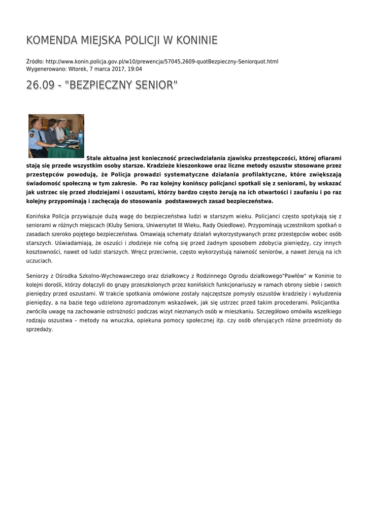 KOMENDA MIEJSKA POLICJI W KONINIE Źródło: http://www.konin.policja.gov.pl/w10/prewencja/57045,2609-quotBezpieczny-Seniorquot.html Wygenerowano: Wtorek, 7 marca 2017, 19:04 26.09 - "BEZPIECZNY SENIOR" Stale aktualna jest konieczność przeciwdziałania zjawisku przestępczości, której ofiarami stają się przede wszystkim osoby starsze. Kradzieże kieszonkowe oraz liczne metody oszustw stosowane przez przestępców powodują, że Policja prowadzi systematyczne działania profilaktyczne, które zwiększają świadomość społeczną w tym zakresie. Po raz kolejny konińscy policjanci spotkali się z seniorami, by wskazać jak ustrzec się przed złodziejami i oszustami, którzy bardzo często żerują na ich otwartości i zaufaniu i po raz kolejny przypominają i zachęcają do stosowania podstawowych zasad bezpieczeństwa. Konińska Policja przywiązuje dużą wagę do bezpieczeństwa ludzi w starszym wieku. Policjanci często spotykają się z seniorami w różnych miejscach (Kluby Seniora, Uniwersytet III Wieku, Rady Osiedlowe). Przypominają uczestnikom spotkań o zasadach szeroko pojętego bezpieczeństwa. Omawiają schematy działań wykorzystywanych przez przestępców wobec osób starszych. Uświadamiają, że oszuści i złodzieje nie cofną się przed żadnym sposobem zdobycia pieniędzy, czy innych kosztowności, nawet od ludzi starszych. Wręcz przeciwnie, często wykorzystują naiwność seniorów, a nawet żerują na ich uczuciach. Seniorzy z Ośrodka Szkolno-Wychowawczego oraz działkowcy z Rodzinnego Ogrodu działkowego"Pawłów" w Koninie to kolejni dorośli, którzy dołączyli do grupy przeszkolonych przez konińskich funkcjonariuszy w ramach obrony siebie i swoich pieniędzy przed oszustami. W trakcie spotkania omówione zostały najczęstsze pomysły oszustów kradzieży i wyłudzenia pieniędzy, a na bazie tego udzielono zgromadzonym wskazówek, jak się ustrzec przed takim procederami. Policjantka zwróciła uwagę na zachowanie ostrożności podczas wizyt nieznanych osób w mieszkaniu. Szczegółowo omówiła wszelkiego rodzaju oszustwa – metody na wnuczka, opiekuna pomocy społecznej itp. czy osób oferujących różne przedmioty do sprzedaży. Mundurowi zawsze uświadamiają seniorom schematy dokonywania kradzieży kieszonkowych, kradzieży torebek damskich w środkach komunikacji miejskiej, na ulicy, czy w innych miejscach. Apelują, aby pod żadnym pretekstem osoby starsze nie podawały danych przez telefon, nie ulegały jakimkolwiek namowom, zwłaszcza oferowanym transakcjom przez osoby obce. Pomimo tego, że spotkania z osobami starszymi dają duże efekty, to jednak wciąż wiele osób nie zdaje sobie sprawy z zagrożenia. Dlatego przypominamy i zachęcamy do stosowania poniższych zasad: Seniorze! Daj sobie czas do namysłu! Po pierwsze: rozmowę z osobą, która podaje się wnuczka czy inną bliską osobę, powinieneś zakończyć komunikatem typu: "Nie mogę teraz podjąć decyzji. Muszę chwilę się zastanowić. Zadzwoń do mnie za pół godziny". Skorzystaj z pomocy bliskich Po zakończeniu rozmowy natychmiast skontaktuj się z kimś bliskim, najlepiej z rodziną wnuczka w celu uzyskania pewności, że osoba która do nas dzwoniła jest tą, za którą się podaje. Dzięki takiemu rozwiązaniu nie będziesz narażony na ryzyko samodzielnego podejmowania decyzji i wspólnie zastanowicie się co zrobić dalej. Koniecznie powiadom Policję! Jeżeli masz wrażenie, że ktoś próbuje Cię oszukać natychmiast powiadom o tym Policję. Zadzwoń do nas na bezpłatny numer alarmowy 997 albo, jeżeli korzystasz z telefonu komórkowego na numer 112. Przekaż dyżurnemu informacje o swoich podejrzeniach. Policjanci natychmiast podejmą odpowiednie działania i pomogą Ci rozwiązać tę sytuację. Nie poniesiesz żadnych konsekwencji nawet, jeżeli telefon od rzekomego wnuczka, nie był próbą oszustwa. Policjanci są po to, aby Cię chronić, nie bój się zwrócić do nas o pomoc. Znane są przypadki, kiedy osoby starsze podejrzewając, że mogą być ofiarą oszustwa, zawiadomiły Policję przed przekazaniem pieniędzy. Dzięki temu udało się zatrzymać takich oszustów i ich pomocników. Inne porady dla starszych osób Nie wpuszczaj do domu nieznanych Ci osób. Poproś rodzinę o wyposażenie drzwi w wizjer, czyli tak zwanego judasza i blokadę drzwi w postaci łańcucha. Wszystkie wizyty instalatorów i innych przedstawicieli administracji są zawsze zapowiadane na tablicy ogłoszeń, jeżeli mieszkasz na wsi, takie informacje mogą być przekazywane za pomocą kurendy. Nie bój się legitymować przychodzących do Ciebie osób przed wpuszczeniem do domu. Nigdy, pod żadnym pozorem nie powierzaj swoich pieniędzy obcym osobom. Kiedy wydaje Ci się, że ktoś próbuje Cię oszukać, natychmiast powiadom Policję. Najlepszym miejscem przechowywania pieniędzy jest konto bankowe. Nie trzymaj dużych sum gotówki w domu, takie miejsca ukrycia pieniędzy jak przysłowiowa skarpetka, szafka z bielizną, skrytka pod materacem, puszka po kawie czy schowanie pieniędzy pomiędzy kartki książki, nie uchronią Twoich pieniędzy przed złodziejem. Ocena: 0/5 (0) Tweetnij