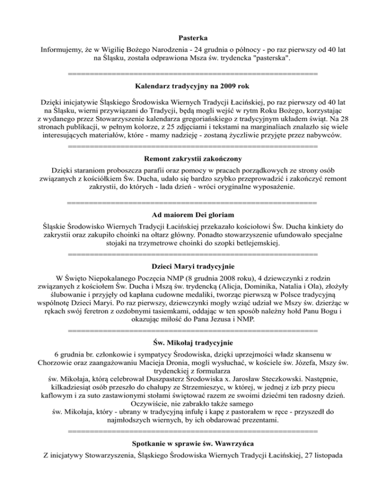 Pasterka Informujemy, że w Wigilię Bożego Narodzenia - 24 grudnia o północy - po raz pierwszy od 40 lat na Śląsku, została odprawiona Msza św. trydencka "pasterska". ========================================================= Kalendarz tradycyjny na 2009 rok Dzięki inicjatywie Śląskiego Środowiska Wiernych Tradycji Łacińskiej, po raz pierwszy od 40 lat na Śląsku, wierni przywiązani do Tradycji, będą mogli wejść w rytm Roku Bożego, korzystając z wydanego przez Stowarzyszenie kalendarza gregoriańskiego z tradycyjnym układem świąt. Na 28 stronach publikacji, w pełnym kolorze, z 25 zdjęciami i tekstami na marginaliach znalazło się wiele interesujących materiałów, które - mamy nadzieję - zostaną życzliwie przyjęte przez nabywców. ========================================================= Remont zakrystii zakończony Dzięki staraniom proboszcza parafii oraz pomocy w pracach porządkowych ze strony osób związanych z kościółkiem Św. Ducha, udało się bardzo szybko przeprowadzić i zakończyć remont zakrystii, do których - lada dzień - wróci oryginalne wyposażenie. ========================================================= Ad maiorem Dei gloriam Śląskie Środowisko Wiernych Tradycji Łacińskiej przekazało kościołowi Św. Ducha kinkiety do zakrystii oraz zakupiło choinki na ołtarz główny. Ponadto stowarzyszenie ufundowało specjalne stojaki na trzymetrowe choinki do szopki betlejemskiej. ========================================================= Dzieci Maryi tradycyjnie W Święto Niepokalanego Poczęcia NMP (8 grudnia 2008 roku), 4 dziewczynki z rodzin związanych z kościołem Św. Ducha i Mszą św. trydencką (Alicja, Dominika, Natalia i Ola), złożyły ślubowanie i przyjęły od kapłana cudowne medaliki, tworząc pierwszą w Polsce tradycyjną wspólnotę Dzieci Maryi. Po raz pierwszy, dziewczynki mogły wziąć udział we Mszy św. dzierżąc w rękach swój feretron z ozdobnymi tasiemkami, oddając w ten sposób należny hołd Panu Bogu i okazując miłość do Pana Jezusa i NMP. ========================================================= Św. Mikołaj tradycyjnie 6 grudnia br. członkowie i sympatycy Środowiska, dzięki uprzejmości władz skansenu w Chorzowie oraz zaangażowaniu Macieja Dronia, mogli wysłuchać, w kościele św. Józefa, Mszy św. trydenckiej z formularza św. Mikołaja, którą celebrował Duszpasterz Środowiska x. Jarosław Steczkowski. Następnie, kilkadziesiąt osób przeszło do chałupy ze Strzemieszyc, w której, w jednej z izb przy piecu kaflowym i za suto zastawionymi stołami świętować razem ze swoimi dziećmi ten radosny dzień. Oczywiście, nie zabrakło także samego św. Mikołaja, który - ubrany w tradycyjną infułę i kapę z pastorałem w ręce - przyszedł do najmłodszych wiernych, by ich obdarować prezentami. ========================================================= Spotkanie w sprawie św. Wawrzyńca Z inicjatywy Stowarzyszenia, Śląskiego Środowiska Wiernych Tradycji Łacińskiej, 27 listopada 2008 roku w Biurze Promocji Miasta w Bytomiu odbyło się spotkanie robocze poświęcone szczegółom powrotu kościółka drewnianego na swoje miejsce w Parku Miejskim w Bytomiu. W spotkaniu wzięło udział kilkanaście osób, w tym: Prezydent Miasta Bytomia Piotr Koj, Dziekan Dekanatu Bytomskiego ks. Eugeniusz Gogoliński, Dyrektorzy Miejskiego Zarządu Dróg i Mostów: Marek Jarosz, Robert Białas i Józef Butrym, Miejski Konserwator Zabytków Dominika Kściuczyk, Przedstawiciel Wydziału Promocji i Informacji Iwona Wronka Dyrektor Muzeum Górnośląskiego w Bytomiu Mieczysław Dobkowski, Dyrektor Górnośląskiego Parku Etnograficznego w Chorzowie Piotr Wybraniec i Kierownik Działu Budownictwa Ludowego w Parku Etnograficznego w Chorzowie Barbara Heidenreich oraz historyk Przemysław Nadolski, kolekcjoner Czesław Czerwiński i Krzysztof Przybylski Stowarzyszenie reprezentował Prezes Rady Głównej Artur Paczyna. W czasie spotkania, Wice-Prezes Stowarzyszenia Maciej Droń, przedstawił (w formie prezentacji multimedialnej) historię kościółka ze szczególnym uwzględnieniem jego losów bytomskich oraz plany i próby jego odbudowy w latach 80-tych XX wieku. Stało się to przyczynkiem do dyskusji, w czasie której zarysowała się zbieżność stanowisk co do zasadności postulatu powrotu do parku kościółka drewnianego. Podkreślano także, że jest ona zgodna z wolą społeczną. Ponadto, zgromadzeni podkreślali konieczność rozszerzenia funkcji kościółka o funkcje sakralne (liturgia), potwierdzając stanowisko Stowarzyszenia. Niewielkie różnice zdań pojawiły się dopiero w czasie dyskutowania kwestii związanych z odbudową. Niektórzy uczestnicy postulowali, aby sprowadzić inny obiekt zabytkowy, z kolei inni, żeby odbudować wykorzystując bezpieczniejszą technologię. Uzgodniono, że z decyzją należy poczekać do czasu otrzymania kosztorysu obu rozwiązań. Wskazywano natomiast na skutki wyboru jednego z przyjętych rozwiązań. Spotkanie zakończyło się prezentacją odnalezionej dokumentacji związanej z planami odbudowy kościółka. Mamy nadzieję, że już niedługo będziemy mogli przekazać dalsze szczegóły, dotyczące realizacji naszej inicjatywy, ========================================================= Ślub w starym rycie W dniu 27 września w kościele św. Ducha odbył sie pierwszy po ponad czterdziestu latach ślub w klasycznym rycie rzymskim. Miłość, wierność i uczciwośc małżeńską ślubowali sobie Lidia Barcewicz i Daniel Zając. ========================================================= Pielgrzymka Tradycji na Jasną Górę Już po raz piąty, setki tradycjonalistów z całej Polski, w tym kilkunastu wiernych skupionych wokół Śląskiego Środowiska Wiernych Tradycji Łacińskiej i Mszy św. trydenckiej w Bytomiu, pielgrzymowali do Pani Jasnogórskiej, aby ponownie dziękować Jej za wstawiennictwo w prośbach zanoszonych do Boga w s
