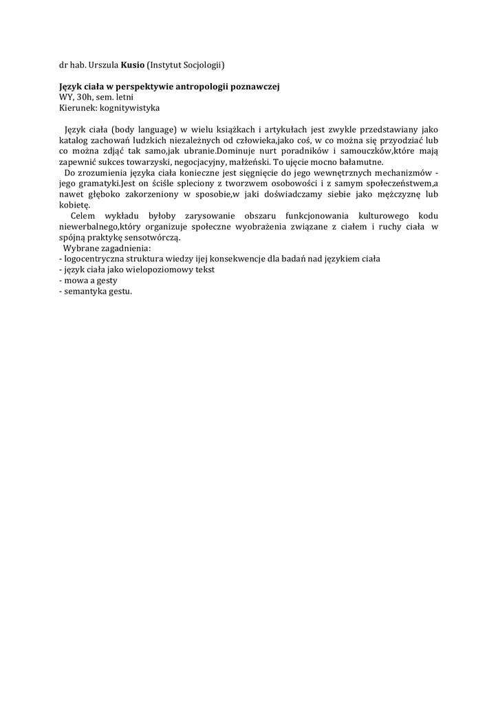 dr hab. Urszula Kusio (Instytut Socjologii) Język ciała w perspektywie antropologii poznawczej WY, 30h, sem. letni Kierunek: kognitywistyka Język ciała (body language) w wielu książkach i artykułach jest zwykle przedstawiany jako katalog zachowań ludzkich niezależnych od człowieka,jako coś, w co można się przyodziać lub co można zdjąć tak samo,jak ubranie.Dominuje nurt poradników i samouczków,które mają zapewnić sukces towarzyski, negocjacyjny, małżeński. To ujęcie mocno bałamutne. Do zrozumienia języka ciała konieczne jest sięgnięcie do jego wewnętrznych mechanizmów -‐ jego gramatyki.Jest on ściśle spleciony z tworzwem osobowości i z samym społeczeństwem,a nawet głęboko zakorzeniony w sposobie,w jaki doświadczamy siebie jako mężczyznę lub kobietę. Celem wykładu byłoby zarysowanie obszaru funkcjonowania kulturowego kodu niewerbalnego,który organizuje społeczne wyobrażenia związane z ciałem i ruchy ciała w spójną praktykę sensotwórczą. Wybrane zagadnienia: -‐ logocentryczna struktura wiedzy ijej konsekwencje dla badań nad językiem ciała -‐ język ciała jako wielopoziomowy tekst -‐ mowa a gesty -‐ semantyka gestu.