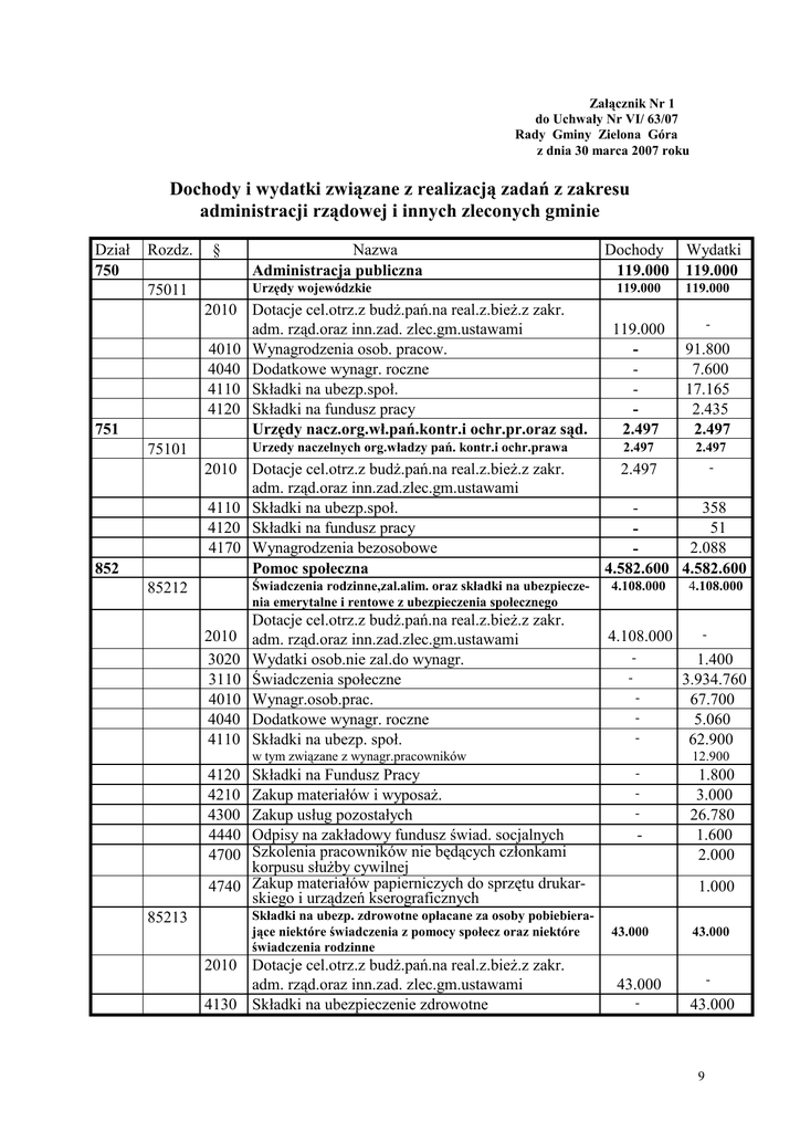 Załącznik Nr 1 do Uchwały Nr VI/ 63/07 Rady Gminy Zielona Góra z dnia 30 marca 2007 roku Dochody i wydatki związane z realizacją zadań z zakresu administracji rządowej i innych zleconych gminie Dział 750 Rozdz. § Nazwa Administracja publiczna Urzędy wojewódzkie 75011 2010 Dotacje cel.otrz.z budŜ.pań.na real.z.bieŜ.z zakr. adm. rząd.oraz inn.zad. zlec.gm.ustawami 4010 Wynagrodzenia osob. pracow. 4040 Dodatkowe wynagr. roczne 4110 Składki na ubezp.społ. 4120 Składki na fundusz pracy Urzędy nacz.org.wł.pań.kontr.i ochr.pr.oraz sąd. 751 119.000 119.000 2.497 - 2.497 2010 Dotacje cel.otrz.z budŜ.pań.na real.z.bieŜ.z zakr. adm. rząd.oraz inn.zad.zlec.gm.ustawami 4110 Składki na ubezp.społ. 4120 Składki na fundusz pracy 4170 Wynagrodzenia bezosobowe Pomoc społeczna 2.497 Świadczenia rodzinne,zal.alim. oraz składki na ubezpieczenia emerytalne i rentowe z ubezpieczenia społecznego 85212 2010 3020 3110 4010 4040 4110 Dotacje cel.otrz.z budŜ.pań.na real.z.bieŜ.z zakr. adm. rząd.oraz inn.zad.zlec.gm.ustawami Wydatki osob.nie zal.do wynagr. Świadczenia społeczne Wynagr.osob.prac. Dodatkowe wynagr. roczne Składki na ubezp. społ. Składki na Fundusz Pracy Zakup materiałów i wyposaŜ. Zakup usług pozostałych Odpisy na zakładowy fundusz świad. socjalnych Szkolenia pracowników nie będących członkami korpusu słuŜby cywilnej 4740 Zakup materiałów papierniczych do sprzętu drukarskiego i urządzeń kserograficznych 85213 Składki na ubezp. zdrowotne opłacane za osoby pobiebierające niektóre świadczenia z pomocy społecz oraz niektóre świadczenia rodzinne 2010 Dotacje cel.otrz.z budŜ.pań.na real.z.bieŜ.z zakr. adm. rząd.oraz inn.zad. zlec.gm.ustawami 4130 Składki na ubezpieczenie zdrowotne 91.800 7.600 17.165 2.435 2.497 2.497 - 358 51 2.088 4.582.600 4.582.600 4.108.000 4.108.000 - w tym związane z wynagr.pracowników 4120 4210 4300 4440 4700 Wydatki 119.000 119.000 Urzedy naczelnych org.władzy pań. kontr.i ochr.prawa 75101 852 Dochody 119.000 4.108.000 - 1.400 3.934.760 67.700 5.060 62.900 12.900 - - 1.800 3.000 26.780 1.600 2.000 1.000 43.000 43.000 - 43.000 - 43.000 9 85214 Zasiłki i pomoc w naturze oraz skł. na ubezp. emeryt.i rent. 431.600 431.600 2010 Dotacje cel.otrz.z budŜ.pań.na real.z.bieŜ.z zakr. adm. rząd.oraz inn.zad.zlec.gm.ustawami 431.600 3110 Świadczenia społeczne 431.600 RAZEM 4.704.097 4.704.097 10