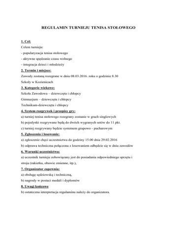 REGULAMIN TURNIEJU TENISA STOŁOWEGO 1. Cel: Celem turnieju: - popularyzacja tenisa stołowego - aktywne spędzanie czasu wolnego - integracja dzieci i młodzieży 2. Termin i miejsce: Zawody zostaną rozegrane w dniu 08.03.2016. roku o godzinie 8.30 Szkoły w Kozienicach 3. Kategorie wiekowe: Szkoła Zawodowa – dziewczęta i chłopcy Gimnazjum – dziewczęta i chłopcy Technikum-dziewczęta i chłopcy 4. System rozgrywek i przepisy gry: a) turniej tenisa stołowego rozegrany zostanie w grach singlowych b) pojedynki rozgrywane będą do dwóch wygranych setów do 11 pkt. c) turniej rozgrywany będzie systemem grupowo - pucharowym 5. Zgłoszenia i losowanie: a) zgłoszenie chęci uczestnictwa do godziny 15.00 dnia 29.02.2016 b) odprawa techniczna połączona z losowaniem odbędzie się w dniu zawodów 6. Warunki uczestnictwa: a) uczestnik turnieju zobowiązany jest do posiadania odpowiedniego sprzętu i stroju (rakietka, obuwie zmienne, itp.), 7. Organizator zapewnia: a) obsługę sędziowską i techniczną, b) nagrody w postaci medali i dyplomów 8. Uwagi końcowe b) ostateczna interpretacja regulaminu należy do organizatora.