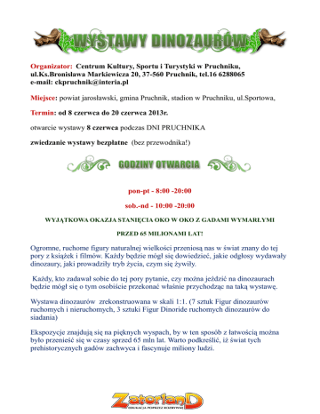 Organizator: Centrum Kultury, Sportu i Turystyki w Pruchniku, ul.Ks.Bronisława Markiewicza 20, 37-560 Pruchnik, tel.16 6288065 e-mail: [email protected] Miejsce: powiat jarosławski, gmina Pruchnik, stadion w Pruchniku, ul.Sportowa, Termin: od 8 czerwca do 20 czerwca 2013r. otwarcie wystawy 8 czerwca podczas DNI PRUCHNIKA zwiedzanie wystawy bezpłatne (bez przewodnika!) pon-pt - 8:00 -20:00 sob.-nd - 10:00 -20:00 WYJĄTKOWA OKAZJA STANIĘCIA OKO W OKO Z GADAMI WYMARŁYMI PRZED 65 MILIONAMI LAT! Ogromne, ruchome figury naturalnej wielkości przeniosą nas w świat znany do tej pory z książek i filmów. Każdy będzie mógł się dowiedzieć, jakie odgłosy wydawały dinozaury, jaki prowadziły tryb życia, czym się żywiły. Każdy, kto zadawał sobie do tej pory pytanie, czy można jeździć na dinozaurach będzie mógł się o tym osobiście przekonać właśnie przychodząc na taką wystawę. Wystawa dinozaurów zrekonstruowana w skali 1:1. (7 sztuk Figur dinozaurów ruchomych i nieruchomych, 3 sztuki Figur Dinoride ruchomych dinozaurów do siadania) Ekspozycje znajdują się na pięknych wyspach, by w ten sposób z łatwością można było przenieść się w czasy sprzed 65 mln lat. Warto podkreślić, iż świat tych prehistorycznych gadów zachwyca i fascynuje miliony ludzi. T-Rex – ruchomy (wymiary: 5.5 m*1 m*2.3 m )-ruchomy 1 mały T-Rex (wymiary: 1.8 m*0.5 m*1.2 m) – nieruchomy Welociraptor –(wymiary: 2.1 m*1.4 m*1.2 m) – nieruchomy Apatozaur (wymiary: 7 m*1.2 m*3 m) – ruchomy Muszaur – (wymiary: 1.8 m*0.6 m*1.3 m) – nieruchomy Deinonych- (wymiary 3m*0,5*1,2m)- ruchomy Triceratops: (wymiary: 3.5 m*1,5m*8m- ruchomy) Dinoride: ruchome dinozaury, na których dzieci mogą usiąść i bujać się. Dinozatorland sp.z.o.o. zapewnia obsługę. Atrakcja jest odpłatna 5 zł od osoby Kriolofozaur (wymiary: 4 m*1.1 m*1.6 m) Stegozaur (wymiary: 2 m*0,8 m* 1,2 m) T-Rex (wymiary: 4.5 m*1.2 m*2 m)