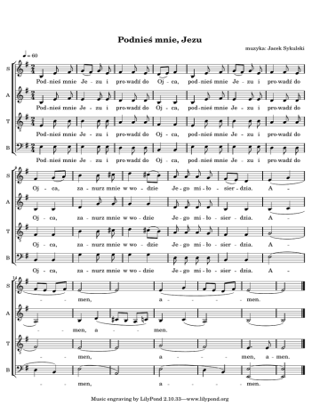 Podnieś mnie, Jezu muzyka: Jacek Sykulski S 2 4 = 60 A 42 pro wadź do Pod nieś mnie Je zu i pro wadź do 2 4 S zu i Pod nieś mnie Je Pod nieś mnie Je Oj Oj Oj Oj T ca, ca, B 14 S A T 8 B ca, Oj pro wadź do Oj pro wadź do nurz mnie w wo za nurz mnie w wo za dzie za nurz mnie w wo dzie ca, pod nieś mnie Je zu i pro wadź do pro wadź do ca, zu i pod nieś mnie Je pod nieś mnie Je men, sier Je go mi ło sier dzia. sier dzia. Je go mi ło a men, men. men, zu i sier dzia. dzia. pro wadź do A A a ca, A A men, pro wadź do zu i Je go mi ło dzie pod nieś mnie Je ca, Je go mi ło dzie nurz mnie w wo Oj za 8 ca, Oj zu i 8 A zu i 8 B Pod nieś mnie Je 42 T men. a a Music engraving by LilyPond 2.10.33—www.lilypond.org men, men. a men.