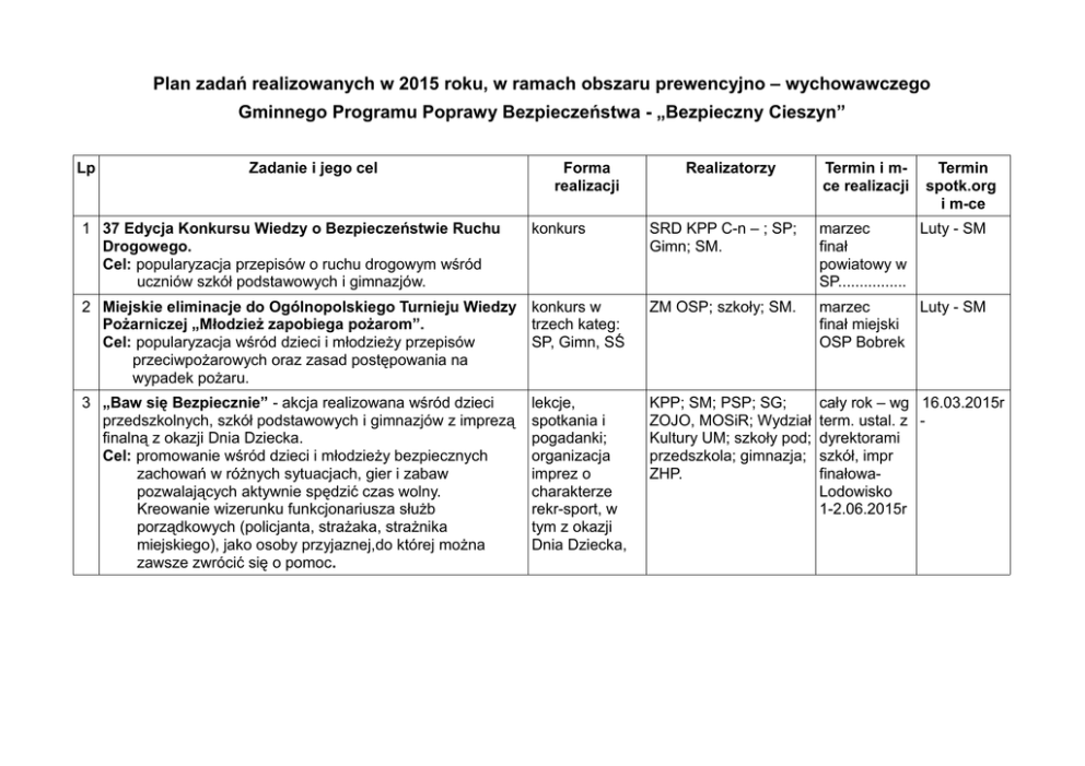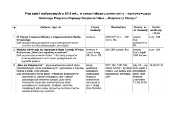 Plan zadań realizowanych w 2015 roku, w ramach obszaru prewencyjno – wychowawczego Gminnego Programu Poprawy Bezpieczeństwa - „Bezpieczny Cieszyn” Lp Zadanie i jego cel 1 37 Edycja Konkursu Wiedzy o Bezpieczeństwie Ruchu Drogowego. Cel: popularyzacja przepisów o ruchu drogowym wśród uczniów szkół podstawowych i gimnazjów. Forma realizacji konkurs Realizatorzy Termin i mce realizacji Termin spotk.org i m-ce SRD KPP C-n – ; SP; Gimn; SM. marzec Luty - SM finał powiatowy w SP................ 2 Miejskie eliminacje do Ogólnopolskiego Turnieju Wiedzy konkurs w Pożarniczej „Młodzież zapobiega pożarom”. trzech kateg: Cel: popularyzacja wśród dzieci i młodzieży przepisów SP, Gimn, SŚ przeciwpożarowych oraz zasad postępowania na wypadek pożaru. ZM OSP; szkoły; SM. marzec Luty - SM finał miejski OSP Bobrek 3 „Baw się Bezpiecznie” - akcja realizowana wśród dzieci przedszkolnych, szkół podstawowych i gimnazjów z imprezą finalną z okazji Dnia Dziecka. Cel: promowanie wśród dzieci i młodzieży bezpiecznych zachowań w różnych sytuacjach, gier i zabaw pozwalających aktywnie spędzić czas wolny. Kreowanie wizerunku funkcjonariusza służb porządkowych (policjanta, strażaka, strażnika miejskiego), jako osoby przyjaznej,do której można zawsze zwrócić się o pomoc. KPP; SM; PSP; SG; ZOJO, MOSiR; Wydział Kultury UM; szkoły pod; przedszkola; gimnazja; ZHP. cały rok – wg 16.03.2015r term. ustal. z dyrektorami szkół, impr finałowaLodowisko 1-2.06.2015r lekcje, spotkania i pogadanki; organizacja imprez o charakterze rekr-sport, w tym z okazji Dnia Dziecka, 4 „Bezpieczna szkoła” - cykl spotkań z dziećmi, młodzieżą Spotkania, pedagogami szkolnymi i nauczycielami, poświęconych patrole SM edukacji w zakresie odpowiedzialności nieletnich, odpowiedzialności karnej, przestępczości, uprawnień i obowiązków nauczycieli, jako funkcjonariuszy publicznych oraz poznanie zasad postępowania w przypadku stwierdzenia demoralizacji, czynów karalnych lub przestępstw oraz nadzór nad terenami przyszkolnymi podczas dużych przerw pod kątem zachowania młodzieży i eliminacji osób niepożądanych. Cel: zacieśnienie współpracy pedagogów szkolnych z Policją i Strażą Miejską w zakresie sygnalizowania zagrożeń oraz inicjowania działań zapobiegawczych, zmierzających do ograniczenie przestępczości i patologii w środowisku szkolnym. KPP C-n; SM; dyrektorzy szkół; pedagodzy szkolni; nauczyciele cały rok – wg Styczeń term. ustal. z …................ dyrektorami i SM nauczyciela mi 5 „Bezpieczna kąpiel” - impreza dla młodzieży gimnazjalnej oraz dla wczasowiczów. Cel: promowanie bezpiecznych zachowań podczas wypoczynku nad wodą, zabaw w wodzie i skoków do wody oraz nauka reanimacji. impreza rekreacyjnosportowa na kąpielisku miejskim WOPR; SM; MOSIR; czerwiec; lipiec/sierp maj …................ SM 6 „Narkotykowe Dylematy” - akcja skierowana do różnych środowisk, szczególnie do młodzieży gimnazjalnej, przeciwdziałająca narkomanii /alkoholizmowi/ nikotynizmowi. Cel: ograniczenie zjawiska narkomanii wśród dzieci i młodzieży, a także uświadomienie społeczeństwu skali problemu oraz włączenie różnych podmiotów do współpracy w zakresie zapobiegania narkomanii/ alkoholizmowi/nikotynizmowi. lekcje, KPP C-n; SM; Dom spotkania i Narodowy; gimnazja pogadanki, impreza podsumowując a październik Wrzesień …............... SM 7 „Bezpieczna droga do szkoły” - spotkania z dziećmi klas pierwszych szkół podstawowych. Cel: zapoznanie dzieci klas pierwszych szkół podstawowych z zasadami poruszania się po drodze oraz pokazanie wpływu elementów odblaskowych na bezpieczeństwo uczestników ruchu drogowego. lekcje, pogadanki w szkołach, wyposażenie dzieci w element odblaskowe KPP C-n; SM; szkoły podstawowe 8 „Bezpieczne osiedle”- akcja całoroczna, skierowana do mieszkańców osiedli. Cel: zacieśnienie współpracy mieszkańców osiedli ze Strażą Miejską i Policją w zakresie sygnalizowania zagrożeń oraz inicjowania działań zapobiegawczych, zmierzających do ograniczenia przestępczości, poprawy bezpieczeństwa oraz promowania bezpiecznych zachowań w miejscu zamieszkania. spotkania służb porz. z mieszkańcami oraz radami osiedlowymi, broszury, plakaty, ulotki Dzielnicowi KPP, Straż cały rok Miejska, Spółdzielnie Mieszkaniowe, Rady osiedlowe kwiecień …................ SM 9 „Bezdomny, bezradny, samotny” - podprogram realizowany w okresie zimowym, polegający na udzielaniu pomocy bezdomnym i samotnym. rozpoznanie, inform. o możl. uzysk. pomocy (nocleg, posił., kąpiel, ubranie) oraz bezp. pomoc w syt. tego wymagaj. Straż Miejska, Miejski Ośrodek Pomocy Społecznej, służba zdrowia, KPP oraz stowarzyszenia pozarządowe realizujące zadania pomocowe. Październik …................ SM 10 Inne – wynikłe w trakcie roku. wrzesień/paź Sierpień dziernik …................ SM cały rok, okres zimowy