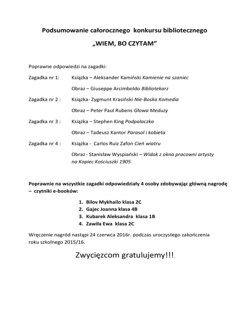 Podsumowanie całorocznego konkursu bibliotecznego „WIEM, BO CZYTAM” Poprawne odpowiedzi na zagadki: Zagadka nr 1: Książka – Aleksander Kamiński Kamienie na szaniec Obraz – Giuseppe Arcimboldo Bibliotekarz Zagadka nr 2 : Książka- Zygmunt Krasiński Nie-Boska Komedia Obraz – Peter Paul Rubens Głowa Meduzy Zagadka nr 3 : Książka – Stephen King Podpalaczka Obraz – Tadeusz Kantor Parasol i kobieta Zagadka nr 4 : Książka - Carlos Ruiz Zafon Cień wiatru Obraz - Stanisław Wyspiański – Widok z okna pracowni artysty na Kopiec Kościuszki 1905 Poprawnie na wszystkie zagadki odpowiedziały 4 osoby zdobywając główną nagrodę – czytniki e-booków: 1. 2. 3. 4. Bilov Mykhailo klasa 2C Gajec Joanna klasa 4B Kubarek Aleksandra klasa 1B Zawiła Ewa klasa 2C Wręczenie nagród nastąpi 24 czerwca 2016r. podczas uroczystego zakończenia roku szkolnego 2015/16. Zwycięzcom gratulujemy!!!