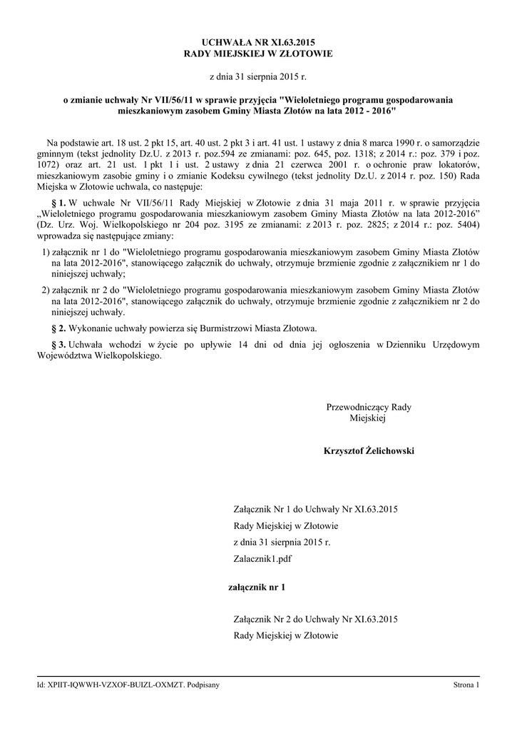 UCHWAŁA NR XI.63.2015 RADY MIEJSKIEJ W ZŁOTOWIE z dnia 31 sierpnia 2015 r. o zmianie uchwały Nr VII/56/11 w sprawie przyjęcia "Wieloletniego programu gospodarowania mieszkaniowym zasobem Gminy Miasta Złotów na lata 2012 - 2016" Na podstawie art. 18 ust. 2 pkt 15, art. 40 ust. 2 pkt 3 i art. 41 ust. 1 ustawy z dnia 8 marca 1990 r. o samorządzie gminnym (tekst jednolity Dz.U. z 2013 r. poz.594 ze zmianami: poz. 645, poz. 1318; z 2014 r.: poz. 379 i poz. 1072) oraz art. 21 ust. 1 pkt 1 i ust. 2 ustawy z dnia 21 czerwca 2001 r. o ochronie praw lokatorów, mieszkaniowym zasobie gminy i o zmianie Kodeksu cywilnego (tekst jednolity Dz.U. z 2014 r. poz. 150) Rada Miejska w Złotowie uchwala, co następuje: § 1. W uchwale Nr VII/56/11 Rady Miejskiej w Złotowie z dnia 31 maja 2011 r. w sprawie przyjęcia „Wieloletniego programu gospodarowania mieszkaniowym zasobem Gminy Miasta Złotów na lata 2012-2016” (Dz. Urz. Woj. Wielkopolskiego nr 204 poz. 3195 ze zmianami: z 2013 r. poz. 2825; z 2014 r.: poz. 5404) wprowadza się następujące zmiany: 1) załącznik nr 1 do "Wieloletniego programu gospodarowania mieszkaniowym zasobem Gminy Miasta Złotów na lata 2012-2016", stanowiącego załącznik do uchwały, otrzymuje brzmienie zgodnie z załącznikiem nr 1 do niniejszej uchwały; 2) załącznik nr 2 do "Wieloletniego programu gospodarowania mieszkaniowym zasobem Gminy Miasta Złotów na lata 2012-2016", stanowiącego załącznik do uchwały, otrzymuje brzmienie zgodnie z załącznikiem nr 2 do niniejszej uchwały. § 2. Wykonanie uchwały powierza się Burmistrzowi Miasta Złotowa. § 3. Uchwała wchodzi w życie po upływie 14 dni od dnia jej ogłoszenia w Dzienniku Urzędowym Województwa Wielkopolskiego. Przewodniczący Rady Miejskiej Krzysztof Żelichowski Załącznik Nr 1 do Uchwały Nr XI.63.2015 Rady Miejskiej w Złotowie z dnia 31 sierpnia 2015 r. Zalacznik1.pdf załącznik nr 1 Załącznik Nr 2 do Uchwały Nr XI.63.2015 Rady Miejskiej w Złotowie Id: XPIIT-IQWWH-VZXOF-BUIZL-OXMZT. Podpisany Strona 1 z dnia 31 sierpnia 2015 r. Zalacznik2.pdf załącznik nr 2 Id: XPIIT-IQWWH-VZXOF-BUIZL-OXMZT. Podpisany Strona 2 Załącznik nr 1 do uchwały nr XI.63.2015 z dnia 31 sierpnia 2015 r. Załącznik nr 1 do Wieloletniego Programu Gospodarowania Mieszkaniowym Zasobem Gminy Miasto Złotów Ocena i podział budynków mieszkalnych na trzy grupy ze względu na ich stan techniczny oraz opłacalność remontów i modernizacji ( w nawiasach podano rok budowy). GRUPA I Budynki przeznaczone do rozbiórki w okresie 0 – 15 lat ze względu na zły stan techniczny i zbyt wysoki koszt utrzymania (remontu); 1. Plac Kościuszki 14a (1920) 2. Obr. Warszawy 9 (1879) 3. Obr. Warszawy 25 (1879) GRUPA II Budynki oceniane jako dostateczne pod względem spełnienia wymogów technicznych i eksploatacyjnych. Ze względu na stopień zużycia i nieopłacalność długoterminowego inwestowania przeznaczone do rozbiórki w okresie 15 – 30 lat: 1. 2. 3. 4. 5. 6. 7. 8. 9. Domańskiego 13 (1890) Domańskiego 15 (1900) Podolska 4 (1849) Polna 15 (1870) Towarowa 2 (1889) Królowej Jadwigi 85 (1900) Nowy Rynek 1 (1849) Nowy Rynek 2 (1869) Nowy Rynek 5 (1879) GRUPA II Budynki w dobrym stanie technicznym, które rokują możliwość ich utrzymania ponad 30 lat. Stosowne jest przeprowadzanie remontów kapitalnych i wszelkich modernizacji tych budynków: 1. Aleja Piasta 9 (1959) 2. Aleja Piasta 13 (1910) 3. Aleja Piasta 17 (1900) 4. Aleja Piasta 18 (1964) 5. Aleja Piasta 21A 6. Aleja Piasta 27 (1910) 7. Aleja Piasta 35 (1890) 8. Aleja Piasta 44 (1930) 9. Aleja Piasta 47 (1920) 10. Aleja Piasta 48 (1920) 11. Aleja Piasta 51 (1920) 12. Aleja Piasta 55 (1910) 1 13. Aleja Piasta 57 - 59 14. Boh. Westerplatte 2 (1977) 15. Boh. Westerplatte 24 (1963) 16. Boh. Westerplatte 25 (1958) 17. Boh. Westerplatte 26 (1963) 18. Boh. Westerplatte 27 (1958) 19. Boh. Westerplatte 29 (1959) 20. Bolesława Chrobrego 2 (1801) 21. Bolesława Chrobrego 3 (1849) 22. Bolesława Chrobrego 9 (1909) 23. Domańskiego 8 (1915) 24. Domańskiego 8A (1915) 25. Domańskiego 10 (1900) 26. Domańskiego 12 (1910) 27. Domańskiego 16 (1900) 28. Domańskiego 16 A (2009) 29. Domańskiego 24 (1910) 30. Domańskiego 45 (1930) 31. Domańskiego 48 (1920) 32. Domańskiego 50 (1900) 33. Dworzaczka 6 (1859) 34. Dworzaczka 7 (1829) 35. Dworzaczka 12 (1868) 36. Grochowskiego 1 (1930) 37. Grochowskiego 2 (1930) 38. Grochowskiego 5 (1900) 39. Kopernika 1 (1920) 40. Kopernika 3 (1961) 41. Królowej Jadwigi 6 (1930) 42. Królowej Jadwigi 6A 43. Królowej Jadwigi 15 (1957) 44. Królowej Jadwigi 26 (1920) 45. Królowej Jadwigi 58 (1966) 46. Królowej Jadwigi 62 (1920) 47. Krzywoustego 4 (1970) 48. Krzywoustego 7 (1970) 49. Aleja Mickiewicza 3 (1910) 50. Aleja Mickiewicz 9 (1870) 51. Aleja Mickiewicza 10 (1910) 52. Aleja Mickiewicza 11 (1910) 53. Aleja Mickiewicza 11 a 54. Aleja Mickiewicza 13 a 55. Aleja Mickiewicza 17 (1925) 56. Mokra 3 (1900) 57. Moniuszki 5 (1920) 58. Moniuszki 12 (1967) 59. Moniuszki 13 (1965) 60. Moniuszki 14 (1964) 61. Nieznanego Żołnierza 1 (1920) 62. Obrońców Warszawy 11 (1889) 63. Obrońców Warszawy 14 (1909) 64. Obrońców Warszawy 27b 2 65. Obrońców Warszawy 30 (1890) 66. Obrońców Warszawy 35 (1899) 67. Obrońców Warszawy 39 (1910) 68. Obrońców Warszawy 40 (1915) 69. Obrońców Warszawy 42 (1869) 70. Obrońców Warszawy 45 (1957) 71. Obrońców Warszawy 47 (1930) 72. Panny Marii 1 (1889) 73. Piotra Skargi 3 (1899) 74. Plac Kościuszki 6a (1960) 75. Plac Kościuszki 7 (1900) 76. Plac Kościuszki 8 (1900) 77. Plac Kościuszki 11 (1910) 78. Plac Kościuszki 12 (1894) 79. Plac Kościuszki 13 (1894) 80. Plac Kościuszki 14 (1920) 81. Plac Paderewskiego 5 (1986) 82. Plac Paderewskiego 6 (1889) 83. Plac Paderewskiego 7 (1899) 84. Plac Paderewskiego 8 (1889) 85. Plac Paderewskiego 11 (1879) 86. Plac Wolności 9 (1920) 87. Podolska 3 (1879) 88. Powstańców 1 (1983) 89. Półwiejska 1 (2007) 90. Stary Rynek 7 (1914) 91. Stary Rynek 9 (1924) 92. Sta