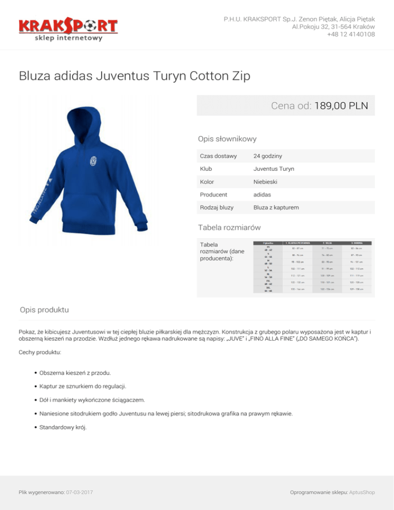 P.H.U. KRAKSPORT Sp.J. Zenon Piętak, Alicja Piętak Al.Pokoju 32, 31-564 Kraków +48 12 4140108 Bluza adidas Juventus Turyn Cotton Zip Cena od: 189,00 PLN Opis słownikowy Czas dostawy 24 godziny Klub Juventus Turyn Kolor Niebieski Producent adidas Rodzaj bluzy Bluza z kapturem Tabela rozmiarów Tabela rozmiarów (dane producenta): Opis produktu Pokaz, że kibicujesz Juventusowi w tej ciepłej bluzie piłkarskiej dla mężczyzn. Konstrukcja z grubego polaru wyposażona jest w kaptur i obszerną kieszeń na przodzie. Wzdłuż jednego rękawa nadrukowane są napisy: „JUVE” i „FINO ALLA FINE” („DO SAMEGO KOŃCA”). Cechy produktu: Obszerna kieszeń z przodu. Kaptur ze sznurkiem do regulacji. Dół i mankiety wykończone ściągaczem. Naniesione sitodrukiem godło Juventusu na lewej piersi; sitodrukowa grafika na prawym rękawie. Standardowy krój. Plik wygenerowano: 07-03-2017 Oprogramowanie sklepu: AptusShop P.H.U. KRAKSPORT Sp.J. Zenon Piętak, Alicja Piętak Al.Pokoju 32, 31-564 Kraków +48 12 4140108 Warianty produktu M 189,00 PLN Galeria Plik wygenerowano: 07-03-2017 Powered by TCPDF (www.tcpdf.org) Oprogramowanie sklepu: AptusShop