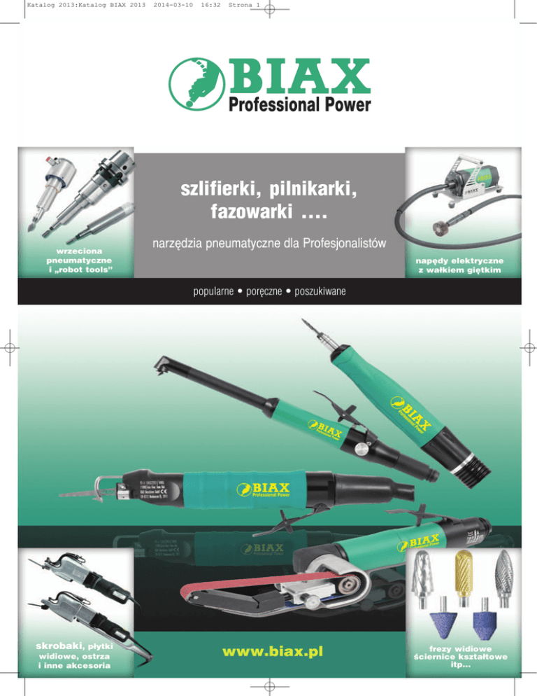 Katalog 2013:Katalog BIAX 2013 2014-03-10 16:32 Strona 1 szlifierki, pilnikarki, fazowarki …. wrzeciona pneumatyczne i „robot tools’’ narzędzia pneumatyczne dla Profesjonalistów napędy elektryczne z wałkiem giętkim popularne · poręczne · poszukiwane skrobaki, płytki widiowe, ostrza i inne akcesoria www.biax.pl frezy widiowe ściernice kształtowe itp... Katalog 2013:Katalog BIAX 2013 2014-03-10 16:32 Strona 2 nowość wyrzynarka - pilarka - polerka - pilnikarka BIAX PS-25 skok narzędzia 25 mm (!!!) niskie wibracje dedykowana zwłaszcza do obróbki – cięcia blach stalowych o wysokiej wytrzymałości wydajność cięcia brzeszczotami BIAX o wysokiej jakości jakośc Czas [sekundy] dla długości cięcia =100 mm materiał: blacha stalowa o grubości = 1 mm, wytrzymałość na rozciąganie = 382 N/mm2 parametry cięcia: nacisk narzędzia = 12 N, praca na sucho, częstotliwość skoku = 6000 1/min. ciśnienie powietrza = 7 bar 26 24 22 20 18 16 14 12 10 8 5 Ilość cięć: 7 9 11 13 15 17 19 21 23 25 27 29 30 cięć, po 100 mm długości każde, na 1 brzeszczot brzeszczot BIAX high quality brzeszczot ogólnie dostępny w handlu Moc, [W] 340 włącznik napędu dźwigniowy kierunek wylotu powietrza tył częstotliwość skoku, [1/min] 6000 długość skoku, [mm] 25 ciśnienie robocze, [bar] 7 zużycie powietrza, [ l/min] 280 hałas, [dB(A)] 70 wibracje, [m/s2] 3,83 masa, [g] 1400 max. średnica uchwytu narzędzia [mm] / max. masa narzędzia, [ g]: 4 /20 uchwyt narzędzia, max. 4 przewód powietrzny w dostawie numer do zamówienia 150 322 910 wyposażenie standardowe w kuferku: przewód powietrzny, ok. 80 cm długości; 4 brzeszczoty: 14/18/24/32 tpi (zębów/cal) 2 klucze montażowe dostępne brzeszczoty 32 TPI 24 TPI cienkie blachy stalowe o dużej wytrzymałości o grubości do 1,5 mm: 32 tpi (pakowane po 10 szt) nr zamów. 007 012 393 podwójne− i potrójne arkusze blach, do 4 mm grubości: 24 tpi (pakowane po 10 szt) nr zamów. 007 012 392 aluminium, tworzywa sztuczne: 18 tpi (pakowane po 10 szt) nr zamów. 007 012 391 14 tpi (pakowane po 10 szt) nr zamów. 007 012 390 drewno, kompozyty, sklejka, tworzywa sztuczne : więcej informacji na temat PS-25 patrz strona www.biax.pl 18 TPI 14 TPI Katalog 2013:Katalog BIAX 2013 2014-03-10 16:32 Strona 3 nowa rodzina wiertarek pneumatycznych BP 500 - 6000 nowość - bardzo ergonomiczne - przyjazny uchwyt - gumowa rękojeść - miękki start - małe, lekkie, poręczne - dostępnych jest 6 prędkości: 500; 800; 1.000; 2.600; 4.500; 6.000 obr/min - wbudowany tłumik hałasu - obrotowa końcówka wylotu powietrza - pałąk - zaczep do podwieszenia - szybkomocujący uchwyt wiertarski – na życzenie typ: BP 500 BP 800 BP 1000 BP 2600 BP 4500 BP 6000 obroty, [obr/min]: moc, [W]: 500 800 1000 2600 4500 6000 160 160 160 160 160 160 zużycie powietrza, [ l/min]: 450 450 450 450 450 450 hałas, [dB(A)]: 72 72 74 75 74 74 hałas w/g normy, [ISO]: masa, [g]: 15744 15744 15744 15744 15744 15744 gwint przyłączeniowy, R: 740 8 1/8 740 8 1/8 740 8 1/8 700 8 1/8 700 8 1/8 700 8 1/8 wibracje, [m/s2]: < 2,5 4,3 6,0 3,1 3,1 5,2 wibracje wg normy, [ISO]: 28927-5 28927-5 28927-5 28927-5 28927-5 28927-5 Ø wewnętrzna przewodu, [mm]: 7 7 7 7 7 7 numer do zamówienia: 150 210 100 150 210 200 150 210 300 150 210 000 150 210 400 150 210 500 max. Ø wiertła, [mm]: Katalog 2013:Katalog BIAX 2013 2014-03-11 21:53 Strona 4 nowość MB 30E dzięki wbudowanemu chipowi - urządzenie samoczynnie dobiera moc do chwilowego obciążenia nowy, mocniejszy napęd elektryczny z wałkiem giętkim przy przeciążeniu - urządzenie się zatrzymuje moc 1.300 W 5.000÷15.000 obr/min W 618 numer zamówieniowy 020 000 600 W 618-45 numer zamówieniowy 020 000 605 KGE 18 numer zamówieniowy 020 000 200 numer zamówieniowy 032 001 000 opis zakres obrotów, [obr/min] moc, [W] masa, [kg] napięcie, [V/Hz] połączenie gwintowane więcej informacji na temat MB 30E patrz strona www.biax.pl MB 30E 5.000 ÷ 15.000 1.300 5,2 230/50 M10 x 30 od strony napędu Katalog 2013:Katalog BIAX 2013 2014-03-10 16:32 Strona 5 spis treści strona 1. nowości BIAX ........................................................................................................................................ 2 2. o firmie BIAX .......................................................................................................................................... 7 3. szlifierki bezolejowe „oil-free” na 100.000; 65.000; 50.000 i 85.000 obr/min ........................................ 8 4. szlifierki mini, szybkoobrotowe „high-speed” na 85.000 obr/min ............................................................ 9 5. szlifierki mini, szyboobrotowe „high-speed” na 55.000 obr/min ............................................................ 10 6. szlifierki wszechstronne „high-power” na 45.000 obr/min .................................................................... 11 7. szlifierki mocne „high-power” na 30.000 obr/min ................................................................................ 12 8. szlifierki „high-power” : krótkie, średnie, długie; na 20.000 obr/min...................................................... 14 9. solidne szlifierki „high-power” na 20.000 obr/min ................................................................................ 15 10. szlifierki do prac zgrubnych i polerowania na 18.000 do 10.000 obr/min ............................................ 16 11. szlifierki kątowe na 85.000 i 20.000 obr/min .................................................................................... 17 12. szlifierki kątowe na 20.000 i 13.000 obr/min .................................................................................... 18 13. szlifierki taśmowe na 20.000 obr/min..................................................................................................19 14. fazowarki (gratownice) kątowe.................................................