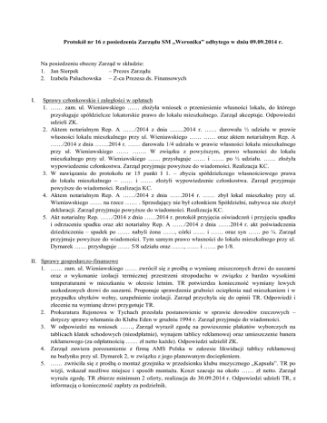 Protokół nr 16 z posiedzenia Zarządu SM „Weronika” odbytego w dniu 09.09.2014 r. Na posiedzeniu obecny Zarząd w składzie: 1. Jan Sierpek – Prezes Zarządu 2. Izabela Paluchowska – Z-ca Prezesa ds. Finansowych I. Sprawy członkowskie i zaległości w opłatach 1. …… zam. ul. Wieniawskiego …… złożyła wniosek o przeniesienie własności lokalu, do którego przysługuje spółdzielcze lokatorskie prawo do lokalu mieszkalnego. Zarząd akceptuje. Odpowiedzi udzieli ZK. 2. Aktem notarialnym Rep. A ……/2014 z dnia …….2014 r. …… darowała ½ udziału w prawie własności lokalu mieszkalnego przy ul. Wieniawskiego …… …… oraz aktem notarialnym Rep. A ……/2014 z dnia …….2014 r. …… darowała 1/4 udziału w prawie własności lokalu mieszkalnego przy ul. Wieniawskiego …… ……. W związku z powyższym, prawo własności do lokalu mieszkalnego przy ul. Wieniawskiego …… przysługuje …… i …… po ½ udziału. …… złożyła wypowiedzenie członkostwa. Zarząd przyjmuje powyższe do wiadomości. Realizacja KC. 3. W nawiązaniu do protokołu nr 15 punkt I 1. – zbycia spółdzielczego własnościowego prawa do lokalu mieszkalnego – …… i …… złożyli wypowiedzenie członkostwa. Zarząd przyjmuje powyższe do wiadomości. Realizacja KC. 4. Aktem notarialnym Rep. A ……/2014 z dnia ……2014 r. …… zbył lokal mieszkalny przy ul. Wieniawskiego …… na rzecz …… . Sprzedający nie był członkiem Spółdzielni, nabywca nie złożył deklaracji. Zarząd przyjmuje powyższe do wiadomości. Realizacja KC. 5. Akt notarialny Rep. ……/2014 z dnia ……2014 r. protokół przyjęcia oświadczeń i przyjęciu spadku i odrzuceniu spadku oraz akt notarialny Rep. A ……/2014 z dnia ……2014 r. akt poświadczenia dziedziczenia – spadek po …… nabyli żona ……, córki …… i …… oraz syn …… po ¼. Zarząd przyjmuje powyższe do wiadomości. Tym samym prawo własności do lokalu mieszkalnego przy ul. Dymarek …… przysługuje …… 5/8 udziału oraz ……, …… i …… po 1/8. II. Sprawy gospodarczo-finansowe 1. …… zam. ul. Wieniawskiego …… zwrócił się z prośbą o wymianę zniszczonych drzwi do suszarni oraz o wykonanie izolacji termicznej przestrzeni stropodachu w związku z bardzo wysokimi temperaturami w mieszkaniu w okresie letnim. TR potwierdza konieczność wymiany lewych uszkodzonych drzwi do suszarni. Proponuje sprawdzenie grubości ocieplenia nad mieszkaniem i w przypadku ubytków wełny, uzupełnienie izolacji. Zarząd przychyla się do opinii TR. Odpowiedź i zlecenie na wymianę drzwi przygotuje TR. 2. Prokuratura Rejonowa w Tychach przesłała postanowienie w sprawie dowodów rzeczowych – dotyczy sprawy włamania do Klubu Eden w grudniu 1994 r. Zarząd przyjmuje do wiadomości. 3. W odpowiedzi na wniosek ……, Zarząd wyraził zgodę na powieszenie plakatów wyborczych na tablicach klatek schodowych (nieodpłatnie), wynajem tablicy reklamowej oraz umieszczenie banera reklamowego (za odpłatnością …… zł netto każde). Odpowiedzi udzielił ZK. 4. Zarząd zawiera porozumienie z firmą AMS Polska w zakresie likwidacji tablicy reklamowej na budynku przy ul. Dymarek 2, w związku z jego planowanym dociepleniem. 5. …… zwróciła się z prośbą o montaż grzejnika w przedsionku klubu muzycznego „Kapsuła”. TR po wizji, wskazał możliwe miejsce i sposób montażu. Koszt szacuje na około …… zł netto. Zarząd wyraża zgodę. TR zbierze minimum 2 oferty, realizacja do 30.09.2014 r. Odpowiedzi udzieli TR, z informacją o konieczność zapłaty za podzielnik. 6. Wybór wykonawcy – dotyczy wykonania projektu na docieplenie ścian południowych wieżowców – wpłynęły 3 oferty. Zarząd wybiera ofertę nr 2 firma …… Tychy, koszt …… zł netto. Umowę przygotuje KT. 7. …… wystąpiła z prośbą o zmianę zakresu sprzątania budynków wysokich dotyczącą m.in. częstotliwości mycia i zamiatania korytarzy powyżej I piętra. Po obmiarze i przeliczeniu przez TT wynagrodzenie za podany zakres wyniosłoby …… zł. TT przygotuje odpowiedź z propozycją nowych warunków od 01.01.2015 r. 8. TT zgłasza propozycję przycinki 3 drzew, wycinki krzewów i 2 suchych drzew przy nowym parkingu w rejonie budynku przy ul. Witosa 34-38 oraz przycinkę 2 drzew – w rejonie wieżowców i na ryneczku przy ul. Witosa. Wycinka drzew nie wymaga uzyskania zgody Urzędu Miasta. Zarząd wyraża zgodę. TT zbierze oferty na wykonanie ww. robót. 9. …… właściciel Zakładu Usługowego złożył prośbę o rozwiązanie umowy na dyżur awaryjny na mocy porozumienia stron z dniem 01.10.2014 r. …… zwrócił się z prośbą o zawarcie umowy na dyżur awaryjny na warunkach jak z Zakładem Usługowym …… . Zarząd wyraża zgodę. Umowę przygotuje TT. 10. Zarząd akceptuje protokół likwidacji nr 67 z dnia 04.09.2014 r. dotyczący uszkodzonych: wkrętarki i monitora. 11. W nawiązaniu do protokołu nr 12 punkt II 13. TT przekazał wykaz prac wykonanych przez konserwatorów – zaawansowanie prac na poziomie 15% spowodowane urlopem konserwatorów. Zarząd zobowiązuje TT do zintensyfikowania prac na zewnątrz budynków przed sezonem zimowym. 12. Zarząd zawarł aneks z firmą …… dotyczący przesunięcia terminu realizacji umowy nr 17/R/2014 w związku z rozszerzeniem zakresu robót. 13. ZF dokona zakupu prenumeraty biuletynów Wydawnictwa Gofin oraz Gazety Podatkowej – koszt …… zł brutto. 14. Zarząd zawarł umowę z ING Bank Śląski S.A. na prowadzenie rachunku firmowego oraz rachunku oszczędnościowego OKO. III. Wspólnoty 1. …… właściciel Zakładu Usługowego złożył prośbę o rozwiązanie umowy na dyżur awaryjny na mocy porozumienia stron z dniem 01.10.2014 r. …… zwrócił się z prośbą o zawarcie umowy na dyżur awaryjny na warunkach jak z Zakładem Usługowym …… . Zarząd wyraża zgodę. Umowę przygotuje TW. 2. …… Sp. z o.o.