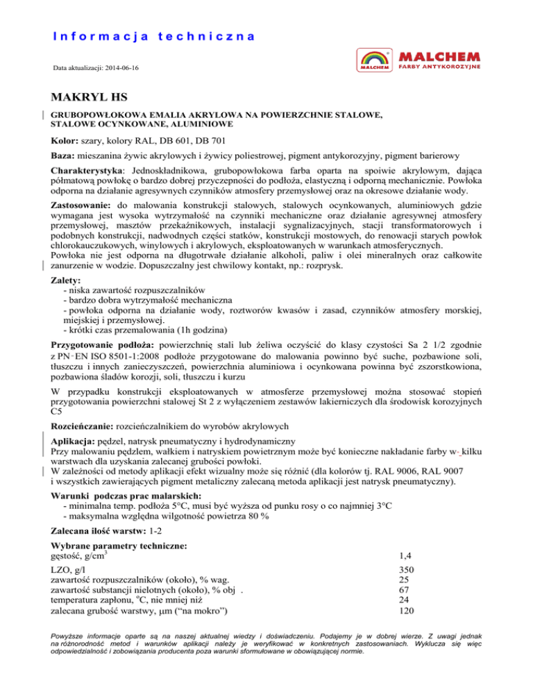 Informacja techniczna Data aktualizacji: 2014-06-16 MAKRYL HS GRUBOPOWŁOKOWA EMALIA AKRYLOWA NA POWIERZCHNIE STALOWE, STALOWE OCYNKOWANE, ALUMINIOWE Kolor: szary, kolory RAL, DB 601, DB 701 Baza: mieszanina żywic akrylowych i żywicy poliestrowej, pigment antykorozyjny, pigment barierowy Charakterystyka: Jednoskładnikowa, grubopowłokowa farba oparta na spoiwie akrylowym, dająca półmatową powłokę o bardzo dobrej przyczepności do podłoża, elastyczną i odporną mechanicznie. Powłoka odporna na działanie agresywnych czynników atmosfery przemysłowej oraz na okresowe działanie wody. Zastosowanie: do malowania konstrukcji stalowych, stalowych ocynkowanych, aluminiowych gdzie wymagana jest wysoka wytrzymałość na czynniki mechaniczne oraz działanie agresywnej atmosfery przemysłowej, masztów przekaźnikowych, instalacji sygnalizacyjnych, stacji transformatorowych i podobnych konstrukcji, nadwodnych części statków, konstrukcji mostowych, do renowacji starych powłok chlorokauczukowych, winylowych i akrylowych, eksploatowanych w warunkach atmosferycznych. Powłoka nie jest odporna na długotrwałe działanie alkoholi, paliw i olei mineralnych oraz całkowite zanurzenie w wodzie. Dopuszczalny jest chwilowy kontakt, np.: rozprysk. Zalety: - niska zawartość rozpuszczalników - bardzo dobra wytrzymałość mechaniczna - powłoka odporna na działanie wody, roztworów kwasów i zasad, czynników atmosfery morskiej, miejskiej i przemysłowej. - krótki czas przemalowania (1h godzina) Przygotowanie podłoża: powierzchnię stali lub żeliwa oczyścić do klasy czystości Sa 2 1/2 zgodnie z PN‑EN ISO 85011:2008 podłoże przygotowane do malowania powinno być suche, pozbawione soli, tłuszczu i innych zanieczyszczeń, powierzchnia aluminiowa i ocynkowana powinna być zszorstkowiona, pozbawiona śladów korozji, soli, tłuszczu i kurzu W przypadku konstrukcji eksploatowanych w atmosferze przemysłowej można stosować stopień przygotowania powierzchni stalowej St 2 z wyłączeniem zestawów lakierniczych dla środowisk korozyjnych C5 Rozcieńczanie: rozcieńczalnikiem do wyrobów akrylowych Aplikacja: pędzel, natrysk pneumatyczny i hydrodynamiczny Przy malowaniu pędzlem, wałkiem i natryskiem powietrznym może być konieczne nakładanie farby w kilku warstwach dla uzyskania zalecanej grubości powłoki. W zależności od metody aplikacji efekt wizualny może się różnić (dla kolorów tj. RAL 9006, RAL 9007 i wszystkich zawierających pigment metaliczny zalecaną metoda aplikacji jest natrysk pneumatyczny). Warunki podczas prac malarskich: - minimalna temp. podłoża 5°C, musi być wyższa od punku rosy o co najmniej 3°C - maksymalna względna wilgotność powietrza 80 % Zalecana ilość warstw: 1-2 Wybrane parametry techniczne: gęstość, g/cm3 1,4 LZO, g/l zawartość rozpuszczalników (około), % wag. zawartość substancji nielotnych (około), % obj . temperatura zapłonu, oC, nie mniej niż zalecana grubość warstwy, m (“na mokro”) 350 25 67 24 120 Powyższe informacje oparte są na naszej aktualnej wiedzy i doświadczeniu. Podajemy je w dobrej wierze. Z uwagi jednak na różnorodność metod i warunków aplikacji należy je weryfikować w konkretnych zastosowaniach. Wyklucza się więc odpowiedzialność i zobowiązania producenta poza warunki sformułowane w obowiązującej normie. Informacja techniczna Data aktualizacji: 2014-06-16 zalecana grubość powłoki, m (”na sucho”) zużycie teoretyczne, dm3/m2 zużycie teoretyczne, kg /m2 Czas wysychania (w temp. 20+/-2°C i wilgotności względnej 55+/-5%) - stopień 1, min - stopień 3, h - całkowite wyschnięcie, h do nałożenia kolejnych warstw - najkrótszy , h - najdłuższy, dni 80 0,12 0,17 15 1 168 1 nieograniczony Podane parametry mogą ulec zmianie wraz ze zmianą warunków otoczenia, ilości i grubości warstw. Przechowywanie: w zamkniętych pojemnikach z dala od ognia i źródeł ciepła. Chronić dzieci przed dostępem do wyrobu. Temperatura przechowywania od 5°C do 30 °C Norma: PN-C-81921:2004. Wyrób powinien odpowiadać wymaganiom normy przez 12 mies. od daty produkcji Uwaga. Wyrób zawiera szkodliwe substancje lotne. Stosować w pomieszczeniach zamkniętych tylko przy sprawnie działającej wentylacji. Chronić dzieci przed dostępem do wyrobu. Powyższe informacje oparte są na naszej aktualnej wiedzy i doświadczeniu. Podajemy je w dobrej wierze. Z uwagi jednak na różnorodność metod i warunków aplikacji należy je weryfikować w konkretnych zastosowaniach. Wyklucza się więc odpowiedzialność i zobowiązania producenta poza warunki sformułowane w obowiązującej normie.