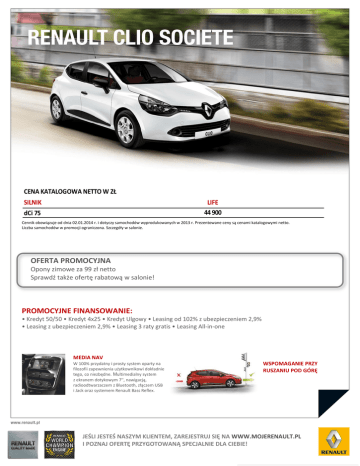 CENA KATALOGOWA NETTO W ZŁ SILNIK LIFE 44 900 dCi 75 Cennik obowiązuje od dnia 02.01.2014 r. i dotyczy samochodów wyprodukowanych w 2013 r. Prezentowane ceny są cenami katalogowymi netto. Liczba samochodów w promocji ograniczona. Szczegóły w salonie. OFERTA PROMOCYJNA Opony zimowe za 99 zł netto Sprawdź także ofertę rabatową w salonie! PROMOCYJNE FINANSOWANIE: • Kredyt 50/50 • Kredyt 4x25 • Kredyt Ulgowy • Leasing od 102% z ubezpieczeniem 2,9% • Leasing z ubezpieczeniem 2,9% • Leasing 3 raty gratis • Leasing All-in-one MEDIA NAV W 100% przydatny i prosty system oparty na filozofii zapewnienia użytkownikowi dokładnie tego, co niezbędne. Multimedialny system z ekranem dotykowym 7'', nawigacją, radioodtwarzaczem z Bluetooth, złączem USB i Jack oraz systemem Renault Bass Reflex. WSPOMAGANIE PRZY RUSZANIU POD GÓRĘ JEŚLI JESTEŚ NASZYM KLIENTEM, ZAREJESTRUJ SIĘ NA WWW.MOJERENAULT.PL I POZNAJ OFERTĘ PRZYGOTOWANĄ SPECJALNIE DLA CIEBIE! WYPOSAŻENIE Life BEZPIECZEŃSTWO CZYNNE I BIERNE ABS z s ys temem ws poma ga ni a na głego ha mowa ni a Przedni a podus zka powi etrzna ki erowcy i pa s a żera Deza ktywa cja podus zki powi etrznej pa s a żera z przodu Boczne podus zki powi etrzne Regul a tor - ogra ni czni k prędkoś ci Sys tem ws poma ga ni a rus za ni a pod górę (Hi l l Sta rt As s i s t) Sys tem dyna mi cznej kontrol i toru ja zdy (ESC) z funkcją za pobi ega ni a poś l i zgowi kół pędnych przy rus za ni u (ASR) Sygna ł ni eza pi ętych pa s ów bezpi eczeńs twa Przedni e pa s y bezpi eczeńs twa z regul a cją wys okoś ci , ogra ni czni ki em na pi ęci a i na pi na czem ● ● ● ● ● ● ● ● ● WYGLĄD ZEWNĘTRZNY Zderza k przedni i tyl ny w kol orze na dwozi a Górna l i s twa ozdobna chłodni cy w kol orze l ś ni ącej czerni z chromowa nym l ogo Rena ul t Boczne l i s twy ochronne i l i s twa zderza ka tyl nego w kol orze cza rnym o zi a rni s tej fa kturze Obudowa l us terek bocznych w kol orze cza rnym Przedni e zewnętrzne kl a mki drzwi w kol orze cza rnym Tyl ne zewnętrzne kl a mki drzwi ukryte przy tyl nym s łupku Tyl ny s pojl er da chowy Sta l owe obręcze kół 15", wzór Extreme La ki er meta l i zowa ny / meta l i zowa ny s pecja l ny La ki er ni emeta l i zowa ny / ni emeta l i zowa ny s pecja l ny ● ● ● ● ● ● ● 81 1545/1707 0/528 WYGLĄD WNĘTRZA Tona cja gra fi towa wnętrza Ta pi cerka cza rno-czerwona Fortuna te Wewnętrzne kl a mki drzwi chromowa ne ● ● ● WIDOCZNOŚĆ I OŚWIETLENIE Świ a tła przeci wmgłowe P Świ a tła do ja zdy dzi ennej z di oda mi LED Lus terka boczne regul owa ne el ektryczni e, podgrzewa ne, z czujni ki em tempera tury zewnętrznej ● Wyci era czki przedni e o zmi ennej częs totl i woś ci pra cy P Automa tyczne włącza ni e tyl nej wyci era czki podcza s cofa ni a ● ● PROWADZENIE POJAZDU i URZĄDZENIA KONTROLNE Ka rta Rena ul t s terująca centra l nym za mki em i s łużąca do urucha mi a ni a a uta (za mi a s t kl uczyka ) El ektryczne, zmi enne wpoma ga ni e ukła du ki erowni czego Ins ta l a cja do monta żu a l a rmu ● ● 244 Ki erowni ca z regul a cją wys okoś ci i głębokoś ci ● Komputer pokła dowy ● Zes pół ws ka źni ków a na l ogowo-cyfrowych ● Ws ka źni k zmi a ny bi egów ● Autos tra dowy tryb pra cy ki erunkows ka zów ● Zes ta w do na pra wy opon ● Koło za pa s owe 252 KOMFORT Kl i ma tyza cja ma nua l na 1626/P Szyby przedni e regul owa ne el ektryczni e ● Os łona przeci ws łoneczna z za myka nym l us terki em po s troni e ki erowcy ● Os łona przeci ws łoneczna po s troni e pa s a żera bez l us terka ● Fotel ki erowcy z regul a cją wys okoś ci ● Za główki przedni e z regul a cją wys okoś ci ● Przegroda oddzi el a jąca częś ć pa s a żers ką od ła dunkowej 0 Life MULTIMEDIA Ins ta l a cja do monta żu ra di oodtwa rza cza Sys tem Rena ul t BASS REFLEX Ra di oodtwa rza cz 2x20W, zi ntegrowa ny wyś wi etl a cz, Bl uetooth®, gni a zdo USB i ja ck MEDIA NAV: mul ti medi a l ny s ys tem z ekra nem dotykowym 7", na wi ga cją, ra di oodtwa rza czem 4x20W, Bl uetooth® , gni a zdem USB i ja ck ● ● P P PAKIETY Pa ki et Kl i ma t: kl i ma tyza cja ma nua l na , ra di oodtwa rza cz z Bl uetooth, zła cze USB i Ja ck ora z Ba s s Refel x Pa ki et Komfort: kl i ma tyza cja ma nua l na , s ys tem mul ti medi a l ny Medi a Na v z ekra nem dotykowym 7", na wi ga cją, ra di oodtwa rza czem z Bl uetooth®, złączem USB i Ja ck ora z Ba s s Refl ex Pa ki et PLUS: ś wi a tła przeci wmgłowe, wyci era czka o zmi ennej częs totl i woś ci pra cy 2358 4065 407 ● = seryjnie P = element pakietu - = niedostępne Niektóre opcje wymagają zamówienia dodatkowego wyposażenia opcjonalnego lub wykluczają się wzajemnie. Szczegóły u Autoryzowanych Partnerów Renault DANE TECHNICZNE dCi 75 SILNIKI Typ s krzyni bi e gów Norma e mi s ji s pa l i n Poje mnoś ć s kokowa (cm3) Rodza j wtrys ku Rodza j pa l i wa me cha ni czna 5-bi e gowa Euro 5 1 461 be zpoś re dni z Common Ra i l di e s e l turbo, wtrys k be zpoś re dni z common ra i l 55 (75) przy 4000 200 przy (1750) Typ s i l ni ka Moc ma ks yma l na w kW EWG (KM) przy (obr./mi n) Ma ks yma l ny mome nt obrotowy Nm EWG przy (obr./mi n) zmi e nne e l e ktryczne ws poma ga ni e ukła du ki e rowni cze go (w s ta nda rdzi e ) Ukła d ki e rowni czy 15” : 185 / 65 R15 88T Wymi a ry opon s ta nda rdowych OSIĄGI 168 14"3 19”1 / 35”8 Prędkoś ć ma ks yma l na (km/h) 0 - 100 km/h (s ) 400 m ze s ta rtu za trzyma ne go / 1000 m ze s ta rtu za trzyma ne go (s ) ZUŻYCIE PALIWA I EMISJA CO2 95 4,3/3,2/3,6 Emi s ja CO2 (g/km) Cykl mi e js ki / poza mi e js ki / mi e s za ny (l /100 km) POJEMNOŚĆ BAGAŻNIKA VDA Poje mnoś ć ba ga żni ka (VDA) w dm 3 do wys okoś ci tyl ne j półki Poje mnoś ć ma ks yma l na (do wys okoś ci da chu) 563 911 POJEMNOŚĆ Poje mnoś ć zbi orni ka pa l i wa (I ) 45 MASA (KG) Ma s a wła s na poja zdu (be z opcji )