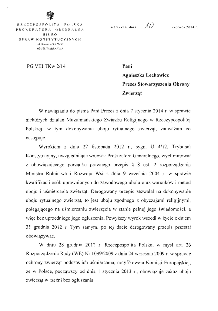 RZECZPOSPOLITA PROKURATURA POLSKA GENERALNA Warszawa, dnia /( L/ c z e r w c a 2 0 1 4 r. BIURO SPRAW KONSTYTUCYJNYCH ul. Rakowiecka 26/30 02-528 WARSZAWA PGVIIITKw2/14 Pani Agnieszka Lechowicz Prezes Stowarzyszenia Obrony Zwierząt W nawiązaniu do pisma Pani Prezes z dnia 7 stycznia 2014 r. w sprawie niektórych działań Muzułmańskiego Związku Religijnego w Rzeczypospolitej Polskiej, w tym dokonywania uboju rytualnego zwierząt, zauważam co następuje. Wyrokiem z dnia 27 listopada 2012 r., sygn. U 4/12, Trybunał Konstytucyjny, uwzględniając wniosek Prokuratora Generalnego, wyeliminował z obowiązującego porządku prawnego przepis § 8 ust. 2 rozporządzenia Ministra Rolnictwa i Rozwoju Wsi z dnia 9 września 2004 r. w sprawie kwalifikacji osób uprawnionych do zawodowego uboju oraz warunków i metod uboju i uśmiercania zwierząt. Derogowany przepis zezwalał na dokonywanie uboju rytualnego zwierząt, to jest uboju zgodnego z obyczajami religijnymi, polegającego na uśmiercaniu zwierzęcia w stanie pełnej jego świadomości, a więc bez uprzedniego jego ogłuszenia. Powyższy wyrok wszedł w życie z dniem 31 grudnia 2012 r. Tym samym, po tej dacie derogowany przepis przestał obowiązywać. W dniu 28 grudnia 2012 r. Rzeczpospolita Polska, w myśl art. 26 Rozporządzenia Rady (WE) Nr 1099/2009 z dnia 24 września 2009 r. w sprawie ochrony zwierząt podczas ich uśmiercania, notyfikowała Komisji Europejskiej, że w Polsce, począwszy od dnia l stycznia 2013 r., obowiązuje zakaz uboju zwierząt w rzeźni bez ogłuszania. W dniu 17 marca 2014 r. Prokurator Generalny skierował do Trybunału Konstytucyjnego swoje stanowisko sygn. PG VIII TK 139/13 w zawisłej w Trybunale sprawie z wniosku Związku Gmin Wyznaniowych Żydowskich w Rzeczypospolitej Polskiej, sygn. K 52/13. Wniosek Związku zmierzał do uchylenia zakazu stosowania uboju rytualnego. Stanowisko Prokuratora Generalnego zmierza do utrzymania zakazu dokonywania uboju zwierząt bez uprzedniego pozbawienia ich świadomości, jak również omawia podstawowe problemy związane z ubojem rytualnym, dokonywanym zarówno zgodnie z wymogami judaizmu (szechita), jak i islamu (halal). Wspomniane stanowisko Prokuratora Generalnego przesyłam w załączeniu. Natomiast, opisane przez Panią Prezes nieprawidłowości w działalności Muzułmańskiego Związku Religijnego w Rzeczypospolitej Polskiej oraz rozłam w Związku na tle finansowej nieodpowiedzialności Muftiego to głównie sfera stosowania prawa i jako takie nie podlegają kognicji Trybunału Konstytucyjnego. Tym samym, Prokurator Generalny nie jest uprawniony do skierowania w tej sprawie wniosku do Trybunału Konstytucyjnego. Nadto, fakt dezaktualizacji części unormowań ustawy z dnia 21 kwietnia 1936 r. o stosunku Państwa do Muzułmańskiego Związku Religijnego w Rzeczypospolitej Polskiej (Dz. U. Nr 30, póz. 240) - czy to w związku z upływem czasu, czy też w związku z brzmieniem ustawy z dnia 17 maja 1989 r. o gwarancjach wolności sumienia i wyznania (Dz. U. z 2005 r. Nr 231, póz. 1965, ze zmianami) może zostać końwalidowany jedynie w trybie ewentualnego postępowania legislacyjnego, a nie w toku postępowania przed Trybunałem Konstytucyjnym. Stanowisko Prokuratora Generalnego z dnia 17 marca 2014 r., sygn. PG VIII TK 139/13.