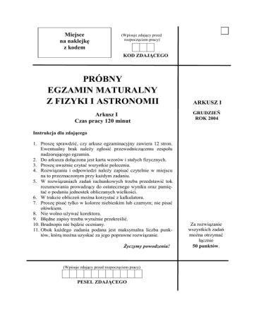 Miejsce na naklejkę z kodem (Wpisuje zdający przed rozpoczęciem pracy) KOD ZDAJĄCEGO PRÓBNY EGZAMIN MATURALNY Z FIZYKI I ASTRONOMII Arkusz I Czas pracy 120 minut ARKUSZ I GRUDZIEŃ ROK 2004 Instrukcja dla zdającego 1. Proszę sprawdzić, czy arkusz egzaminacyjny zawiera 12 stron. Ewentualny brak należy zgłosić przewodniczącemu zespołu nadzorującego egzamin. 2. Do arkusza dołączona jest karta wzorów i stałych fizycznych. 3. Proszę uważnie czytać wszystkie polecenia. 4. Rozwiązania i odpowiedzi należy zapisać czytelnie w miejscu na to przeznaczonym przy każdym zadaniu. 5. W rozwiązaniach zadań rachunkowych trzeba przedstawić tok rozumowania prowadzący do ostatecznego wyniku oraz pamiętać o podaniu jednostek obliczanych wielkości. 6. W trakcie obliczeń można korzystać z kalkulatora. 7. Proszę pisać tylko w kolorze niebieskim lub czarnym; nie pisać ołówkiem. 8. Nie wolno używać korektora. 9. Błędne zapisy trzeba wyraźnie przekreślić. 10. Brudnopis nie będzie oceniany. 11. Obok każdego zadania podana jest maksymalna liczba punktów, którą można uzyskać za jego poprawne rozwiązanie. Życzymy powodzenia! (Wpisuje zdający przed rozpoczęciem pracy) PESEL ZDAJĄCEGO Za rozwiązanie wszystkich zadań można otrzymać łącznie 50 punktów. Próbny egzamin maturalny z fizyki i astronomii Arkusz egzaminacyjny I Zadanie 1. (1 pkt) Siła napędowa samochodu wynosi 3000 N a siły oporów ruchu 1000 N. Od pewnego momentu jazdy na samochód ten zaczęła działać dodatkowa siła oporu o wartości 3000 N. Od tego momentu samochód zaczął poruszać się A. w tę samą stronę, co przedtem, ale z większym przyspieszeniem. B. w tę samą stronę, co przedtem, ale ruchem jednostajnym. C. w tę samą stronę, co przedtem, ale ruchem opóźnionym. D. w przeciwną stronę niż przedtem ruchem opóźnionym. odpowiedź Zadanie 2. (1 pkt) Na pewnej planecie, w pobliżu jej powierzchni, każdy kamień spada z przyspieszeniem około 5m/s2 (na powierzchni Ziemi z przyspieszeniem około 10 m/s2). Może to oznaczać, że A. planeta ta ma taką samą masę jak Ziemia, ale dwukrotnie mniejszy promień. B. planeta ta ma masę 2 razy większą od masy Ziemi, a jej promień jest taki sam jak Ziemi. C. planeta ta ma taką samą masę jak Ziemia, ale dwukrotnie większy promień. D. planeta ta ma masę 2 razy mniejszą od masy Ziemi, a jej promień jest taki sam jak Ziemi. odpowiedź Zadanie 3. (1 pkt) Wewnątrz gwiazdy duża część materii jest zjonizowana. Większość masy gwiazdy to swobodne protony. Dwa takie protony, znajdujące się początkowo w niewielkiej odległości od siebie, będą pod wpływem elektrycznych sił wzajemnego oddziaływania A. oddalać się od siebie ruchem jednostajnym. B. oddalać się od siebie ruchem jednostajnie przyspieszonym (ze stałym przyspieszeniem). C. oddalać się od siebie ruchem niejednostajnie przyspieszonym z malejącym przyspieszeniem. D. oddalać się od siebie ruchem niejednostajnie przyspieszonym z rosnącym przyspieszeniem. odpowiedź Zadanie 4. (1 pkt) Pod względem własności elektrycznych dzielimy substancje na przewodniki, półprzewodniki i izolatory. Można o nich powiedzieć, że ze wzrostem temperatury opór właściwy A. przewodników rośnie, półprzewodników maleje, a izolatorów jest zawsze duży. B. przewodników rośnie, półprzewodników i izolatorów maleje. C. przewodników maleje, półprzewodników rośnie a izolatorów jest zawsze duży. D. przewodników rośnie, półprzewodników i izolatorów jest duży niezależnie od temperatury. odpowiedź Strona 2 z 12 Próbny egzamin maturalny z fizyki i astronomii Arkusz egzaminacyjny I Zadanie 5. (1 pkt) Mamy dwa zbiorniki z gazem. W zbiorniku A znajduje się 2 kg gazu w temperaturze T, a w zbiorniku B 1 kg takiego samego gazu w temperaturze 2 T. Który z wniosków przedstawionych poniżej jest prawdziwy? A. Energia wewnętrzna gazu w obu zbiornikach jest jednakowa, a w zbiorniku B cząsteczki poruszają się średnio dwa razy szybciej. B. Energia wewnętrzna gazu w obu zbiornikach jest jednakowa, a w zbiorniku B cząsteczki mają dwa razy większą średnią energię kinetyczną. C. W zbiorniku A energia wewnętrzna jest większa niż w B, a średnia energia cząsteczek w zbiorniku B jest mniejsza niż cząsteczek w zbiorniku A. D. W zbiorniku A energia wewnętrzna jest mniejsza niż w B, a średnia energia cząsteczek w zbiorniku B jest większa niż w zbiorniku A. odpowiedź Zadanie 6. (1 pkt) Do elektroskopu przykręcamy płytkę, którą następnie elektryzujemy ujemnie. Po oświetleniu płytki silną wiązką światła obserwujemy, że płytka przestała być naelektryzowana (wskazówka elektroskopu opada). Zaobserwowaliśmy efekty zjawiska A. B. C. D. fotoelektrycznego zewnętrznego. całkowitego wewnętrznego odbicia. elektryzowania przez indukcję. dyfrakcji światła. odpowiedź Zadanie 7. (1 pkt) W pogodny dzień trudno zaobserwować osoby siedzące w samochodzie z zamkniętymi oknami, ponieważ przeszkadza w tym światło odbite od powierzchni szyby. Używając specjalnego filtra można jednak zaobserwować wnętrze samochodu. Wykorzystuje się w tym przypadku zjawisko A. B. C. D. interferencji światła. polaryzacji światła. dyfrakcji światła. załamania światła. odpowiedź Strona 3 z 12 Próbny egzamin maturalny z fizyki i astronomii Arkusz egzaminacyjny I Zadanie 8. (1 pkt) W trakcie zderzenia dwa samochody uległy częściowemu zniszczeniu. Oznacza to, że A. energia kinetyczna pojazdów po zderzeniu jest mniejsza niż przed zderzeniem, bo energia wewnętrzna samochodów zmalała. B. energia kinetyczna pojazdów jest mniejsza niż przed zderzeniem, a energia wewnętrzna samochodów wzrosła. C. energia kinetyczna pojazdów jest większa niż przed zderzeniem, bo energia wewnętrzna samochodów wzrosła. D. energia kinetyczna pojazdów jest większa niż przed zderzeniem, a energia wewnętrzna samochodów zmalała. odpowiedź Zada