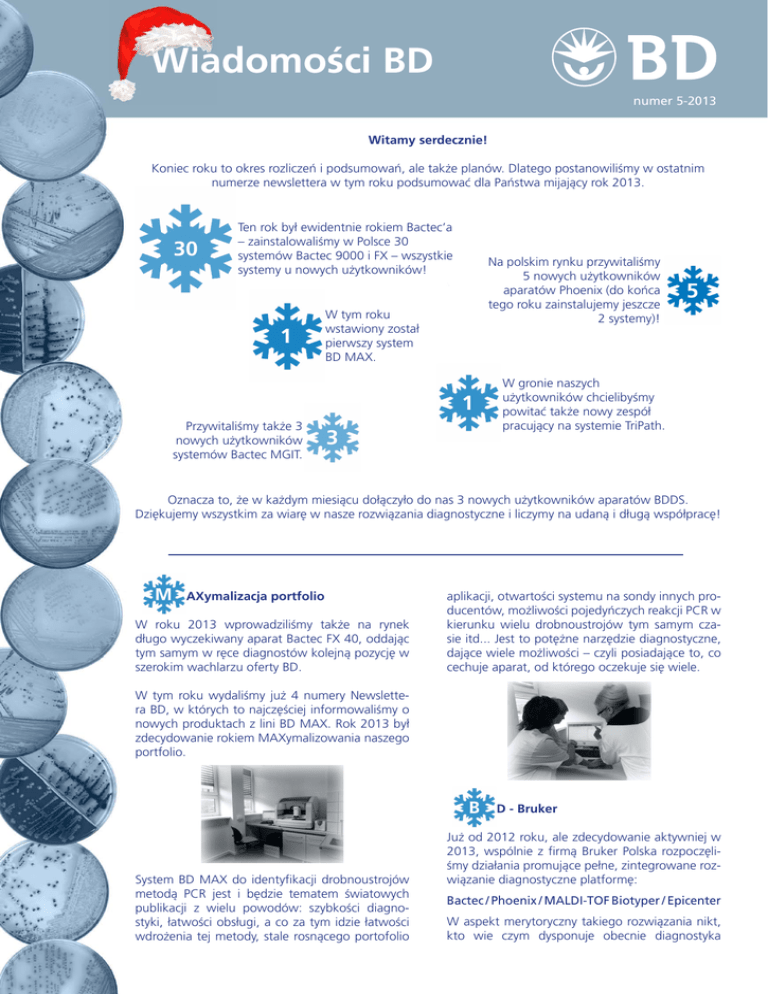 Wiadomości BD numer 5-2013 Witamy serdecznie! Koniec roku to okres rozliczeń i podsumowań, ale także planów. Dlatego postanowiliśmy w ostatnim numerze newslettera w tym roku podsumować dla Państwa mijający rok 2013. 30 Ten rok był ewidentnie rokiem Bactec’a – zainstalowaliśmy w Polsce 30 systemów Bactec 9000 i FX – wszystkie systemy u nowych użytkowników! 1 Na polskim rynku przywitaliśmy 5 nowych użytkowników aparatów Phoenix (do końca tego roku zainstalujemy jeszcze 2 systemy)! W tym roku wstawiony został pierwszy system BD MAX. 1 Przywitaliśmy także 3 nowych użytkowników systemów Bactec MGIT. 3 5 W gronie naszych użytkowników chcielibyśmy powitać także nowy zespół pracujący na systemie TriPath. Oznacza to, że w każdym miesiącu dołączyło do nas 3 nowych użytkowników aparatów BDDS. Dziękujemy wszystkim za wiarę w nasze rozwiązania diagnostyczne i liczymy na udaną i długą współpracę! M AXymalizacja portfolio W roku 2013 wprowadziliśmy także na rynek długo wyczekiwany aparat Bactec FX 40, oddając tym samym w ręce diagnostów kolejną pozycję w szerokim wachlarzu oferty BD. aplikacji, otwartości systemu na sondy innych producentów, możliwości pojedyńczych reakcji PCR w kierunku wielu drobnoustrojów tym samym czasie itd... Jest to potężne narzędzie diagnostyczne, dające wiele możliwości – czyli posiadające to, co cechuje aparat, od którego oczekuje się wiele. W tym roku wydaliśmy już 4 numery Newslettera BD, w których to najczęściej informowaliśmy o nowych produktach z lini BD MAX. Rok 2013 był zdecydowanie rokiem MAXymalizowania naszego portfolio. B System BD MAX do identyfikacji drobnoustrojów metodą PCR jest i będzie tematem światowych publikacji z wielu powodów: szybkości diagnostyki, łatwości obsługi, a co za tym idzie łatwości wdrożenia tej metody, stale rosnącego portofolio D - Bruker Już od 2012 roku, ale zdecydowanie aktywniej w 2013, wspólnie z firmą Bruker Polska rozpoczęliśmy działania promujące pełne, zintegrowane rozwiązanie diagnostyczne platformę: Bactec / Phoenix / MALDI-TOF Biotyper / Epicenter W aspekt merytoryczny takiego rozwiązania nikt, kto wie czym dysponuje obecnie diagnostyka mikrobiologiczna w Polsce, a czym mogłaby, nie wątpi. Coraz częściej na czoło wszelkich dyskusji dotyczących wprowadzania nowoczesnych rozwiązań, wysuwa się czas i pieniądz. Zachęcamy do głębokiej analizy opłacalności wprowadzania automatyzacji i nowoczesnych metod w laboratoriach mikrobiologicznych. Aspekt finansowy podejmuje poniżej przytoczony artykuł, który ukazał się w Archives of Pathology and Laboratory Medicine. W poddanym analizie szpitalu został wdrożony system: MALDI-TOF Biotyper Bruker Daltonics / BD Phoenix / BD Bactec FX. Jest to jeden z pierwszych artykułów, w którym bardzo rzetelnie przeprowadzono analizę kosztów i porównano okres przed i po wprowadzeniu nowego rozwiąznia diagnostycznego. Załączamy poniżej kilka cytatów (jeśli ktoś byłby zainteresowany pełną treścią artykułu, prosimy o kontakt z Joanną Wysocką – [email protected]): “Zintegrowanie technik szybkiej identyfikacji i analizy wrażliwości z procedurami gospodarowania środkami antybiotykami istotnie skróciły czas do wdrożenia optymalnej terapii, skróciły czas hospitalizacji i obniżyły całkowity koszt leczenia. Wpływ tej innowacyjnej strategii jest widoczny również i w innych obszarach opieki nad pacjentem.” $19 547 “Łączny koszt hospitalizacji pacjenta w okresie wdrożeniunowych metod diagnostycznych zmalał średnio o $19 547 w stosunku do okresu sprzed interwencji.” “W naszym, dysponującym 1000 łóżek, czwartorzędowym szpitalu $18mln medycyny wyższej, dzięki zastosowaniu omawianej strategii zarządzania zakażeniami krwi wywołanymi przez bakterie Gram-ujemne przewidujemy oszczędności na poziomie ~$18 milionów rocznie.” Cytaty pochodzą z: Integracja szybkiej identyfikacji patogenów z procedurami gospodarowania środkami przeciwdrobnoustrojowymi istotnie obniża koszty szpitalne. - Katherine K. Perez, PharmD; Randall J. Olsen, MD, PhD; William L. Musick, PharmD; Patricia L. Cernoch, BS; James R. Davis, PhD; Geoffrey A. Land, PhD; Leif E. Peterson, PhD; James M. Musser, MD, PhD I nnowacje 2013 rok był dla nas rokiem innowacji. Nieprzerawnie staraliśmy się pracować nad poprawą przepływu informacji pomiędzy Państwem a nami. Naszą pierwszą propozycją był newsletter, a już teraz, jeszcze w starym 2013 roku, chcielibyśmy przedstawić kolejne narzędzie pozwalające nam informować Państwa na bieżąco o wszystkich nowościach. Chcielibyśmy zaprosić Państwa do odwiedzenia nowej odsłony strony internetowej BD Polska pod adresem www.BD.com/pl. Mamy nadzieję, że spełni ona Państwa oczekiwania. I właśnie tak optymistycznie, kończąc ten stary rok 2013, życzymy wszystkim podobnych sukcesów we wdrażaniu dobrych zmian, dużo zdrowia i satysfakcji w nadchodzącym 2014! Pozdrawiamy, Zespół BDDS Polska: Marek Fiksa - Sales Manager for CEE region Joanna Wysocka - Key Account Manager Paweł Weber - Product & Sales Specialist - TriPath Joanna Bargieł - Business Assistant Jeżeli nie są Państwo zainteresowani dalszym otrzymywaniem newslettera z „Wiadomościami BD” prosimy o informację zwrotną na adres [email protected]. Najpiękniejszą stroną sytuacji opisanej w powyższym artykule jest to, że pobyt pacjenta w tym szpitalu skrócił się o połowę, a co pewnie za tym idzie, wskaźnik śmiertleności również zmalał. Na całym świecie obserwujemy, słyszymy o dobrej tendencji inwestowania w diagnostykę mikrobiologiczną, która to, gdy właściwie wykorzystywana i dowartościowana, przekłada się pozytywnie na wynik finansowy szpitala. BD, logo BD oraz wszystkie inne znaki towarowe są własnością Becton, Dickinson and Company. ©2013 Becton Dickinson Polska Królowej Marysienki 90 Warszawa, 02-954 