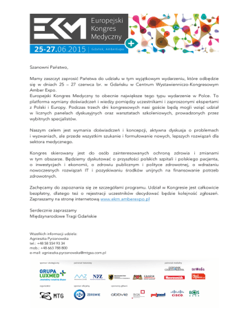 Szanowni Państwo, Mamy zaszczyt zaprosić Państwa do udziału w tym wyjątkowym wydarzeniu, które odbędzie się w dniach 25 – 27 czerwca br. w Gdańsku w Centrum Wystawienniczo-Kongresowym Amber Expo. Europejski Kongres Medyczny to obecnie największe tego typu wydarzenie w Polce. To platforma wymiany doświadczeń i wiedzy pomiędzy uczestnikami i zaproszonymi ekspertami z Polski i Europy. Podczas trzech dni kongresowych nasi goście będą mogli wziąć udział w licznych panelach dyskusyjnych oraz warsztatach szkoleniowych, prowadzonych przez wybitnych specjalistów. Naszym celem jest wymania doświadczeń i koncepcji, aktywna dyskusja o problemach i wyzwaniach, ale przede wszystkim szukanie i formułowanie nowych, lepszych rozwiązań dla sektora medycznego. Kongres skierowany jest do osób zainteresowanych ochroną zdrowia i zmianami w tym obszarze. Będziemy dyskutować o przyszłości polskich szpitali i polskiego pacjenta, o inwestycjach i ekonomii, o zdrowiu publicznym i polityce zdrowotnej, o wdrażaniu nowoczesnych rozwiązań IT i pozyskiwaniu środków unijnych na finansowanie potrzeb zdrowotnych. Zachęcamy do zapoznania się ze szczegółami programu. Udział w Kongresie jest całkowicie bezpłatny, dlatego też o rejestracji uczestników decydować będzie kolejność zgłoszeń. Zapraszamy na stronę internetową www.ekm.amberexpo.pl Serdecznie zapraszamy Międzynarodowe Tragi Gdańskie Wszelkich informacji udziela: Agnieszka Pyrzanowska tel.: +48 58 554 93 34 mob.: +48 663 788 800 e-mail: [email protected]