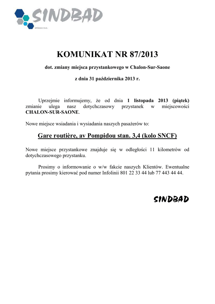 KOMUNIKAT NR 87/2013 dot. zmiany miejsca przystankowego w Chalon-Sur-Saone z dnia 31 października 2013 r. Uprzejmie informujemy, że od dnia 1 listopada 2013 (piątek) zmianie ulega nasz dotychczasowy przystanek w miejscowości CHALON-SUR-SAONE. Nowe miejsce wsiadania i wysiadania naszych pasażerów to: Gare routière, av Pompidou stan. 3,4 (kolo SNCF) Nowe miejsce przystankowe znajduje się w odległości 11 kilometrów od dotychczasowego przystanku. Prosimy o informowanie o w/w fakcie naszych Klientów. Ewentualne pytania prosimy kierować pod numer Infolinii 801 22 33 44 lub 77 443 44 44. SINDBAD