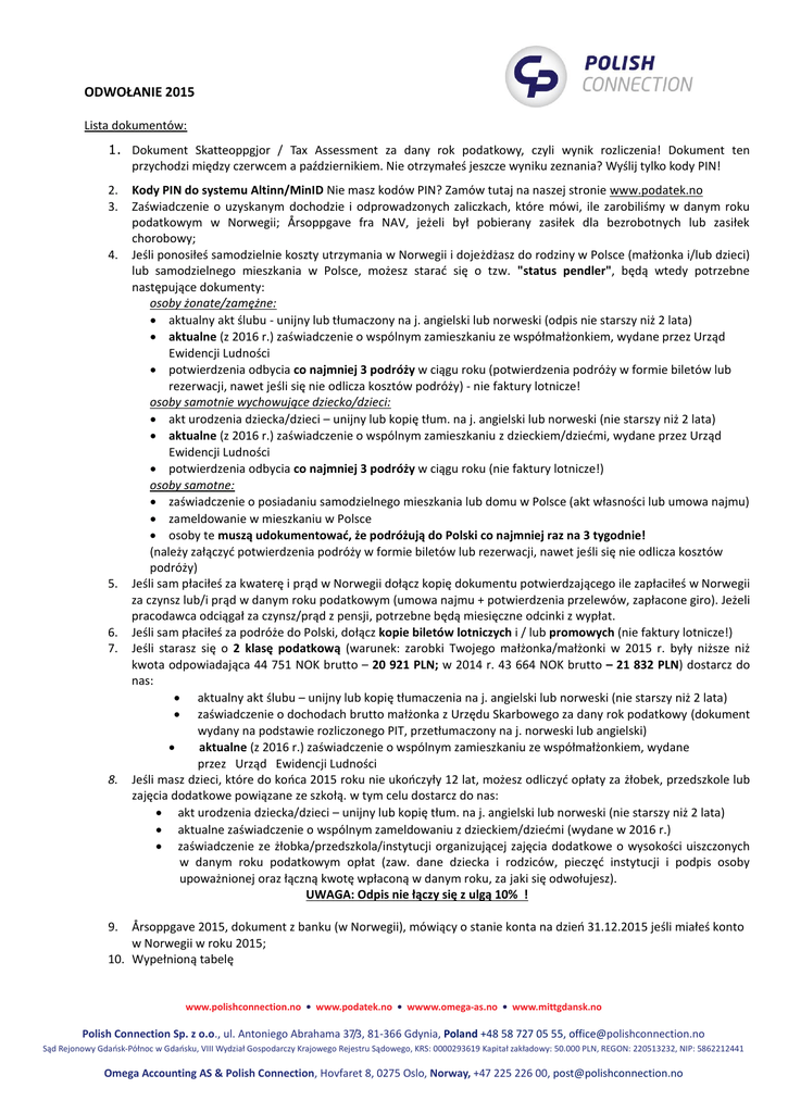 ODWOŁANIE 2015 Lista dokumentów: 1. Dokument Skatteoppgjor / Tax Assessment za dany rok podatkowy, czyli wynik rozliczenia! Dokument ten przychodzi między czerwcem a październikiem. Nie otrzymałeś jeszcze wyniku zeznania? Wyślij tylko kody PIN! 2. 3. 4. 5. 6. 7. 8. Kody PIN do systemu Altinn/MinID Nie masz kodów PIN? Zamów tutaj na naszej stronie www.podatek.no Zaświadczenie o uzyskanym dochodzie i odprowadzonych zaliczkach, które mówi, ile zarobiliśmy w danym roku podatkowym w Norwegii; Årsoppgave fra NAV, jeżeli był pobierany zasiłek dla bezrobotnych lub zasiłek chorobowy; Jeśli ponosiłeś samodzielnie koszty utrzymania w Norwegii i dojeżdżasz do rodziny w Polsce (małżonka i/lub dzieci) lub samodzielnego mieszkania w Polsce, możesz starać się o tzw. "status pendler", będą wtedy potrzebne następujące dokumenty: osoby żonate/zamężne: aktualny akt ślubu - unijny lub tłumaczony na j. angielski lub norweski (odpis nie starszy niż 2 lata) aktualne (z 2016 r.) zaświadczenie o wspólnym zamieszkaniu ze współmałżonkiem, wydane przez Urząd Ewidencji Ludności potwierdzenia odbycia co najmniej 3 podróży w ciągu roku (potwierdzenia podróży w formie biletów lub rezerwacji, nawet jeśli się nie odlicza kosztów podróży) - nie faktury lotnicze! osoby samotnie wychowujące dziecko/dzieci: akt urodzenia dziecka/dzieci – unijny lub kopię tłum. na j. angielski lub norweski (nie starszy niż 2 lata) aktualne (z 2016 r.) zaświadczenie o wspólnym zamieszkaniu z dzieckiem/dziećmi, wydane przez Urząd Ewidencji Ludności potwierdzenia odbycia co najmniej 3 podróży w ciągu roku (nie faktury lotnicze!) osoby samotne: zaświadczenie o posiadaniu samodzielnego mieszkania lub domu w Polsce (akt własności lub umowa najmu) zameldowanie w mieszkaniu w Polsce osoby te muszą udokumentować, że podróżują do Polski co najmniej raz na 3 tygodnie! (należy załączyć potwierdzenia podróży w formie biletów lub rezerwacji, nawet jeśli się nie odlicza kosztów podróży) Jeśli sam płaciłeś za kwaterę i prąd w Norwegii dołącz kopię dokumentu potwierdzającego ile zapłaciłeś w Norwegii za czynsz lub/i prąd w danym roku podatkowym (umowa najmu + potwierdzenia przelewów, zapłacone giro). Jeżeli pracodawca odciągał za czynsz/prąd z pensji, potrzebne będą miesięczne odcinki z wypłat. Jeśli sam płaciłeś za podróże do Polski, dołącz kopie biletów lotniczych i / lub promowych (nie faktury lotnicze!) Jeśli starasz się o 2 klasę podatkową (warunek: zarobki Twojego małżonka/małżonki w 2015 r. były niższe niż kwota odpowiadająca 44 751 NOK brutto – 20 921 PLN; w 2014 r. 43 664 NOK brutto – 21 832 PLN) dostarcz do nas: aktualny akt ślubu – unijny lub kopię tłumaczenia na j. angielski lub norweski (nie starszy niż 2 lata) zaświadczenie o dochodach brutto małżonka z Urzędu Skarbowego za dany rok podatkowy (dokument wydany na podstawie rozliczonego PIT, przetłumaczony na j. norweski lub angielski) aktualne (z 2016 r.) zaświadczenie o wspólnym zamieszkaniu ze współmałżonkiem, wydane przez Urząd Ewidencji Ludności Jeśli masz dzieci, które do końca 2015 roku nie ukończyły 12 lat, możesz odliczyć opłaty za żłobek, przedszkole lub zajęcia dodatkowe powiązane ze szkołą. w tym celu dostarcz do nas: akt urodzenia dziecka/dzieci – unijny lub kopię tłum. na j. angielski lub norweski (nie starszy niż 2 lata) aktualne zaświadczenie o wspólnym zameldowaniu z dzieckiem/dziećmi (wydane w 2016 r.) zaświadczenie ze żłobka/przedszkola/instytucji organizującej zajęcia dodatkowe o wysokości uiszczonych w danym roku podatkowym opłat (zaw. dane dziecka i rodziców, pieczęć instytucji i podpis osoby upoważnionej oraz łączną kwotę wpłaconą w danym roku, za jaki się odwołujesz). UWAGA: Odpis nie łączy się z ulgą 10% ! 9. Årsoppgave 2015, dokument z banku (w Norwegii), mówiący o stanie konta na dzień 31.12.2015 jeśli miałeś konto w Norwegii w roku 2015; 10. Wypełnioną tabelę www.polishconnection.no • www.podatek.no • wwww.omega-as.no • www.mittgdansk.no Polish Connection Sp. z o.o., ul. Antoniego Abrahama 37/3, 81-366 Gdynia, Poland +48 58 727 05 55, [email protected] Sąd Rejonowy Gdańsk-Północ w Gdańsku, VIII Wydział Gospodarczy Krajowego Rejestru Sądowego, KRS: 0000293619 Kapitał zakładowy: 50.000 PLN, REGON: 220513232, NIP: 5862212441 Omega Accounting AS & Polish Connection, Hovfaret 8, 0275 Oslo, Norway, +47 225 226 00, [email protected] UWAGA! WSZYSTKIE DOKUMENTY, KTÓRE NIE SĄ WYDAWANE NA DRUKACH UNIJNYCH MUSZĄ ZOSTAĆ PRZETŁUMACZONE NA J. ANGIELSKI LUB NORWESKI KOPIE wymaganych dokumentów (na język norweski lub angielski) wraz z wypełnioną tabelą prosimy przysłać na adres: Polish Connection Sp. z o.o. ul. Antoniego Abrahama 37/3 81-366 Gdynia [email protected] [email protected] Polish Connection Sp. z o.o. Oddział Warszawa al. Jerozolimskie 123 a 02-017 Warszawa [email protected] Polish Connection Hovfaret 8 0275 Oslo, Norwegia [email protected] www.polishconnection.no • www.podatek.no • wwww.omega-as.no • www.mittgdansk.no Polish Connection Sp. z o.o., ul. Antoniego Abrahama 37/3, 81-366 Gdynia, Poland +48 58 727 05 55, [email protected] Sąd Rejonowy Gdańsk-Północ w Gdańsku, VIII Wydział Gospodarczy Krajowego Rejestru Sądowego, KRS: 0000293619 Kapitał zakładowy: 50.000 PLN, REGON: 220513232, NIP: 5862212441 Omega Accounting AS & Polish Connection, Hovfaret 8, 0275 Oslo, Norway, +47 225 226 00, [email protected] Część 1 – wypełniają wszyscy Imię Nazwisko Nr personalny norweski Polski nr PESEL Stan cywilny Adres w Norwegii Adres w Polsce Telefon w Norwegii Adres e-mail Czy masz dzieci? Telefon w Polsce Login i hasło w systemie Altinn/MinID (jeśli je masz) Dokładna data zatrudnienia w Norwegii Czy pracowałeś w Norwegii w roku 2013? Podać ilość dni Czy pracowałeś w Norwegii w roku 2014? Podać ilość dni Nazwa pr