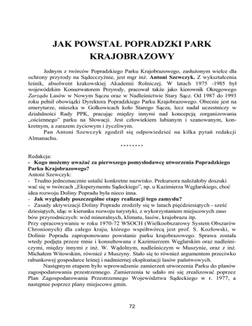 JAK POWSTAŁ POPRADZKI PARK KRAJOBRAZOWY Jednym z twórców Popradzkiego Parku Krajobrazowego, zasłużonym wielce dla ochrony przyrody na Sądecczyźnie, jest mgr inż. Antoni Szewczyk. Z wykształcenia leśnik, absolwent krakowskiej Akademii Rolniczej. W latach 1975 -1985 był wojewódzkim Konserwatorem Przyrody, pracował także jako kierownik Okręgowego Zarządu Lasów w Nowym Sączu oraz w Nadleśnictwie Stary Sącz. Od 1987 do 1993 roku pełnił obowiązki Dyrektora Popradzkiego Parku Krajobrazowego. Obecnie jest na emeryturze, mieszka w Gołkowicach koło Starego Sącza, lecz nadal uczestniczy w działalności Rady PPK, pracując między innymi nad koncepcją zorganizowania „ościennego” parku na Słowacji. Jest człowiekiem lubianym i szanowanym, konkretnym, a zarazem życiowym i życzliwym. Pan Antoni Szewczyk zgodził się odpowiedzieć na kilka pytań redakcji Almanachu. ******** Redakcja: - Kogo możemy uważać za pierwszego pomysłodawcę utworzenia Popradzkiego Parku Krajobrazowego? Antoni Szewczyk: - Trudno jednoznacznie ustalić konkretne nazwisko. Prekursora należałoby doszuki wać się w twórcach „Eksperymentu Sądeckiego”, np. u Kazimierza Węglarskiego, choć idea rozwoju Doliny Popradu była nieco inna. - Jak wyglądały poszczególne etapy realizacji tego zamysłu? - Zasady aktywizacji Doliny Popradu zrodziły się w latach pięćdziesiątych - sześć dziesiątych, idąc w kierunku rozwoju turystyki, z wykorzystaniem miejscowych zaso bów przyrodniczych: wód mineralnych, klimatu, lasów, krajobrazu itp. Przy opracowywaniu w roku 1970-72 WSOCH (Wielkoobszarowy System Obszarów Chronionych) dla całego kraju, którego współtwórcą jest prof. S. Kozłowski, w Dolinie Popradu zaproponowano powstanie parku krajobrazowego. Sprawa została wtedy podjęta przeze mnie i konsultowana z Kazimierzem Węglarskim oraz nadleśniczymi, między innymi z inż. W. Wądolnym, nadleśniczym w Muszynie, oraz z inż. Michałem Witowskim, również z Muszyny. Stało się to również argumentem przeciwko rabunkowej gospodarce leśnej i nadmiernej eksploatacji lasów państwowych. Następnym etapem było wprowadzenie zamierzeń utworzenia Parku do planów zagospodarowania przestrzennego. Zamierzenia te udało mi się zrealizować poprzez Plan Zagospodarowania Przestrzennego Województwa Sądeckiego w r. 1977, a następnie poprzez plany miejscowe gmin. 72 Na przełomie lat 70 i 80-tych opracowałem skrótowy projekt utworzenia Popradzkiego Parku Krajobrazowego, który - po dwukrotnym zaopiniowaniu przez Państwową Radę Ochrony Przyrody - został przedłożony do akceptacji terytorialnie zainteresowanych gmin. Przedstawiciele samorządów gminnych po moich konsultacjach zaakceptowali proponowany projekt i wyrazili zgodę na piśmie. Stanowiło to podstawę do przedłożenia sprawy odpowiedniej komisji Wojewódzkiej Rady Narodowej. - Co mógłby Pan powiedzieć na temat ludzi, którzy pomagali bądź przeszkadzali realizacji idei PPK? - Największej pomocy w procesie powstania Parku udzieliła grupa przyrodników i społeczników skupiona w Lidze Ochrony Przyrody. Do nich należą: inż. O. Duda, inż. J. Zembrzuski, mgr T. Ogorzałek oraz inni, skupieni wokół Prezydium Zarządu Wojewódzkiego LOP w Nowym Sączu. Wyraźna pomoc przyszła ze strony działaczy społecznych, szczególnie z terenu Krynicy i Muszyny, którzy często wyrażali poparcie na konferencjach i spotkaniach naukowych, społecznych i gospodarczych. - Kiedy doszło do zatwierdzenia powstania Parku? - Po konsultacjach w resortowych komisjach, gdzie szczegółowo przedyskutowano cel i zakres ochrony przyrody oraz zakres ograniczeń i priorytetów w rozwoju Doliny Popradu, projekt uchwały o utworzeniu PPK trafił pod obrady Wojewódzkiej Rady Narodowej w Nowym Sączu, która w dniu 11 września 1987 roku utworzyła Popradzki Park Krajobrazowy na powierzchni 78 tyś. ha (wraz z otuliną). Z dniem l marca 1988 r. Wojewoda Nowosądecki powołał Zarząd Parku z siedzibą w Starym Sączu. - Co warto jeszcze wiedzieć o powstaniu Parku? - Dla informacji ogólnej należałoby przedstawić krótką metryczkę Parku, mianowicie: Data utworzenia: 11.09.1987, uchwałą nr 169/XIX/87 Wojewódzkiej Rady Narodowej w Nowym Sączu. Powierzchnia Parku: 54,4 tyś. ha, otuliny: 23,9 tyś. ha, ogółem: 78 tyś. ha. Położenie: W Beskidzie Sądeckim, na terenie gmin: Krynica, Muszyna, Piwniczna, Stary Sącz, Łabowa, Nawojowa, Łącko, Ochotnica, Krościenko i Szczawnica. Różnica wzniesień: Od 330 m n.p.m. po 1262 m (Radziejowa). Cel utworzenia: Kompleksowa ochrona walorów przyrodniczych, krajobrazowych, turystycznych i kulturowych w warunkach racjonalnej gospodarki. Walory krajobrazowe: Urozmaicona rzeźba, przełomy rzeczne, wnętrza dolin, stoki gór średnich z lasami i mozaiką użytków rolnych, sieć osadniczo -uzdrowiskowa. Formy ochrony: 13 rezerwatów i 70 pomników przyrody, propozycja objęcia ochroną rezerwatową dużych powierzchni przyrodniczych i kulturowych. Zarządzanie Parkiem: Zarząd Popradzkiego Parku Krajobrazowego powołany 1.03.1988 roku, z siedzibą w Starym Sączu, oraz Rada Parku przy Dyrektorze Parku, powołana w 1993 roku. - Dziękujemy serdecznie za udzielenie odpowiedzi. Opracowała Danuta Chrostowska 73