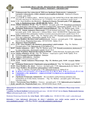 KALENDARZ PRACY RUCHU ŚWIATŁO-ŻYCIE DIECEZJI SANDOMIERSKIEJ MŁODZIEŻ, DZIECI: WRZESIEŃ – GRUDZIEŃ 2010 WRZESIEŃ 04 17-19 24-26 25-26 PAŹDZIERNIK 28 01-03 09-10 15-17 16 15-17 LISTOPAD 06-07 05-07 13-14 20 20 26-28 26-28 GRUDZIEŃ 02 03-05 03-05 08 26 Podsumowanie Oaz wakacyjnych '2010 oraz Spotkanie Moderatorów i Animatorów turnusów wakacyjnych, a także członków poszczególnych diakonii – Radomyśl n/Sanem. Początek: godz.10:00 JANÓW LUBELSKI – DIECEZJALNE SPOTKANIE MŁODYCH Wszelkie informacje ks. Witold Szczur: tel: 515498261 www.sms.sandomierz.opoka.org.pl O M - Oaza Modlitwy dla Młodzieży - Radomyśl n/Sanem. Początek godz.17:00. Zgłoszenia u ks. A. Stachowicza, kom. +48 505 288 398. Opłata – 45 zł. Szkoła Animatora -II rok - Tbg. Św. Barbara – początek: godz. 9.00. Warunkiem uczestnictwa jest: ukończenie I roku Szkoły A., podjęcie wymagań KWC, skierowanie z parafii. Koszt: 30 zł. Kolegium Moderatorów i Opiekunów grup parafialnych - Tbg - Św. Barbara, godz. 19:00 S A M – Szkoła Animatora Muzycznego I i II rok formacji muzycznej – Tbg - Św. Barbara – początek: godz. 16.00. Zgłoszenia: s. Justyna Mikos - kom.:+48 606238769. Zapraszamy także grupy scholanek (klasy gimnazjalne i średnie). Uczestnicy przywożą skierowanie z parafii. Koszt: 45 zł. Szkoła Animatora – rok I - Tbg - Św. Barbara: godz. 9.00. Warunki uczestnictwa: ukończony II st. oazy wakacyjnej, skierowanie z parafii. Koszt: 30zł. Oaza Modlitwy dla dzieci szkół podstawowych - Gorzyce - początek godz. 17:00. Zgłoszenia do 13.10 u ks. Wojciecha Kani, kom. +48724510348. Opłata: 45 zł Rejonowy Dzień Wspólnoty O M - Oaza Modlitwy dla młodzieży gimnazjalnej i szkół średnich – Tbg - Św. Barbara. Początek godz.17:00. Zgłoszenia do 13.10 Opłata:45 zł. Szkoła Animatora – rok I - Tbg. Św. Barbara: godz. 9.00. Warunki uczestnictwa: ukończony II st. oazy wakacyjnej, skierowanie z parafii. Koszt: 30 zł. Dzień Wspólnoty Diakonii Diecezjalnych DWDD – Lublin-Sławinek. Początek godz.18:00 Szkoła Animatora -II rok - Tbg - Św. Barbara – rozpoczęcie o godz. 09:00. Opłata: 30 zł. XVII Przegląd Piosenki Religijnej – Gorzyce Zabawa Andrzejkowa – Gorzyce ORDJ w Porszewicach k/Łodzi SAM – Szkoła Animatora Muzycznego - Tbg - Św. Barbara, godz. 16:00 - recepcja. Opłata: 45 zł. Kolegium Moderatorów i Opiekunów grup parafialnych - Tbg - Św. Barbara, godz. 19:00 Oaza Modlitwy dla dzieci - Gorzyce - początek godz. 17:00. Zgłoszenia do 01.12. Opłata: 45 zł Oaza Modlitwy dla młodzieży gimnazjalnej i szkół średnich. – Tbg - św. Barbara. Początek godz.17:00. Zgłoszenia do 01.12. Opłata:45 zł. U R O C Z Y S T O Ś Ć P A T R O N A L N A R U C H U Ś W I A T Ł O -Ż Y C I E NIEDZIELA ŚW. RODZINY – UROCZYSTOŚĆ PATRONALNA DOMOWEGO KOŚCIOŁA Spotkanie Formacyjne Animatorów – dla wszystkich z pełną formacją animatora oraz 27 kandydatów po II roku Szkoły Animatora - Tbg - Św. Barbara – początek: godz. 9.00. Koszt: dowolna ofiara. 29.12- Noworoczna Oaza Modlitwy – Gorzyce – początek godz. 17.00. Zgłoszenia przez kapłanów 01.01 parafii u ks. Wojciecha Kani. kom. +48724510348. Koszt: 50.00 Zgłoszenia do uczestnictwa w Szkole Animatora, Oazach Modlitwy, Szkole Animatora Muzycznego można przekazać e-mailem: ks.Marek Kuliński ([email protected]), kom. +48 604 520 667 lub do Siostry Moderatorki Justyny Mikos ([email protected]), kom. +48 606 238 769. Moderator Domowego Kościoła: ks. Artur Dyjak – KUL Lublin, kom. +48 606 612 568, e-mail: [email protected]. Kalendarz i inne informacje skierowane do dzieci i młodzieży oraz rodzin można znaleźć na stronie: www.sandomierz.oaza.pl , a dla Oazy Rodzin: www.rdk.sandomierz.opoka.org.pl