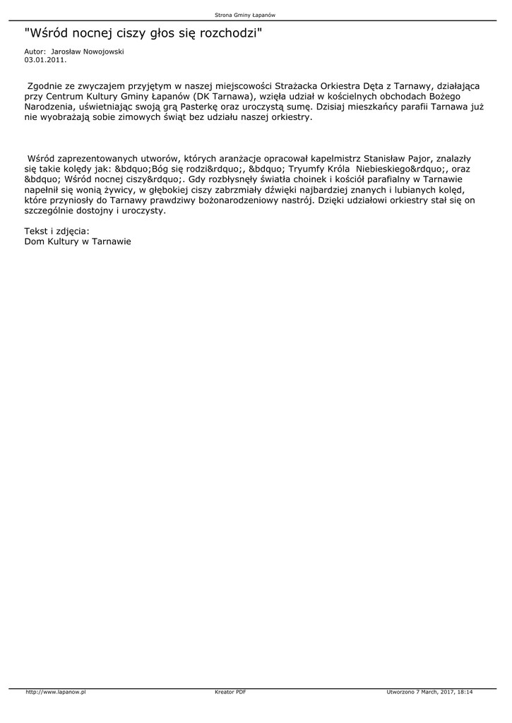 Strona Gminy Łapanów "Wśród nocnej ciszy głos się rozchodzi" Autor: Jarosław Nowojowski 03.01.2011. Zgodnie ze zwyczajem przyjętym w naszej miejscowości Strażacka Orkiestra Dęta z Tarnawy, działająca przy Centrum Kultury Gminy Łapanów (DK Tarnawa), wzięła udział w kościelnych obchodach Bożego Narodzenia, uświetniając swoją grą Pasterkę oraz uroczystą sumę. Dzisiaj mieszkańcy parafii Tarnawa już nie wyobrażają sobie zimowych świąt bez udziału naszej orkiestry. Wśród zaprezentowanych utworów, których aranżacje opracował kapelmistrz Stanisław Pajor, znalazły się takie kolędy jak: „Bóg się rodzi”, „ Tryumfy Króla Niebieskiego”, oraz „ Wśród nocnej ciszy”. Gdy rozbłysnęły światła choinek i kościół parafialny w Tarnawie napełnił się wonią żywicy, w głębokiej ciszy zabrzmiały dźwięki najbardziej znanych i lubianych kolęd, które przyniosły do Tarnawy prawdziwy bożonarodzeniowy nastrój. Dzięki udziałowi orkiestry stał się on szczególnie dostojny i uroczysty. Tekst i zdjęcia: Dom Kultury w Tarnawie http://www.lapanow.pl Kreator PDF Utworzono 7 March, 2017, 18:14