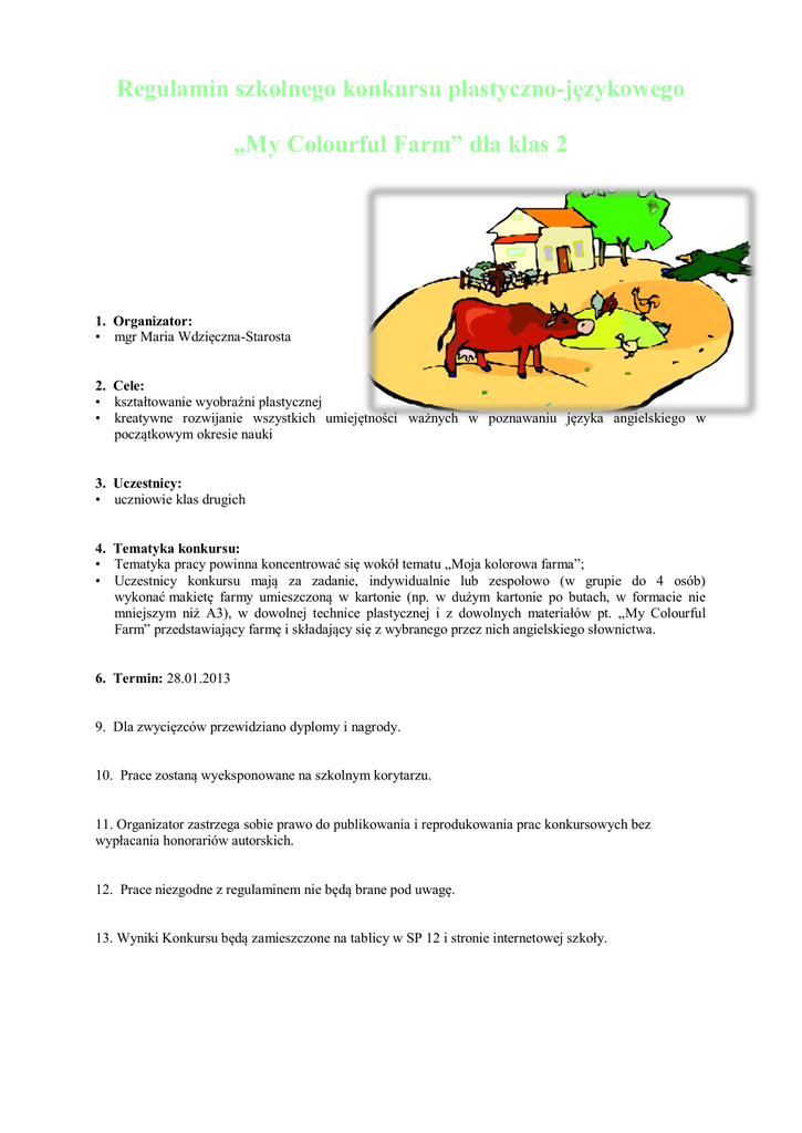 Regulamin szkolnego konkursu plastyczno-językowego „My Colourful Farm” dla klas 2 1. Organizator: • mgr Maria Wdzięczna-Starosta 2. Cele: • kształtowanie wyobraźni plastycznej • kreatywne rozwijanie wszystkich umiejętności ważnych w poznawaniu języka angielskiego w początkowym okresie nauki 3. Uczestnicy: • uczniowie klas drugich 4. Tematyka konkursu: • Tematyka pracy powinna koncentrować się wokół tematu „Moja kolorowa farma”; • Uczestnicy konkursu mają za zadanie, indywidualnie lub zespołowo (w grupie do 4 osób) wykonać makietę farmy umieszczoną w kartonie (np. w dużym kartonie po butach, w formacie nie mniejszym niż A3), w dowolnej technice plastycznej i z dowolnych materiałów pt. „My Colourful Farm” przedstawiający farmę i składający się z wybranego przez nich angielskiego słownictwa. 6. Termin: 28.01.2013 9. Dla zwycięzców przewidziano dyplomy i nagrody. 10. Prace zostaną wyeksponowane na szkolnym korytarzu. 11. Organizator zastrzega sobie prawo do publikowania i reprodukowania prac konkursowych bez wypłacania honorariów autorskich. 12. Prace niezgodne z regulaminem nie będą brane pod uwagę. 13. Wyniki Konkursu będą zamieszczone na tablicy w SP 12 i stronie internetowej szkoły.