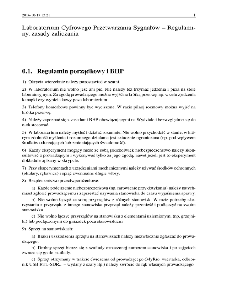 2016-10-19 13:21 1 Laboratorium Cyfrowego Przetwarzania Sygnałów – Regulaminy, zasady zaliczania 0.1. Regulamin porządkowy i BHP 1) Okrycia wierzchnie należy pozostawiać w szatni. 2) W laboratorium nie wolno jeść ani pić. Nie należy też trzymać jedzenia i picia na stole laboratoryjnym. Za zgodą prowadzącego można wyjść na krótką przerwę, np. w celu zjedzenia kanapki czy wypicia kawy poza laboratorium. 3) Telefony komórkowe powinny być wyciszone. W razie pilnej rozmowy można wyjść na krótka przerwę. 4) Należy zapoznać się z zasadami BHP obowiązującymi na Wydziale i bezwzględnie się do nich stosować. 5) W laboratorium należy myśleć i działać rozumnie. Nie wolno przychodzić w stanie, w którym zdolność myślenia i rozumnego działania jest sztucznie ograniczona (np. pod wpływem środków odurzających lub zmieniających świadomość). 6) Każdy eksperyment mogący nieść ze sobą jakiekolwiek niebezpieczeństwo należy skonsultować z prowadzącym i wykonywać tylko za jego zgodą, nawet jeżeli jest to eksperyment dokładnie opisany w skrypcie. 7) Przy eksperymentach z urządzeniami mechanicznymi należy używać środków ochronnych (okulary, rękawice) i spiąć ewentualne długie włosy. 8) Bezpieczeństwo przeciwporażeniowe: a) Każde podejrzenie niebezpieczeństwa (np. mrowienie przy dotykaniu) należy natychmiast zgłosić prowadzącemu i zaprzestać używania stanowiska do czasu wyjaśnienia sprawy. b) Nie wolno łączyć ze sobą przyrządów z różnych stanowisk. W razie potrzeby skorzystania z przyrządu z innego stanowiska przyrząd należy przenieść i podłączyć na swoim stanowisku. c) Nie wolno łączyć przyrządów na stanowisku z elementami uziemionymi (np. grzejniki) lub podłączonymi do gniazdek poza stanowiskiem. 9) Sprzęt na stanowiskach: a) Braki i uszkodzenia sprzętu na stanowiskach należy niezwłocznie zgłaszać do prowadzącego. b) Drobny sprzęt bierze się z szuflady oznaczonej numerem stanowiska i po zajęciach zwraca się go do szuflady. c) Sprzęt otrzymany w trakcie ćwiczenia od prowadzącego (MyRio, wiertarka, odbiornik USB RTL-SDR,.. – wydany z szafy itp.) należy zwrócić do rąk własnych prowadzącego. 2 2016-10-19 13:21 d) Po zakończonych zajęciach stanowisko należy uporządkować - wyłączyć urządzenia, rozłączyć kable pomiarowe, schować do szuflad elementy, które tam być powinny. e) Część sprzętu jest oznaczona numerem stanowiska i należy go używać na tym stanowisku. Wyjatki od reguły muszą być uzgodnione z prowadzącym. 0.2. Regulamin zaliczania przedmiotu Studenta przychodzącego na zajęcia laboratoryjne obowiązuje znajomość materiału teoretycznego z odpowiedniego rozdziału skryptu1 . 1) Na zajęcia laboratoryjne składa się 10 ćwiczeń (oznaczanych liczbami od 0 do 9). 2) Każde z ćwiczeń 1-9 oceniane jest w skali 0-10 punktów, z czego: 4 punkty wejściówka, 6 punktów wykonanie ćwiczenia. Wykonanie ćwiczenia sprawdzane jest w trakcie pracy (poprzez rozmowy prowadzącego ze studentem) i po jej zakończeniu (poprzez ocenę złożonego protokołu). 3) Wejściówka sprawdza przygotowanie studenta do wykonania ćwiczeń. Obejmuje ona materiał podany w skrypcie jako “Podstawy teoretyczne” do danego ćwiczenia. Wejściówka może także sprawdzać, czy student potrafi samodzielnie rozwiązać proste zadania rachunkowe i problemowe, których przykłady podane są jako “Praca domowa”. 4) Protokół z laboratorium składa się w chwili zakończenia danego ćwiczenia. Protokołu nie zabiera się do domu ani nie uzupełnia po ćwiczeniu. 5) W laboratorium wolno (nie dotyczy wejściówki): – Porównywać wyniki z sąsiadami – Rozmawiać z innymi studentami na temat interpretacji wyników – Badać zadane zagadnienia w inny sposób niż sugerowany w skrypcie (o ile wiemy co robimy i dlaczego, i nie naruszamy zasad BHP) – Zadawać pytania prowadzącemu – Za zgodą prowadzącego wykonać zadanie “ekstra” zamiast podobnego zadania zwykłego – Notować więcej niż wymaga skrypt (należy tylko czytelnie oznaczyć co się notuje) 6) Do zaliczenia laboratorium wymagane jest zaliczenie co najmniej 7 ćwiczeń (zaliczenie ćwiczenia rozumiane jest jako jednoczesne uzyskanie z wejściówki 2 punktów i z wykonania 3 punktów) oraz uzyskanie łącznej liczby punktów co najmniej 45. 7) W przypadkach uzasadnionej nieobecności na zajęciach istnieje możliwość odrabiania zajęć w terminie dodatkowym pod koniec semestru (jedno ćwiczenie) lub w miarę wolnych miejsc w innych grupach zajęciowych. Chęć odrabiania zajęć musi być uprzednio zgłoszona do prowadzącego dane zajęcia (lub do osoby prowadzącej zapisy na termin dodatkowy). Należy odpowiednio wcześnie dokonać zgłoszenia – obowiązuje zasada “kto pierwszy ten lepszy”. 8) Ocena końcowa jest wystawiana wg skali (gdzie P - łączna liczba punktów) pod warunkami wg pktu 6). 1 Dopóki skrypt jest w postaci oddzielnych zeszytów, utożsamiamy rozdział z zeszytem. 3 2016-10-19 13:21 5 gdy P > 81 4.5 gdy P > 72 4 gdy P > 63 Maksymalna liczba punktów wynosi 90 3.5 gdy P > 54 3 gdy P 45 0.3. Protokół z ćwiczenia Protokół z ćwiczenia jest podstawą do oceny wykonania ćwiczenia przez studenta. Protokół powinien być tworzony na bieżąco i oddany prowadzącemu pod koniec ćwiczenia. Wymagana jest elementarna staranność – protokół powinien być czytelny, a wypowiedzi zrozumiałe; musi być też jasne czego (jakiego ekperymentu czy problemu) dotyczy wypowiedź lub rysunek. Na rysunkach wymagany jest opis osi; rysunki mogą byc szkicowe; ważne jest jednak, aby starannie zaznaczyć istotne elementy (np. oznaczyć punkt przecięcia z osią, jeśli jego położenie było przedmiotem badania). Szczegółowe zadania (np. wartości parametrów lub rodzaje badanych sygnałów) w ćwiczeniach zależą od numeru stanowiska. Dlatego w nagłówku protokołu należy (oprócz imienia, n