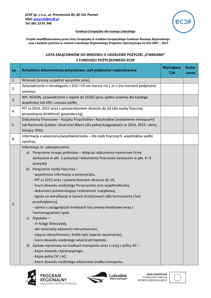 ECDF Sp. z o.o., ul. Promienista 83, 60-141 Poznań Mail: [email protected] Tel: 061 22 61 340 Fundusze Europejskie dla rozwoju Lubuskiego Projekt współfinansowany przez Unię Europejską ze środków Europejskiego Funduszu Rozwoju Regionalnego oraz z budżetu państwa w ramach Lubuskiego Regionalnego Programu Operacyjnego na lata 2007 – 2013 LISTA ZAŁĄCZNIKÓW DO WNIOSKU O UDZIELENIE POŻYCZKI „STANDARD” Z FUNDUSZU POŻYCZKOWEGO ECDF Lp. Kompletna dokumentacja pożyczkowa, czyli podpisany i zaparafowany: 1. Wniosek (proszę uzupełnić wszystkie pola); Zaświadczenie o niezaleganiu z ZUS i US nie starsze niż 1 m-c (na moment podpisania umowy); NIP, REGON, zaświadczenie o wpisie do CEiDG (przy spółce cywilnej dla każdego wspólnika) lub KRS i umowa spółki; PIT za 2014, 2015 wraz z potwierdzeniem złożenia do US (dla osoby fizycznej prowadzącej działalność gospodarczą); Dokumenty finansowe – Książka Przychodów i Rozchodów (zestawienie miesiącami) lub Rachunek Zysków i Strat oraz Bilans (dla pełnej księgowości) za 2014, 2015 i okres bieżący 2016; Informacja o właścicielu/współwłaścicielu – dla osób fizycznych, wspólników spółki cywilnej; Informacja nt. zabezpieczenia: a) Poręczenie innego podmiotu – dołączyć dokumenty rejestrowe firmy (wskazane w pkt. 3 powyżej) i dokumenty finansowe (wskazane w pkt. 4 i 5 powyżej) b) Poręczenie osoby fizycznej – - wypełniona informacja o poręczycielu, - PIT za 2015 wraz z potwierdzeniem złożenia do US, - ksero dowodu osobistego Poręczyciela oraz współmałżonka, - dokument potwierdzający rozdzielność majątkową, - zgoda na weryfikację w bazach kredytowych (dla konsumenta i/lub przedsiębiorcy), - opinia o zaciągniętych kredytach lub umowy kredytowe wraz z harmonogramem spłat. c) Hipoteka – - nr Księgi Wieczystej, - akt notarialny własności nieruchomości, - zdjęcia nieruchomości, krótki opis (operat opcjonalnie), - ksero dowodu osobistego właścicieli hipoteki. d) Zastaw rejestrowy na środkach transportu wraz z cesją z polisy AC – - kopia dowodu rejestracyjnego, - kopia polisy OC i AC, - ksero dowodu osobistego właściciela środka transportu. 2. 3. 4. 5. 6. 7. Wymagany T/N Dostar -czony ECDF Sp. z o.o., ul. Promienista 83, 60-141 Poznań Mail: [email protected] Tel: 061 22 61 340 Fundusze Europejskie dla rozwoju Lubuskiego Projekt współfinansowany przez Unię Europejską ze środków Europejskiego Funduszu Rozwoju Regionalnego oraz z budżetu państwa w ramach Lubuskiego Regionalnego Programu Operacyjnego na lata 2007 – 2013 8. 9. 10. 11. 12. 13. 14. Opinia o zaciągniętych kredytach lub kopia umów kredytowych wraz z harmonogramami spłat (dot. pożyczkobiorcy i poręczycieli); Prognoza przychodów i kosztów działalności na najbliższe 5 lat – w odrębnym dokumencie; Zgoda za weryfikację w bazach kredytowych (dla konsumenta i/lub przedsiębiorcy); Historia rachunków firmowych (wyciągi z kont bankowych) za ost. 6 m-cy; Ewidencja/wykaz środków trwałych i WNIP; Ewidencja VAT (dla rozliczenia w formie ryczałtu); Ksero dokumentów tożsamości pożyczkobiorcy lub osób zarządzających.