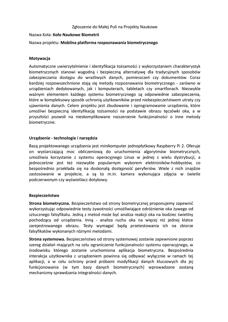 Zgłoszenie do Małej Puli na Projekty Naukowe Nazwa Koła: Koło Naukowe Biometrii Nazwa projektu: Mobilna platforma rozpoznawania biometrycznego Motywacja Automatyczne uwierzytelnienie i identyfikacja tożsamości z wykorzystaniem charakterystyk biometrycznych stanowi wygodną i bezpieczną alternatywę dla tradycyjnych sposobów zabezpieczania dostępu do wrażliwych danych, pomieszczeń czy dokumentów. Coraz bardziej rozpowszechnione stają się metody rozpoznawania biometrycznego - zarówno w urządzeniach dedykowanych, jak i komputerach, tabletach czy smartfonach. Niezwykle ważnym elementem każdego systemu biometrycznego są odpowiednie zabezpieczenia, które w kompleksowy sposób uchronią użytkowników przed niebezpieczeństwem utraty czy ujawnienia danych. Celem projektu jest zbudowanie i oprogramowanie urządzenia, które umożliwi bezpieczną identyfikację tożsamości na podstawie obrazu tęczówki oka, a w przyszłości pozwoli na nieskomplikowane rozszerzenie funkcjonalności o inne metody biometryczne. Urządzenie - technologie i narzędzia Bazą projektowanego urządzenia jest minikomputer jednopłytkowy Raspberry Pi 2. Oferuje on wystarczającą moc obliczeniową do uruchomienia algorytmów biometrycznych, umożliwia korzystanie z systemu operacyjnego Linux w jednej z wielu dystrybucji, a jednocześnie jest też niezwykle popularnym wyborem elektroników-hobbystów, co bezpośrednio przekłada się na doskonałą dostępność peryferiów. Wiele z nich znajdzie zastosowanie w projekcie, a są to m.in. kamera wykonująca zdjęcia w świetle podczerwonym czy wyświetlacz dotykowy. Bezpieczeństwo Strona biometryczna. Bezpieczeństwo od strony biometrycznej proponujemy zapewnić wykorzystując odpowiednie testy żywotności umożliwiające odróżnienie oka żywego od sztucznego falsyfikatu. Jedną z metod może być analiza reakcji oka na bodziec świetlny pochodzący od urządzenia. Inną - analiza ruchu oka na więcej niż jednej klatce zarejestrowanego obrazu. Testy wymagać będą przetestowania ich na zbiorze falsyfikatów wykonanych różnymi metodami. Strona systemowa. Bezpieczeństwo od strony systemowej zostanie zapewnione poprzez szereg działań mających na celu ograniczenie funkcjonalności systemu operacyjnego, w środowisku którego zostanie uruchomiona aplikacja biometryczna. Bezpośrednia interakcja użytkownika z urządzeniem powinna się odbywać wyłącznie w ramach tej aplikacji, a w celu ochrony przed próbami modyfikacji danych kluczowych dla jej funkcjonowania (w tym bazy danych biometrycznych) wprowadzone zostaną mechanizmy sprawdzania integralności danych. Zakres projektu • implementacja algorytmu przetwarzania obrazu tęczówki i rozpoznawania biometrycznego Open Source Iris Recognition (OSIRIS) • opracowanie i implementacja wybranej metody/metod testowania żywotności obiektu, od którego pobierana jest próbka biometryczna • zaprojektowanie i wykonanie urządzenia wraz z oprogramowaniem, pod nadzorem którego będzie funkcjonować • przetestowanie urządzenia pod kątem dokładności rozpoznania i bezpieczeństwa • umożliwienie łatwego rozbudowywania oprogramowania o nową funkcjonalność, w szczególności dodatkowe techniki biometryczne, jak rozpoznawanie twarzy Korzyści Wiedza i umiejętności. Rozwiązania wbudowane stanowią niszę rynkową, w której stale poszukiwani są zdolni informatycy. Projekt pozwoli członkom Koła rozwinąć umiejętności programistyczne, w tym szczególnie z zakresu systemów wbudowanych pracujących przy ściśle ograniczonych zasobach sprzętowo-programowych oraz programowania w środowisku systemu operacyjnego Linux. Dydaktyka. Ukończony projekt będzie mógł zostać z powodzeniem wykorzystany w laboratorium Zespołu Biometrii i Uczenia Maszynowego, a w przyszłości może posłużyć jako platforma bazowa pod implementację zróżnicowanych technik biometrycznych w celach dydaktycznych. Nauka. W trakcie projektu powstanie baza danych biometrycznych, która udostępniona zostanie członkom Koła w przyszłych pracach. Ponadto, dokonana zostanie rzetelna i dobrze udokumentowana ewaluacja możliwości komputera Raspberry Pi 2 i dedykowanej kamery w zakresie biometrii tęczówki - właściwa metodyka pracy z urządzeniem oraz jego ocena będą mogły być przedmiotem publikacji naukowej dotyczącej biometrii i/lub elektroniki użytkowej. Dostępność i jakość podobnych prac na dzień dzisiejszy (4 marca 2016) jest niezadowalająca. Współpraca i medialność Koło Naukowe Biometrii współpracuje z Naukową i Akademicką Siecią Komputerową, w ramach której funkcjonuje Pracownia Biometrii. Członkowie Koła biorą udział w organizacji stanowisk NASK m.in. na Pikniku Naukowym, co jest okazją do prezentacji również własnych projektów. Mobilna platforma rozpoznawania biometrycznego posiada duży potencjał edukacyjny jako narzędzie demonstracyjne, mogące zainteresować osoby nie mające na codzień styczności z nowoczesnymi systemami biometrycznymi lub chcące poszerzyć swoją wiedzę w tej dziedzinie.