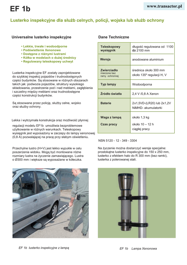 www.transactor.pl EF 1b Lusterko inspekcyjne dla słuŜb celnych, policji, wojska lub słuŜb ochrony Universalne lusterko inspekcyjne • Lekkie, trwałe i wodoodporne • Podświetlenie Xenonowe • Dostępne z róŜnymi lustrami • Kółka w modelach o duŜej średnicy • Regulowany teleskopowy uchwyt Lusterka inspekcyjne EF zostały zaprojektowane do szybkiej inspekcj pojazdów i trudnodostępnych części budynków. Są stosowane w róŜnych obszarach takich jak: podwozia pojazdów, struktury wysokiego składowania, przestrzenie pod i nad meblami, zagłębienia i szczeliny między meblami oraz trudnodostępne części konstrukcji budynków. Są stosowane przez policję, słuŜby celne, wojsko oraz słuŜby ochrony. Dane Techniczne Teleskopowy wysięgnik długość regulowana od 1100 do 2100 mm Wersja anodowane aluminium Zwierciadło średnica około 300 mm mierzone bez ramy ochronnej około 135º regulacji H, V Typ lampy Wodoodporna Źródło światła 2,4 V /0,8 A Xenon Baterie 2x1,5VD-(LR20) lub 2x1,2V NiMHD- akumulatorki Waga z lampą około 1,3 kg Czas pracy około 10 – 12 h ciągłej pracy Lekka i wytrzymała konstrukcja oraz moŜliwość płynnej regulacji modelu EF1b umoŜliwia bezproblemowe uŜytkowanie w róŜnych warunkach. Teleskopowy wysięgnik jest wyposaŜony w zaczepy do lampy xenonowej (0,8 A) pozwalającej na pracę przy słabym oświetleniu. NSN 5120 - 12 - 349 - 3304 Przechylne lustro (H+V) jest lekko wypukłe w celu poszerzenia widoku. Mogą być montowane róŜne rozmiary lustra na Ŝyczenie zamawiającego. Lustra o Ø300 mm i większe są wyposaŜane w kółeczka. EF 1b lusterko inspekcyjne z lampą Na Ŝyczenie moŜna dostarczyć wersje specjalne: prostokątne lusterko inspekcyjne do 150 x 250 mm, lusterko z efektem halo do R 300 mm (bez ramki), lusterka z polerowanej stali. EF 1b Lampa Xenonowa