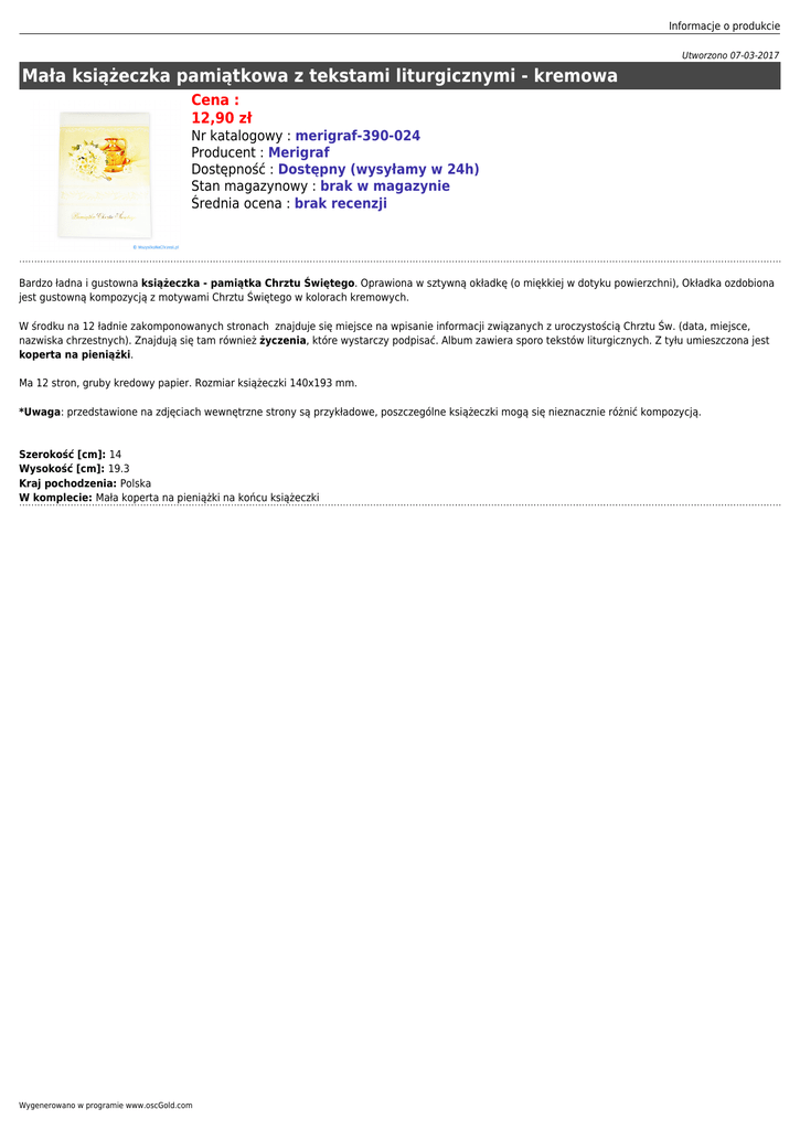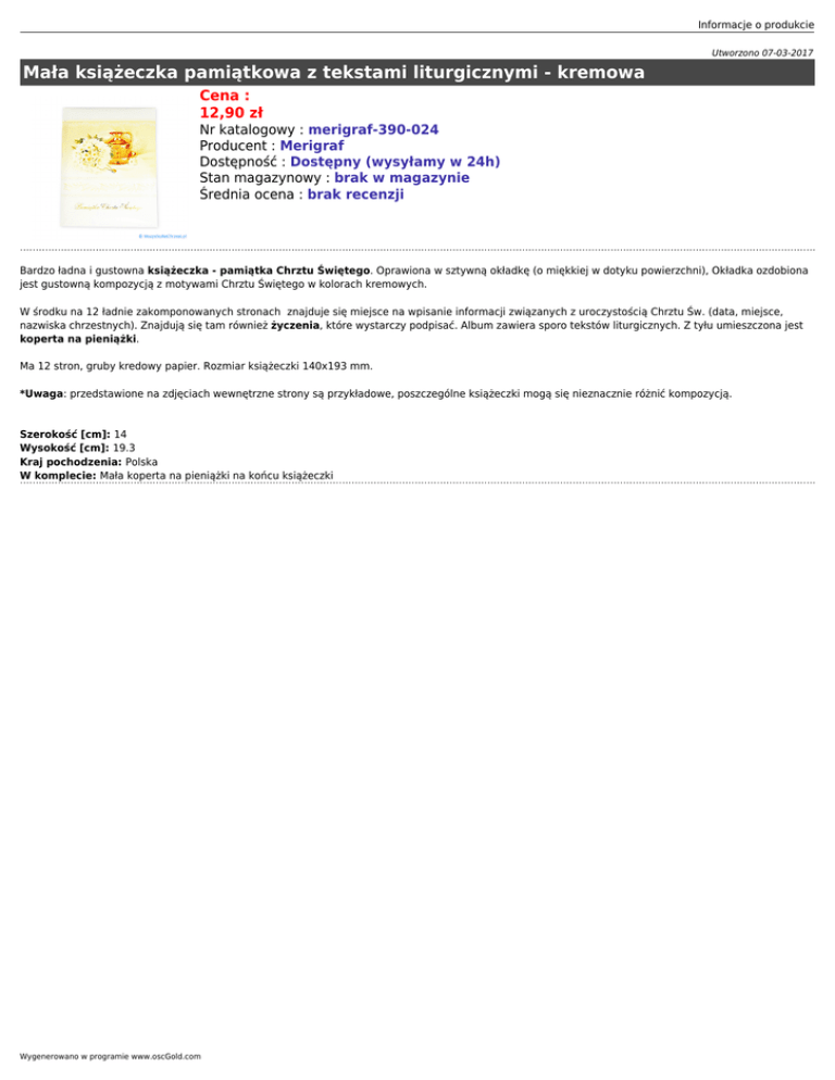 Informacje o produkcie Utworzono 07-03-2017 Mała książeczka pamiątkowa z tekstami liturgicznymi - kremowa Cena : 12,90 zł Nr katalogowy : merigraf-390-024 Producent : Merigraf Dostępność : Dostępny (wysyłamy w 24h) Stan magazynowy : brak w magazynie Średnia ocena : brak recenzji Bardzo ładna i gustowna książeczka - pamiątka Chrztu Świętego. Oprawiona w sztywną okładkę (o miękkiej w dotyku powierzchni), Okładka ozdobiona jest gustowną kompozycją z motywami Chrztu Świętego w kolorach kremowych. W środku na 12 ładnie zakomponowanych stronach znajduje się miejsce na wpisanie informacji związanych z uroczystością Chrztu Św. (data, miejsce, nazwiska chrzestnych). Znajdują się tam również życzenia, które wystarczy podpisać. Album zawiera sporo tekstów liturgicznych. Z tyłu umieszczona jest koperta na pieniążki. Ma 12 stron, gruby kredowy papier. Rozmiar książeczki 140x193 mm. *Uwaga: przedstawione na zdjęciach wewnętrzne strony są przykładowe, poszczególne książeczki mogą się nieznacznie różnić kompozycją. Szerokość [cm]: 14 Wysokość [cm]: 19.3 Kraj pochodzenia: Polska W komplecie: Mała koperta na pieniążki na końcu książeczki Wygenerowano w programie www.oscGold.com