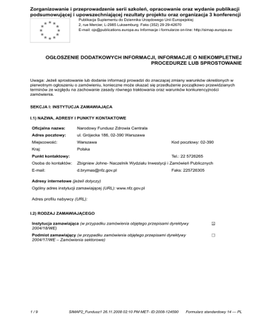 Zorganizowanie i przeprowadzenie serii szkoleń, opracowanie oraz wydanie publikacji podsumowującej i upowszechniającej rezultaty projektu oraz organizacja 3 konferencji Publikacja Suplementu Dziennika Urzędowego Unii Europejskiej w ramach projektu „Szkolenia kadry do zarządzającej szpitali, posiadających umowę 2, rue Mercier, L-2985 Luksemburg Faks (352) 29 29-42670 wojewódzkim o udzielenie świadczeń opieki zdrowotnej zawartą z oddziałem E-mail: [email protected] Informacje i formularze on-line: http://simap.europa.eu Narodowego Funduszu Zdrowia albo udzielających świadczeń zdrowotnych finansowanych ze środków publicznych na podstawie innych tytułów oraz dysponentów środków publicznych w sektorze ochrony zdrowia tj. kadry zarządzającej NFZ”,zwanego dalej Projektem JGP, współfinansowanego z Europejskiego Funduszu Społecznego. OGŁOSZENIE DODATKOWYCH INFORMACJI, INFORMACJE O NIEKOMPLETNEJ PROCEDURZE LUB SPROSTOWANIE Uwaga: Jeżeli sprostowanie lub dodanie informacji prowadzi do znaczącej zmiany warunków określonych w pierwotnym ogłoszeniu o zamówieniu, konieczne może okazać się przedłużenie początkowo przewidzianych terminów ze względu na zachowanie zasady równego traktowania oraz warunków konkurencyjności zamówienia. SEKCJA I: INSTYTUCJA ZAMAWIAJĄCA I.1) NAZWA, ADRESY I PUNKTY KONTAKTOWE Oficjalna nazwa: Narodowy Fundusz Zdrowia Centrala Adres pocztowy: ul. Grójecka 186, 02-390 Warszawa Miejscowość: Warszawa Kraj: Polska Punkt kontaktowy: _____________________________________________ Tel.: 22 5726265 Osoba do kontaktów: Zbigniew Johne- Naczelnik Wydziału Inwestycji i Zamówień Publicznych E-mail: [email protected] Kod pocztowy: 02-390 Faks: 225726305 Adresy internetowe (jeżeli dotyczy) Ogólny adres instytucji zamawiającej (URL): www.nfz.gov.pl Adres profilu nabywcy (URL): ________________________________________ I.2) RODZAJ ZAMAWIAJĄCEGO Instytucja zamawiająca (w przypadku zamówienia objętego przepisami dyrektywy 2004/18/WE) Podmiot zamawiający (w przypadku zamówienia objętego przepisami dyrektywy 2004/17/WE – Zamówienia sektorowe) 1/9 SIMAP2_Fundusz1 26.11.2008 02:10 PM MET- ID:2008-124590 Formularz standardowy 14 — PL Zorganizowanie i przeprowadzenie serii szkoleń, opracowanie oraz wydanie publikacji podsumowującej i upowszechniającej rezultaty projektu oraz organizacja 3 konferencji w ramach projektu „Szkolenia kadry zarządzającej szpitali, posiadających umowę SEKCJA II: PRZEDMIOT ZAMÓWIENIA o udzielenie świadczeń opieki zdrowotnej zawartą z oddziałem wojewódzkim II.1) OPIS Narodowego Funduszu Zdrowia albo udzielających świadczeń zdrowotnych finansowanych zezamówieniu środków publicznych podstawie innych tytułów oraz II.1.1) Nazwa nadana przez instytucjęna zamawiającą (podano w pierwotnym ogłoszeniu) dysponentów środków publicznych w sektorze ochrony zdrowia tj. kadry zarządzającej Zorganizowanie i przeprowadzenie serii szkoleń, opracowanie oraz wydanie publikacji podsumowującej i NFZ”,zwanego dalej Projektem JGP, współfinansowanego z Europejskiego upowszechniającej rezultaty projektu oraz organizacja 3 konferencji w ramach projektu „SzkoleniaFunduszu kadry zarządzającej szpitali, posiadających umowę o udzielenie świadczeń opieki zdrowotnej zawartą z oddziałem Społecznego. wojewódzkim Narodowego Funduszu Zdrowia albo udzielających świadczeń zdrowotnych finansowanych ze środków publicznych na podstawie innych tytułów oraz dysponentów środków publicznych w sektorze ochrony zdrowia tj. kadry zarządzającej NFZ”,zwanego dalej Projektem JGP, współfinansowanego z Europejskiego Funduszu Społecznego. II.1.2) Krôtki opis (podano w pierwotnym ogłoszeniu) Opracowanie szczegółowej koncepcji oraz treści programowych szkoleń, przeprowadzenie serii szkoleń, opracowanie i wydanie publikacji podsumowującej i upowszechniającej rezultaty projektu oraz opracowanie szczegółowej koncepcji i organizacja 3 konferencji w ramach projektu „Szkolenia kadry zarządzającej szpitali, posiadających umowę o udzielenie świadczeń opieki zdrowotnej zawartą z oddziałem wojewódzkim Narodowego Funduszu Zdrowia albo udzielające świadczeń zdrowotnych finansowanych ze środków publicznych na podstawie innych tytułów oraz dysponentów środków publicznych w sektorze ochrony zdrowia tj. kadry zarządzającej NFZ”, zwanego dalej Projektem JGP współfinansowanego z Europejskiego Funduszu Społecznego. Zadaniem Wykonawcy jest realizacja zamówienia składającego się z następujących części : I CZĘŚĆ – OPRACOWANIE SZCZEGÓŁOWEJ KONCEPCJI ORAZ TREŚCI PROGRAMOWYCH SZKOLEŃ I PRZEPROWADZENIE SZKOLEŃ DLA minimum 200 PRACOWNIKÓW NFZ II CZĘŚĆ – OPRACOWANIE SZCZEGÓŁOWEJ KONCEPCJI ORAZ TREŚCI PROGRAMOWYCH SZKOLEŃ I PRZEPROWADZENIE SZKOLEŃ DLA minimum 1300 ŚWIADCZENIODAWCÓW III CZĘŚĆ – OPRACOWANIE ORAZ WYDANIE PUBLIKACJI PODSUMOWUJĄCEJ I UPOWSZECHNIAJĄCEJ REZULTATY PROJEKTU IV CZĘŚĆ – OPRACOWANIE SZCZEGÓŁOWEJ KONCEPCJI ORAZ ORGANIZACJA 3 KONFERENCJI (konferencji otwierającej, upowszechniającej efekty projektu oraz konferencji podsumowującej) Cykl szkoleń zainicjowany zostanie w grudniu 2008 roku lub na początku 2009 roku i realizowany będzie do końca 2010 roku. Szkolenia, publikacja oraz konferencje poświęcone będą konkretnej tematyce związanej z użytkowaniem i wykorzystaniem nowego systemu rozliczeniowego JGP do poprawy efektywności zarządzania w ochronie zdrowia, jakości dokumentacji medycznej, w szczególności sposobu kodowania rozpoznań i procedur medycznych, prawidłowości grupowania (klasyfikowania) zakończonych i sprawozdanych hospitalizacji pacjentów do odpowiednich grup JGP, stosowania wskaźników oceny, planowania rezultatu oraz potencjału i zużycia zasobów. Celem szkoleń będzie zbudowanie kompetencji kadry zarządzającej NFZ w zakresie tworzenia i utrzymania systemu JGP, wykorzystania systemu JGP d