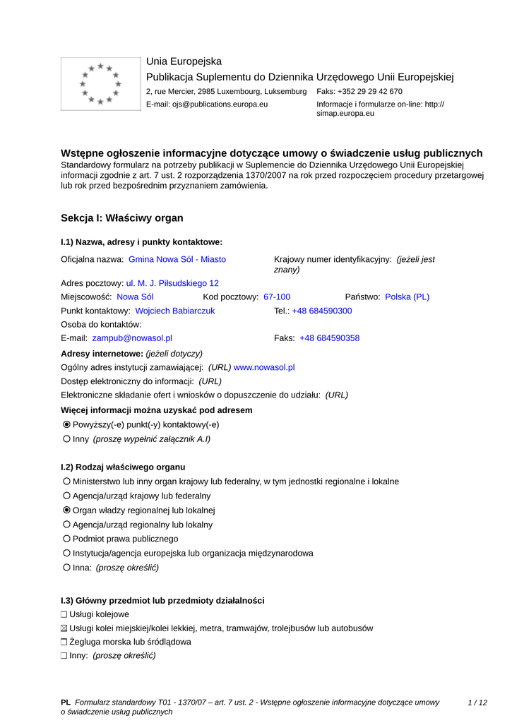 Unia Europejska Publikacja Suplementu do Dziennika Urzędowego Unii Europejskiej 2, rue Mercier, 2985 Luxembourg, Luksemburg Faks: +352 29 29 42 670 E-mail: [email protected] Informacje i formularze on-line: http:// simap.europa.eu Wstępne ogłoszenie informacyjne dotyczące umowy o świadczenie usług publicznych Standardowy formularz na potrzeby publikacji w Suplemencie do Dziennika Urzędowego Unii Europejskiej informacji zgodnie z art. 7 ust. 2 rozporządzenia 1370/2007 na rok przed rozpoczęciem procedury przetargowej lub rok przed bezpośrednim przyznaniem zamówienia. Sekcja I: Właściwy organ I.1) Nazwa, adresy i punkty kontaktowe: Oficjalna nazwa: Gmina Nowa Sól - Miasto Krajowy numer identyfikacyjny: (jeżeli jest znany) _____ Adres pocztowy: ul. M. J. Piłsudskiego 12 Miejscowość: Nowa Sól Kod pocztowy: 67-100 Punkt kontaktowy: Wojciech Babiarczuk Państwo: Polska (PL) Tel.: +48 684590300 Osoba do kontaktów: _____ E-mail: [email protected] Faks: +48 684590358 Adresy internetowe: (jeżeli dotyczy) Ogólny adres instytucji zamawiającej: (URL) www.nowasol.pl Dostęp elektroniczny do informacji: (URL) _____ Elektroniczne składanie ofert i wniosków o dopuszczenie do udziału: (URL) _____ Więcej informacji można uzyskać pod adresem Powyższy(-e) punkt(-y) kontaktowy(-e) Inny (proszę wypełnić załącznik A.I) I.2) Rodzaj właściwego organu Ministerstwo lub inny organ krajowy lub federalny, w tym jednostki regionalne i lokalne Agencja/urząd krajowy lub federalny Organ władzy regionalnej lub lokalnej Agencja/urząd regionalny lub lokalny Podmiot prawa publicznego Instytucja/agencja europejska lub organizacja międzynarodowa Inna: (proszę określić) I.3) Główny przedmiot lub przedmioty działalności Usługi kolejowe Usługi kolei miejskiej/kolei lekkiej, metra, tramwajów, trolejbusów lub autobusów Żegluga morska lub śródlądowa Inny: (proszę określić) PL Formularz standardowy T01 - 1370/07 – art. 7 ust. 2 - Wstępne ogłoszenie informacyjne dotyczące umowy o świadczenie usług publicznych 1 / 12 I.4) Udzielenie zamówienia w imieniu innych właściwych organów Właściwy organ dokonuje zakupu w imieniu innych właściwych organów: tak nie (jeżeli tak, więcej informacji o tych właściwych organach można podać w załączniku A.II) PL Formularz standardowy T01 - 1370/07 – art. 7 ust. 2 - Wstępne ogłoszenie informacyjne dotyczące umowy o świadczenie usług publicznych 2 / 12 Sekcja II: Przedmiot zamówienia II.1) Opis: II.1.1) Nazwa nadana zamówieniu: Transport drogowy – przewozy autobusowe w publicznym transporcie zbiorowym na sieci komunikacyjnej obejmującej obszar Gmin: Kolsko, Kożuchów, Nowa Sól, Nowa Sól – Miasto, Otyń i Siedlisko. II.1.2) Rodzaj zamówienia, dziedzina(-y), której(-ych) dotyczą usługi transportu publicznego: Kategoria usług: nr: T-05 (Zob. kategorie usług w załączniku B) Dziedziny, których dotyczą usługi transportu publicznego: Transport drogowy Kod NUTS: PL432 II.1.3) Krótki opis zamówienia: Transport drogowy – przewozy autobusowe w publicznym transporcie zbiorowym na sieci komunikacyjnej obejmującej obszar Gmin: Kolsko, Kożuchów, Nowa Sól, Nowa Sól – Miasto, Otyń i Siedlisko. Szacowana wielkość pracy przewozowej: ok. 1.090.000 wozokilometrów rocznie. II.1.4) Wspólny Słownik Zamówień (CPV) Główny przedmiot Słownik główny 60112000 Słownik uzupełniający (jeżeli dotyczy) II.1.5) Informacje na temat podwykonawstwa Przewidywane jest zlecenie podwykonawstwa: tak nie (jeżeli tak) Wartość lub część zamówienia, które prawdopodobnie będzie zlecone stronom trzecim: minimalny procent: _____ (%), maksymalny procent: _____ (%) wartości zamówienia albo Nieznana Krótki opis wartości/części zamówienia, które będzie zlecone podwykonawcom: _____ II.2) Ilość i/lub wartość usług Opis: _____ km usług publicznych w zakresie transportu pasażerskiego: _____ Szacunkowy koszt bez VAT: (proszę podać wyłącznie dane liczbowe) _____ albo Zakres: między _____ i _____ Waluta: Waluta: II.3) Planowana data rozpoczęcia i czas trwania zamówienia lub termin realizacji Rozpoczęcie: 01/07/2018 (dd/mm/rrrr) Okres w miesiącach: 120 albo w dniach: _____ (od udzielenia zamówienia) PL Formularz standardowy T01 - 1370/07 – art. 7 ust. 2 - Wstępne ogłoszenie informacyjne dotyczące umowy o świadczenie usług publicznych 3 / 12 Sekcja III: Informacje o charakterze prawnym, ekonomicznym, finansowym i technicznym III.1) Warunki dotyczące zamówienia: III.1.1) Parametry kosztów w celu obliczenia rekompensaty: _____ III.1.2) Informacje o wyłącznych prawach: Przyznano wyłączne prawa tak nie (jeżeli tak) Wyszczególnienie przyznanych wyłącznych praw: _____ III.1.3) Podział przychodów ze sprzedaży biletów: Odsetek przydzielony podmiotowi świadczącemu usługi publiczne: _____ (%) (uznaje się, że pozostała część jest przyznawana właściwemu organowi) III.1.4) Standardy socjalne: (przejęcie personelu zgodnie z dyrektywą 2001/23/WE) Wykaz wymaganych standardów (w tym lista pracowników, których to dotyczy, szczegółowe informacje na temat umownych praw i zobowiązań pracowników oraz warunków, na jakich pracowników uznaje się za związanych ze świadczonymi usługami): _____ III.1.5) Zobowiązania do świadczenia usług publicznych: Wyszczególnienie: _____ III.1.6) Inne szczególne warunki: Wykonanie zamówienia podlega szczególnym warunkom (jeżeli tak) Opis szczególnych warunków: _____ tak nie III.2) Warunki udziału: III.2.1) Zdolność ekonomiczna i finansowa: Informacje i formalności konieczne do dokonania oceny Minimalny poziom ewentualnie wymaganych spełniania wymogów: standardów: _____ _____ III.2.2) Wymagania techniczne: Informacje i formalności konieczne do dokonania oceny Minimalny poziom ewentualnie wymaganych spełniania wymogów: standardów: _____ _____ III.3) Cele w zakresie jakości dla umów o usługi: Opis: _____ Informacje i bilet